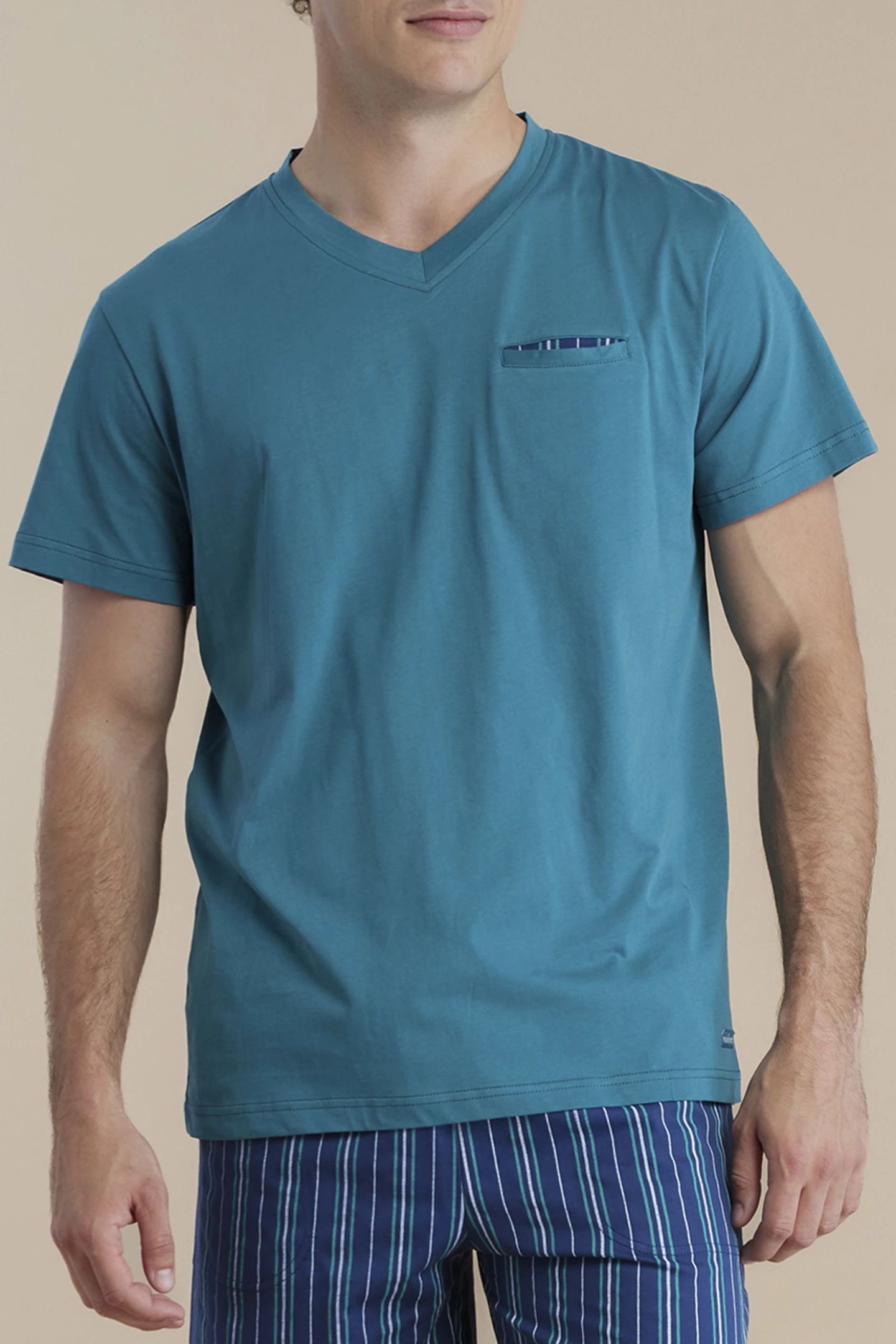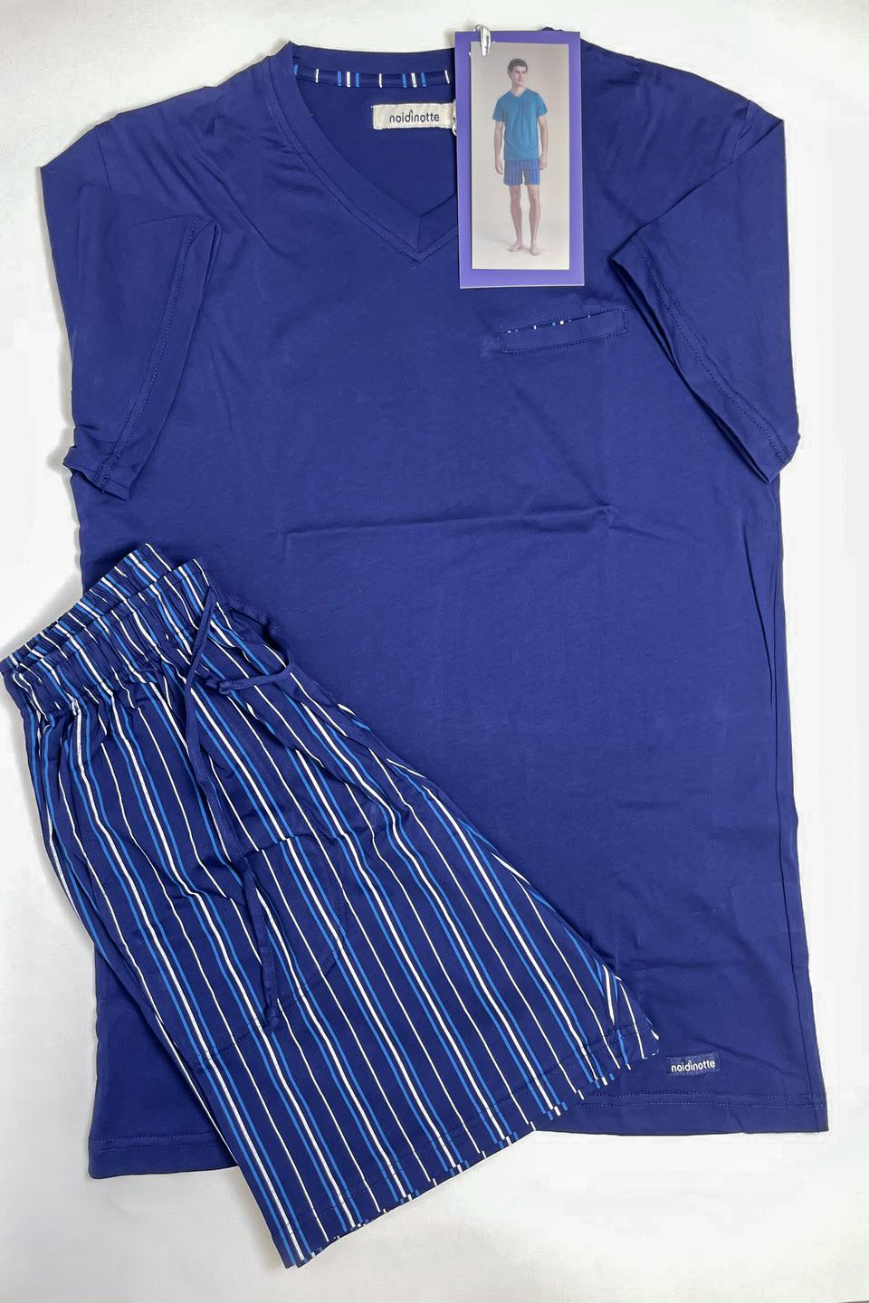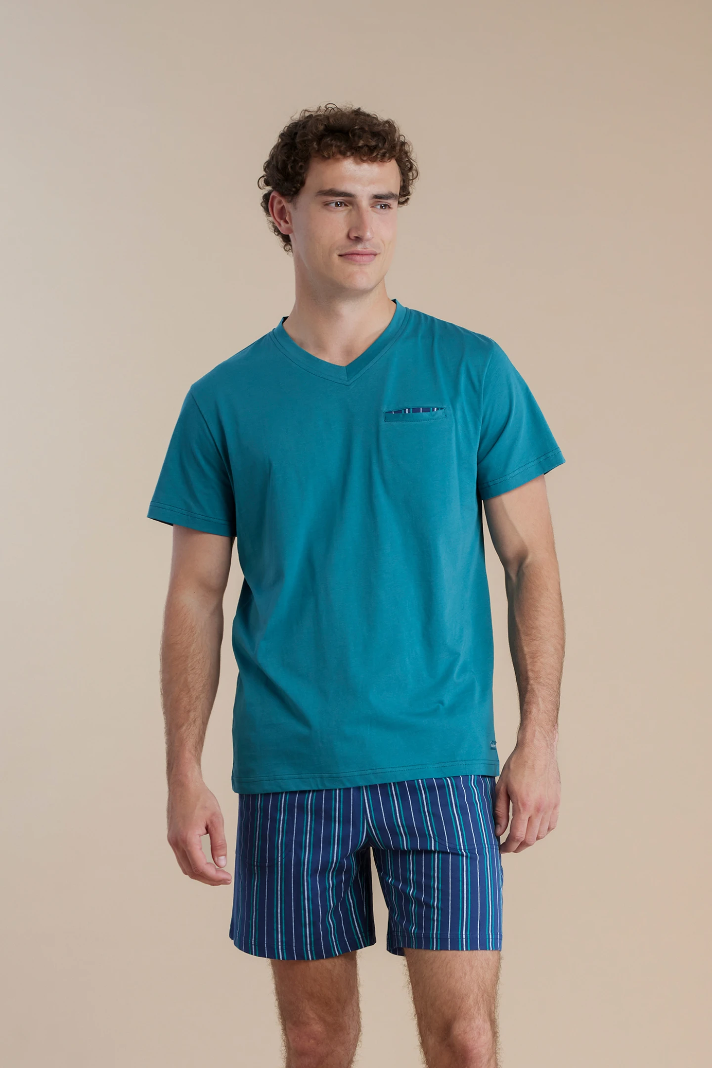 Pigiama uomo in 100% cotone calibrato, composto da top con scollo a V e taschino, e pantaloni corti con fantasia a righe. Un mix perfetto di comfort e stile per le serate estive più rilassanti.