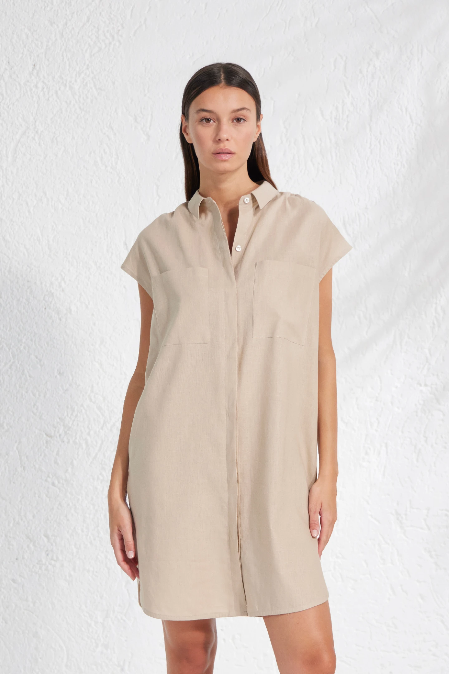 Leggero e fresco, questo abito camicia in lino e viscosa accarezza la pelle con naturalezza. La linea morbida e la leggerezza del tessuto lo rendono perfetto per le giornate di sole, mentre il collo a camicia e l’abbottonatura centrale aggiungono un tocco di stile senza tempo.