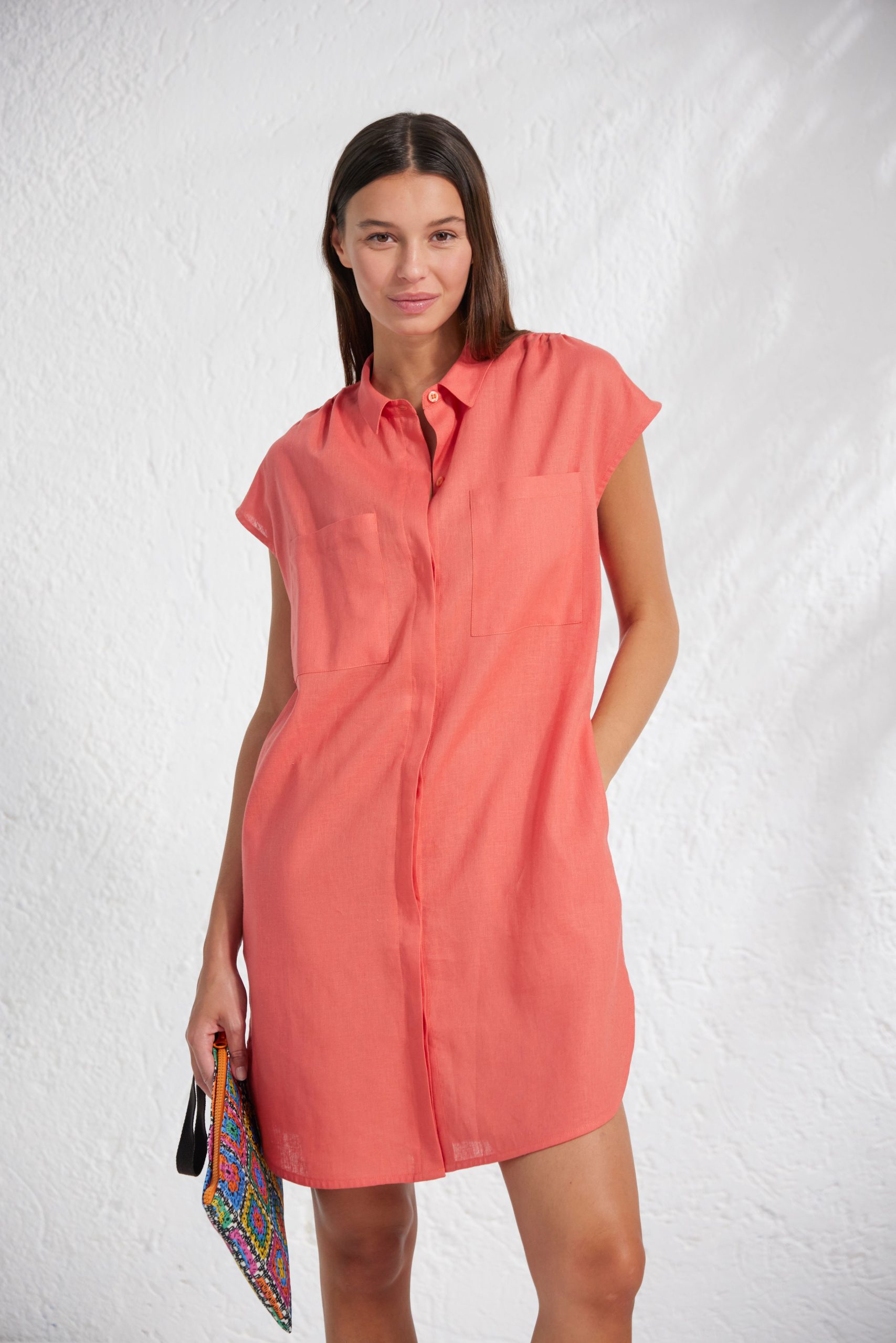 Leggero e fresco, questo abito camicia in lino e viscosa accarezza la pelle con naturalezza. La linea morbida e la leggerezza del tessuto lo rendono perfetto per le giornate di sole, mentre il collo a camicia e l’abbottonatura centrale aggiungono un tocco di stile senza tempo.
