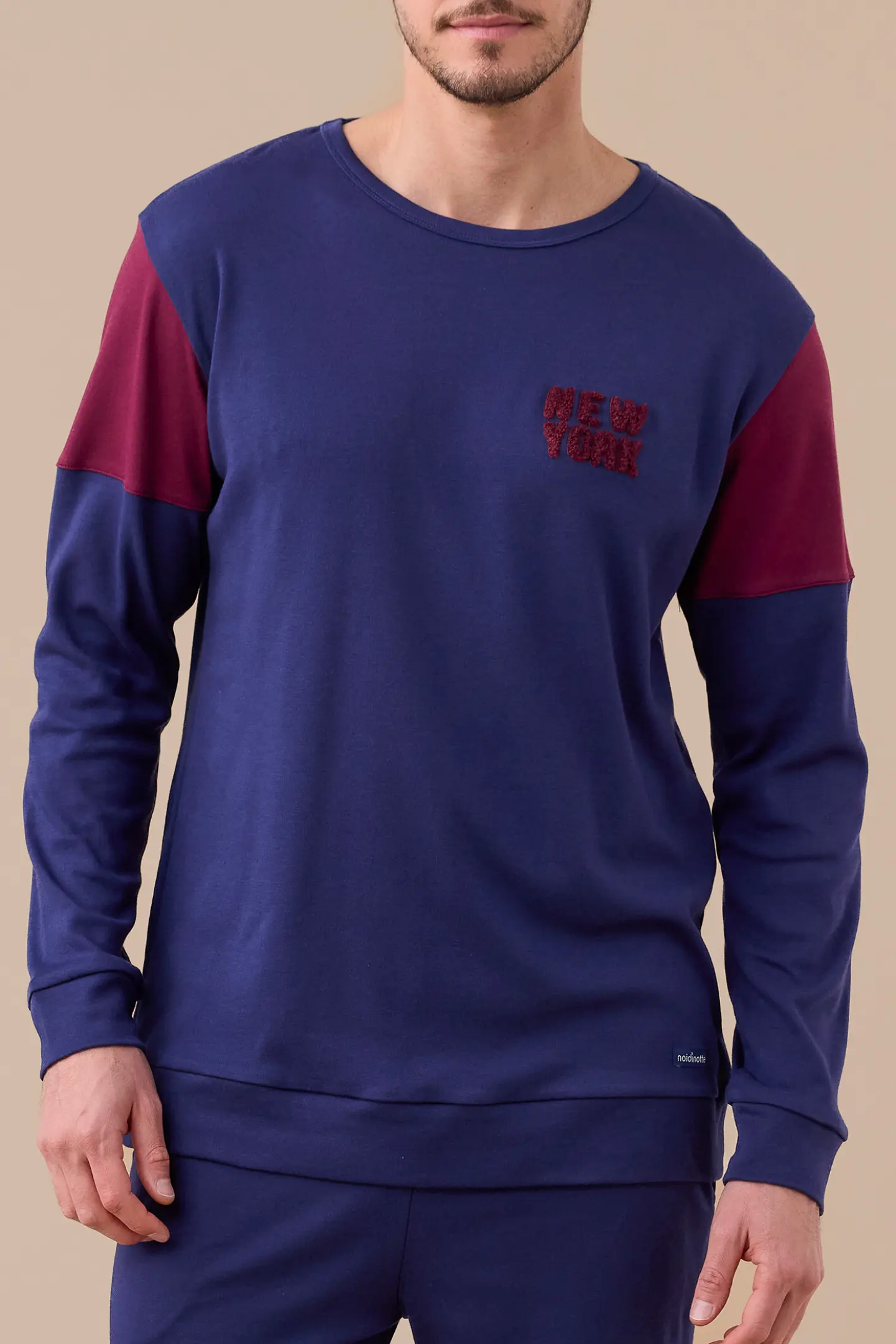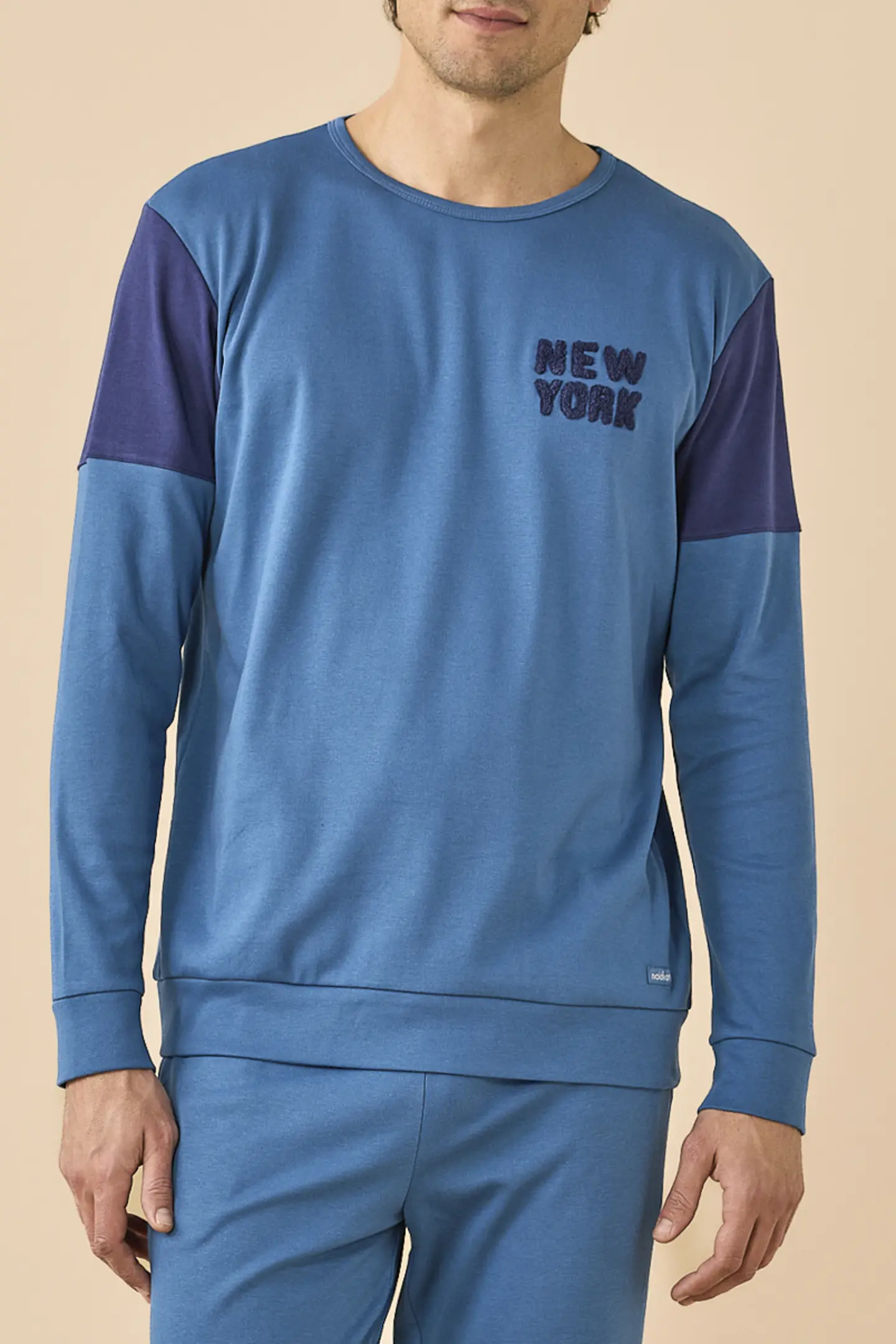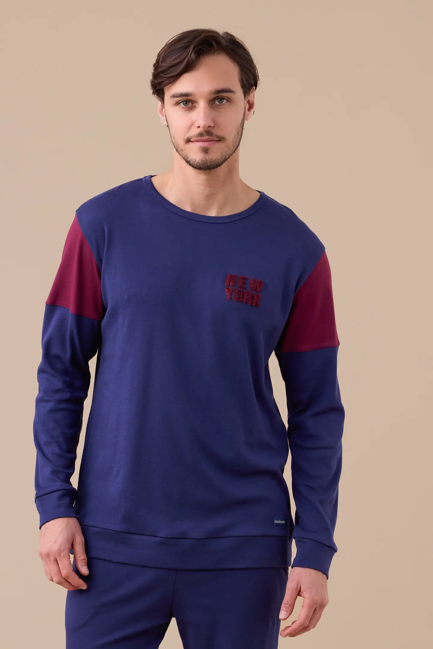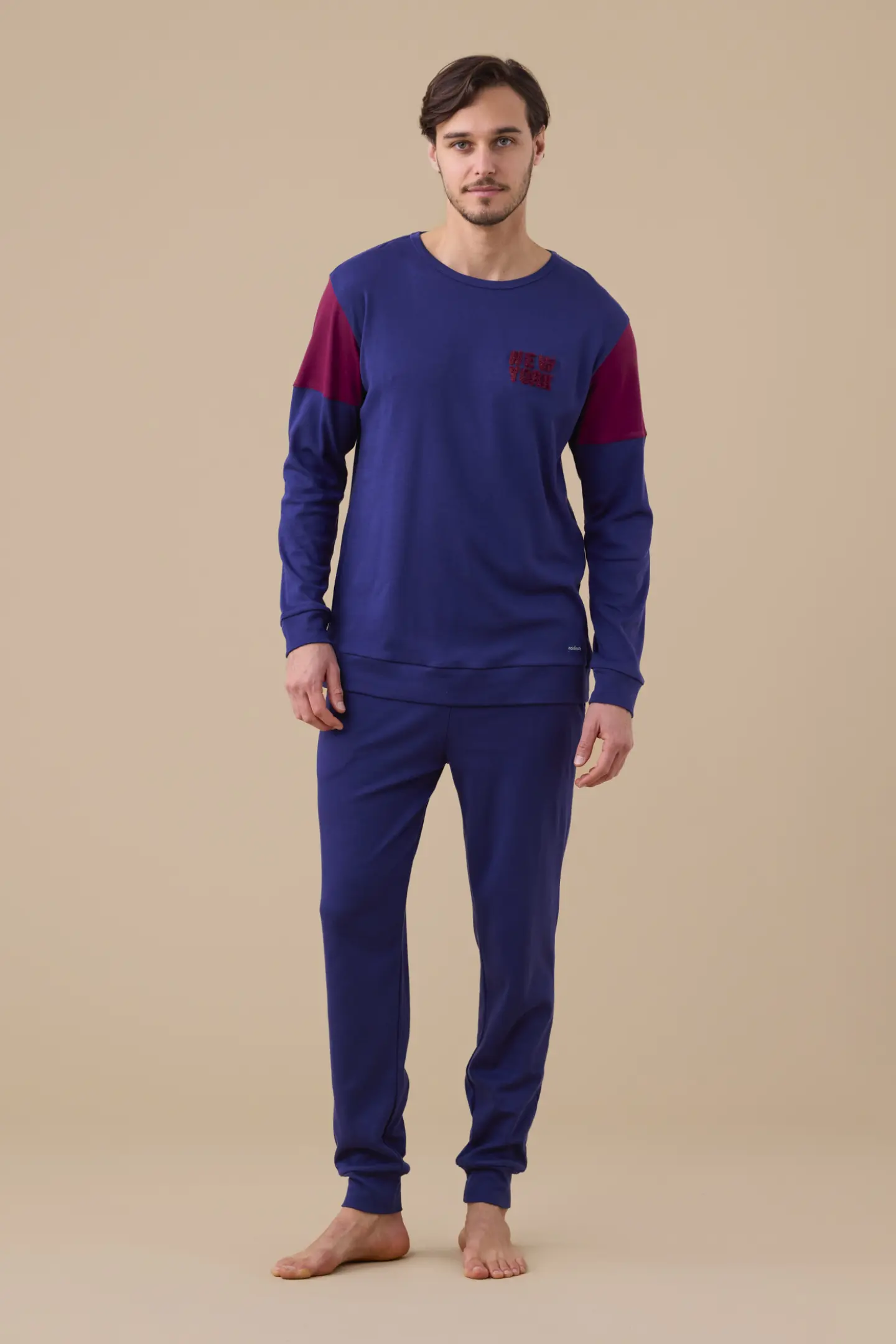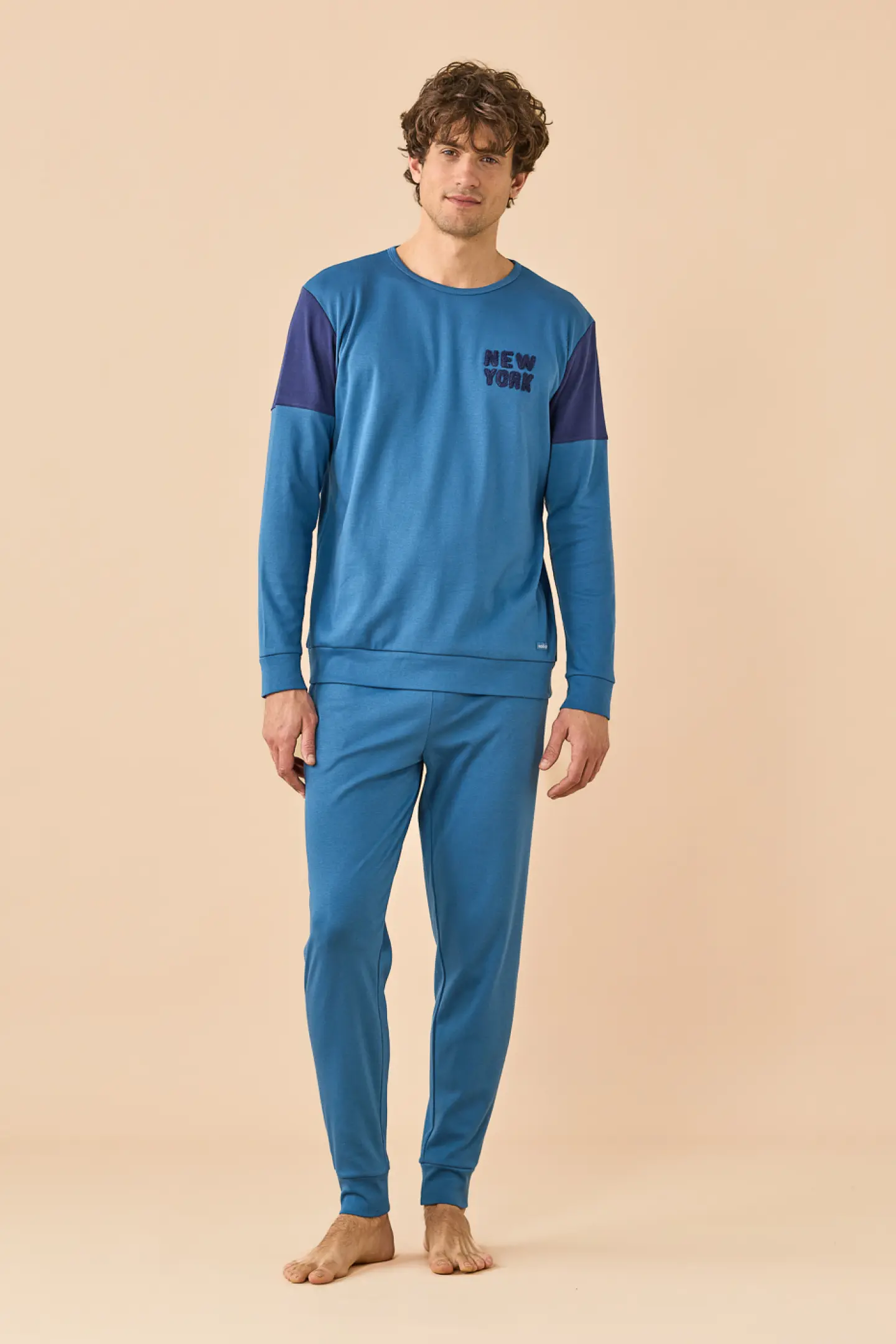 Pigiama uomo in caldo cotone, top di colore unito girocollo con applicazione e pantaloni di colore unito con polsino.