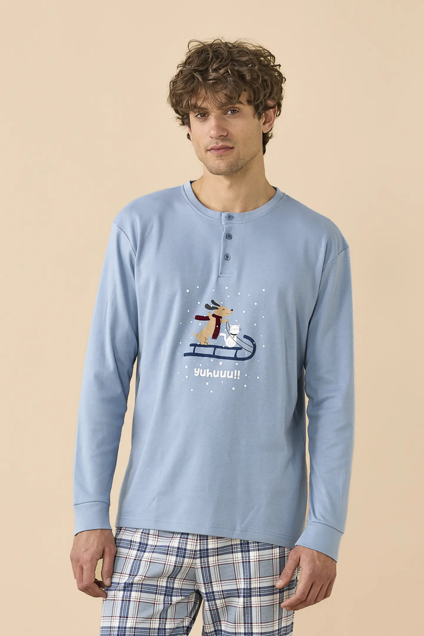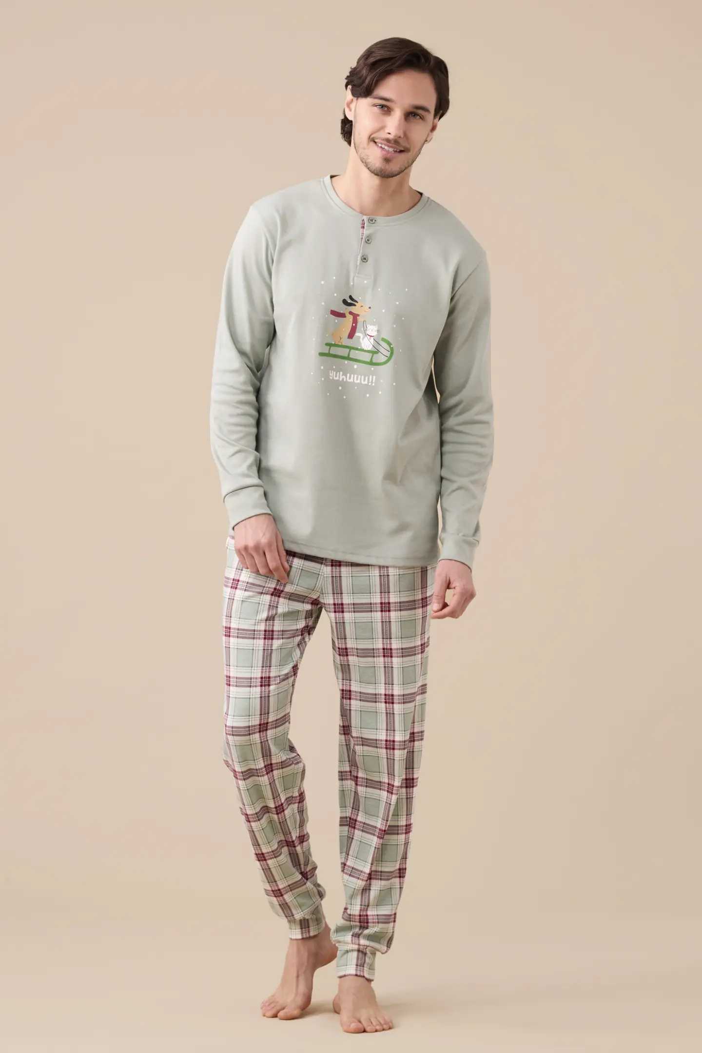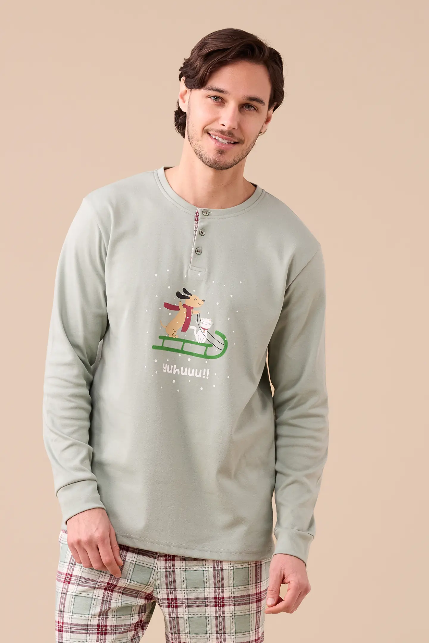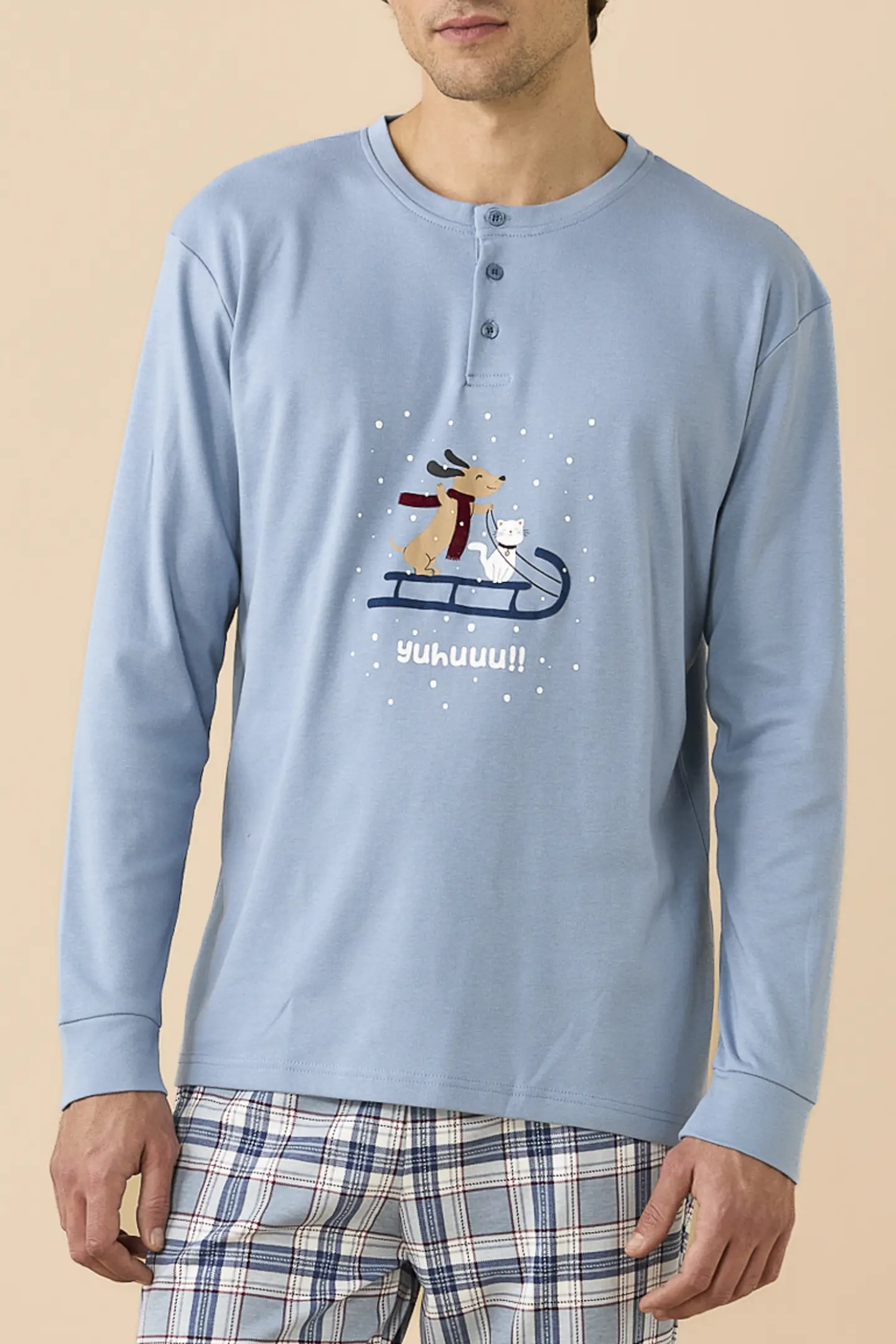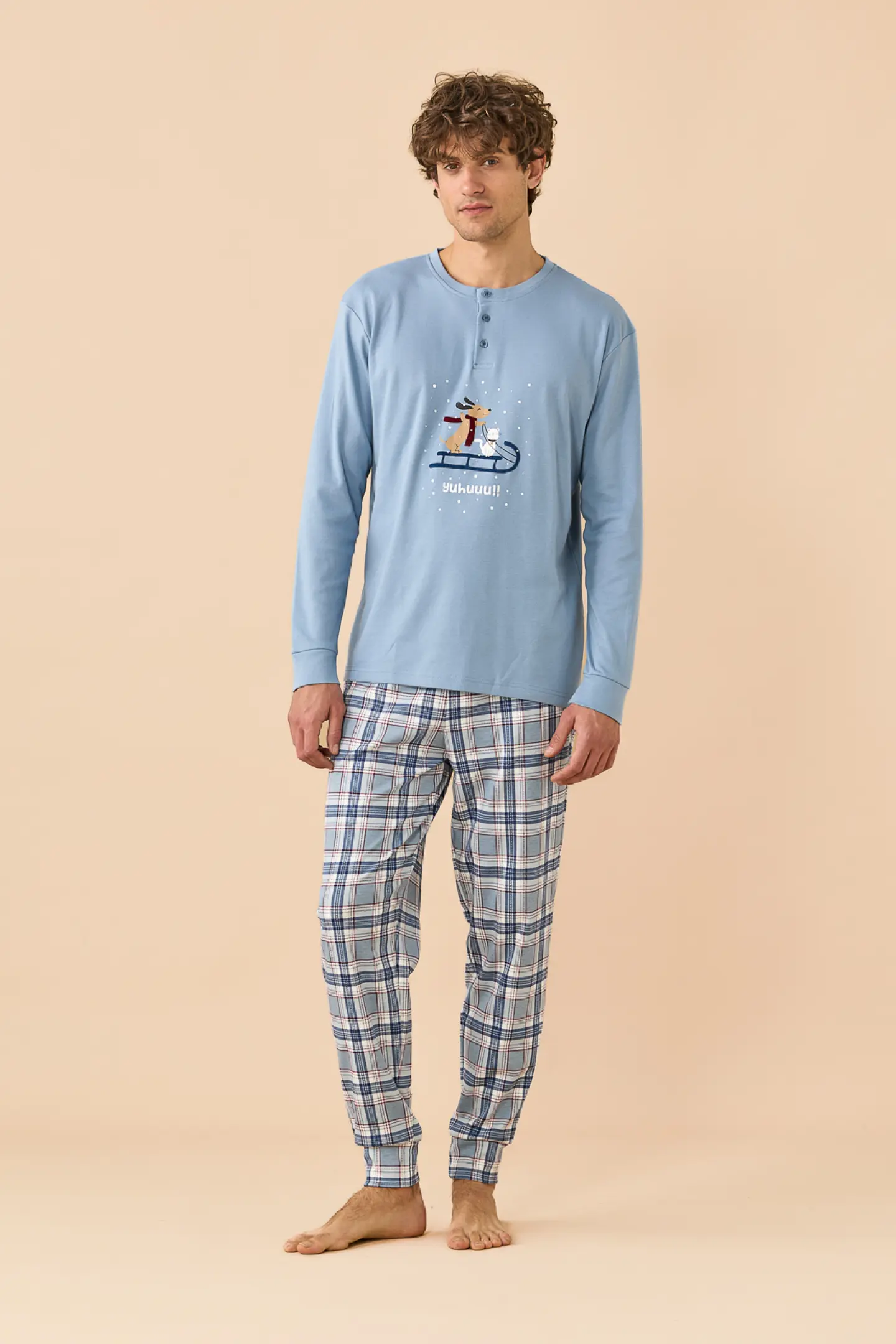 Pigiama uomo in caldo cotone, collo a tre bottoni con stampa slitta e pantaloni in stampa scozzese con polsini.