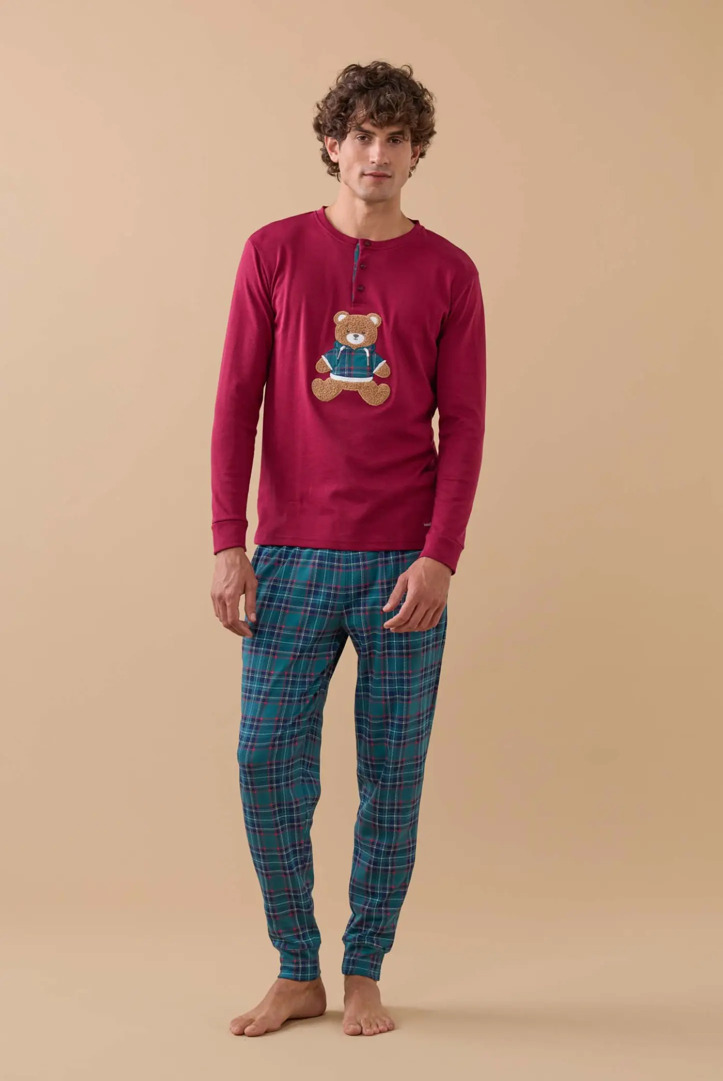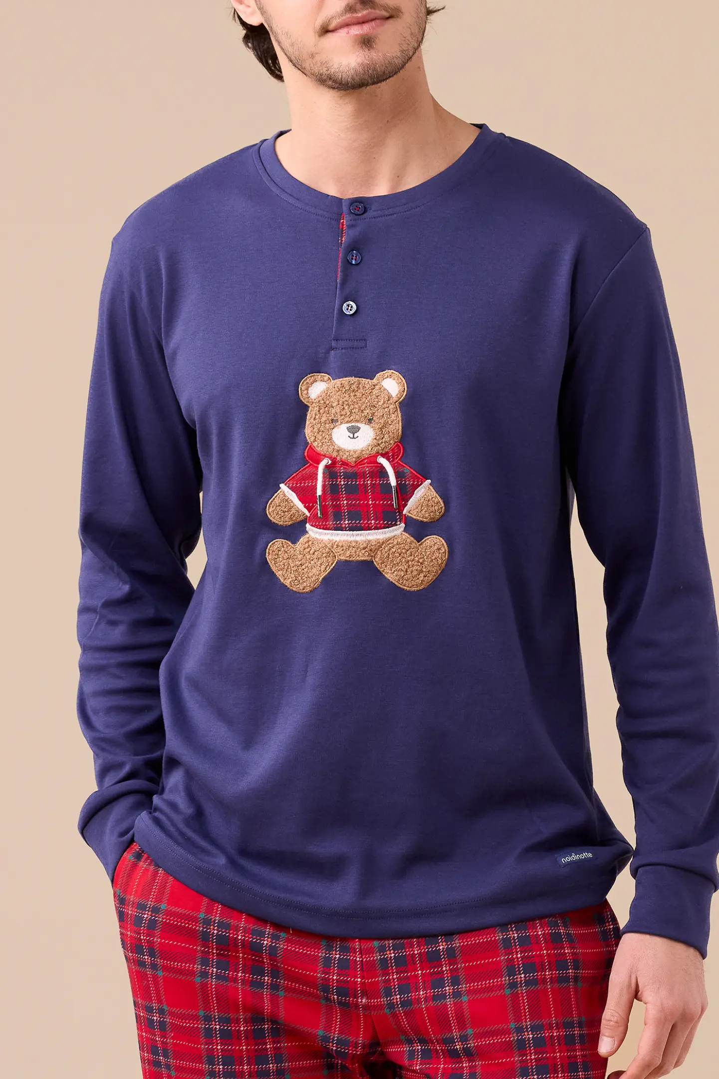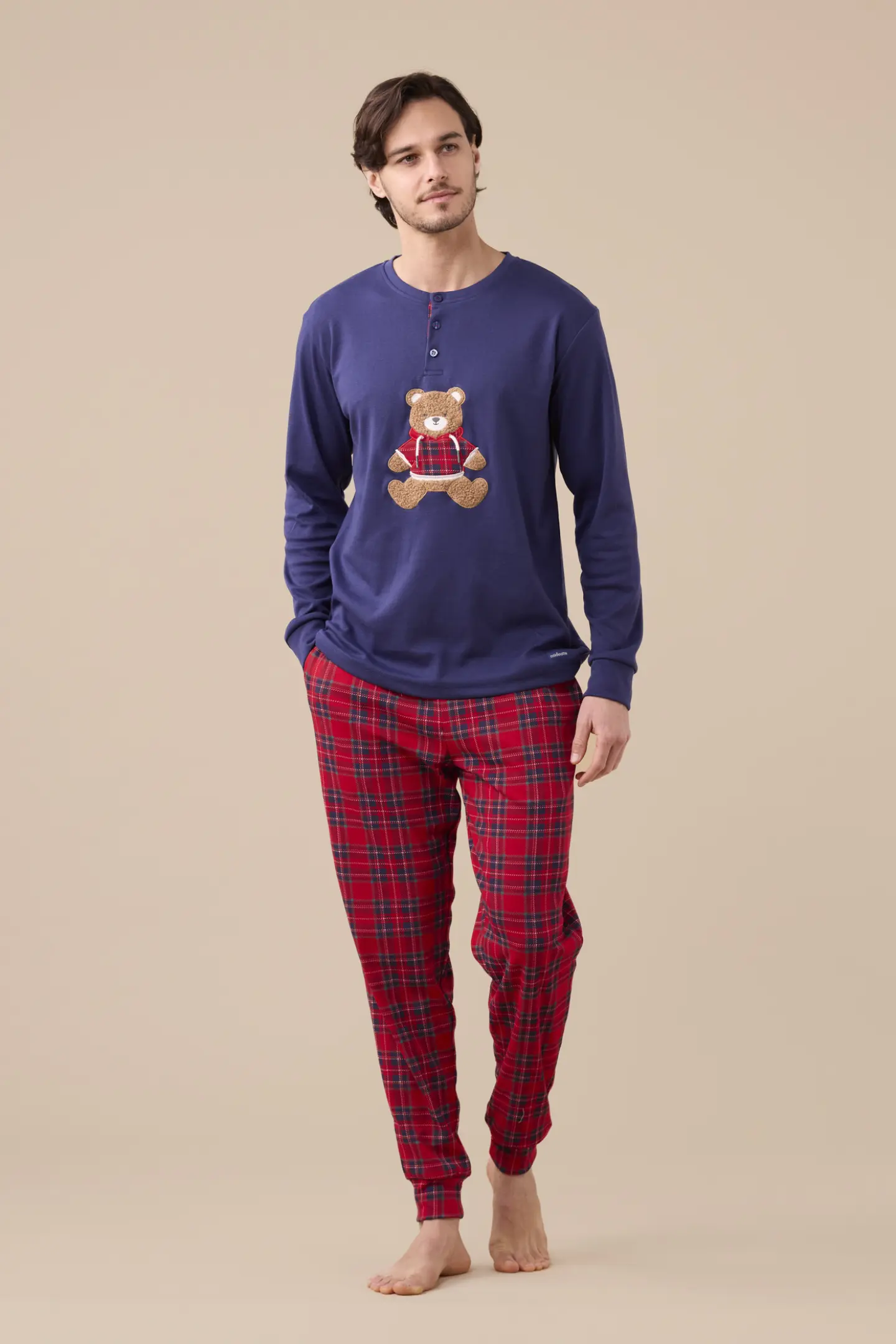 Pigiama uomo in caldo cotone, top a collo tre bottoni con applicazione orso e pantaloni in stampa scozzese con polsini.