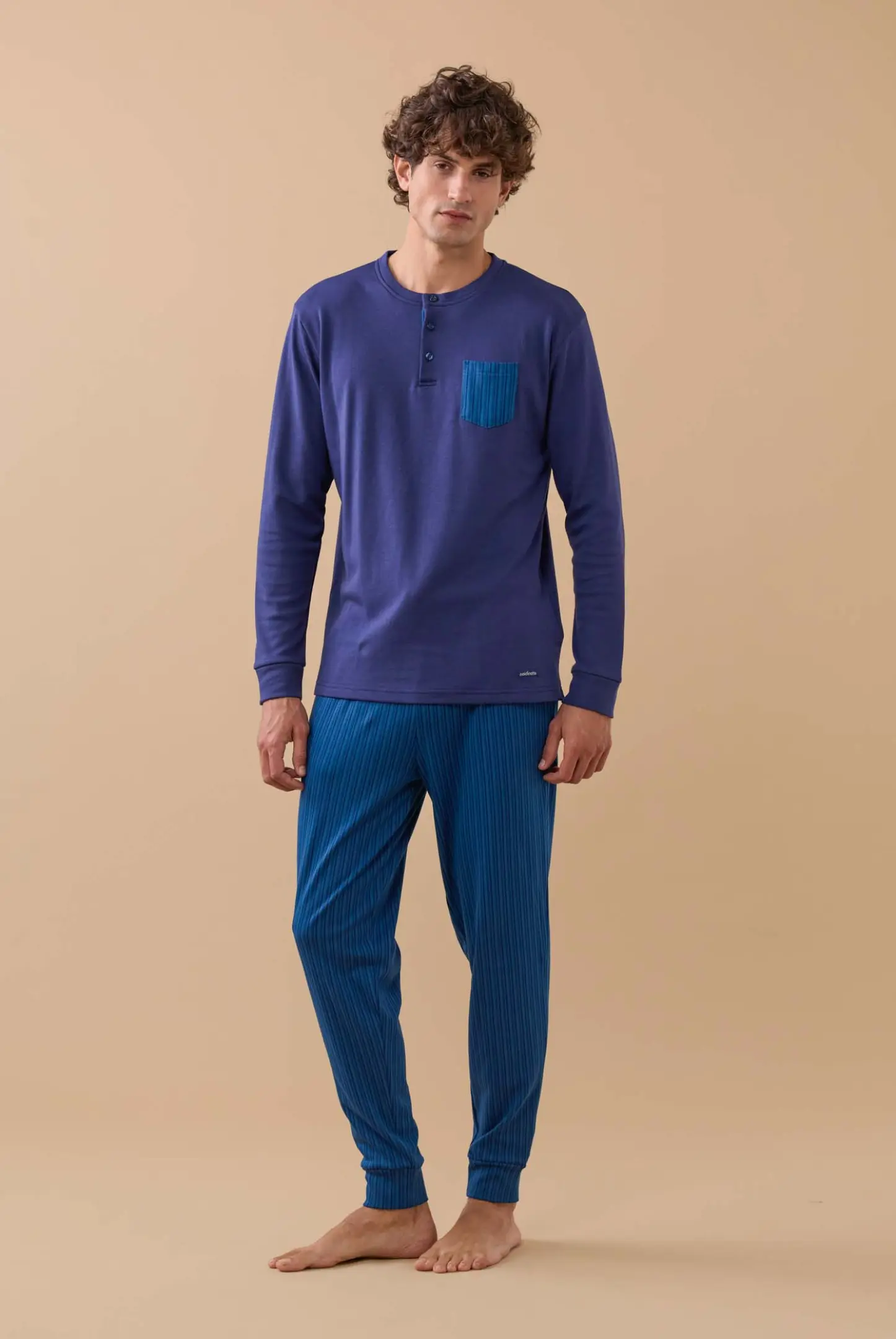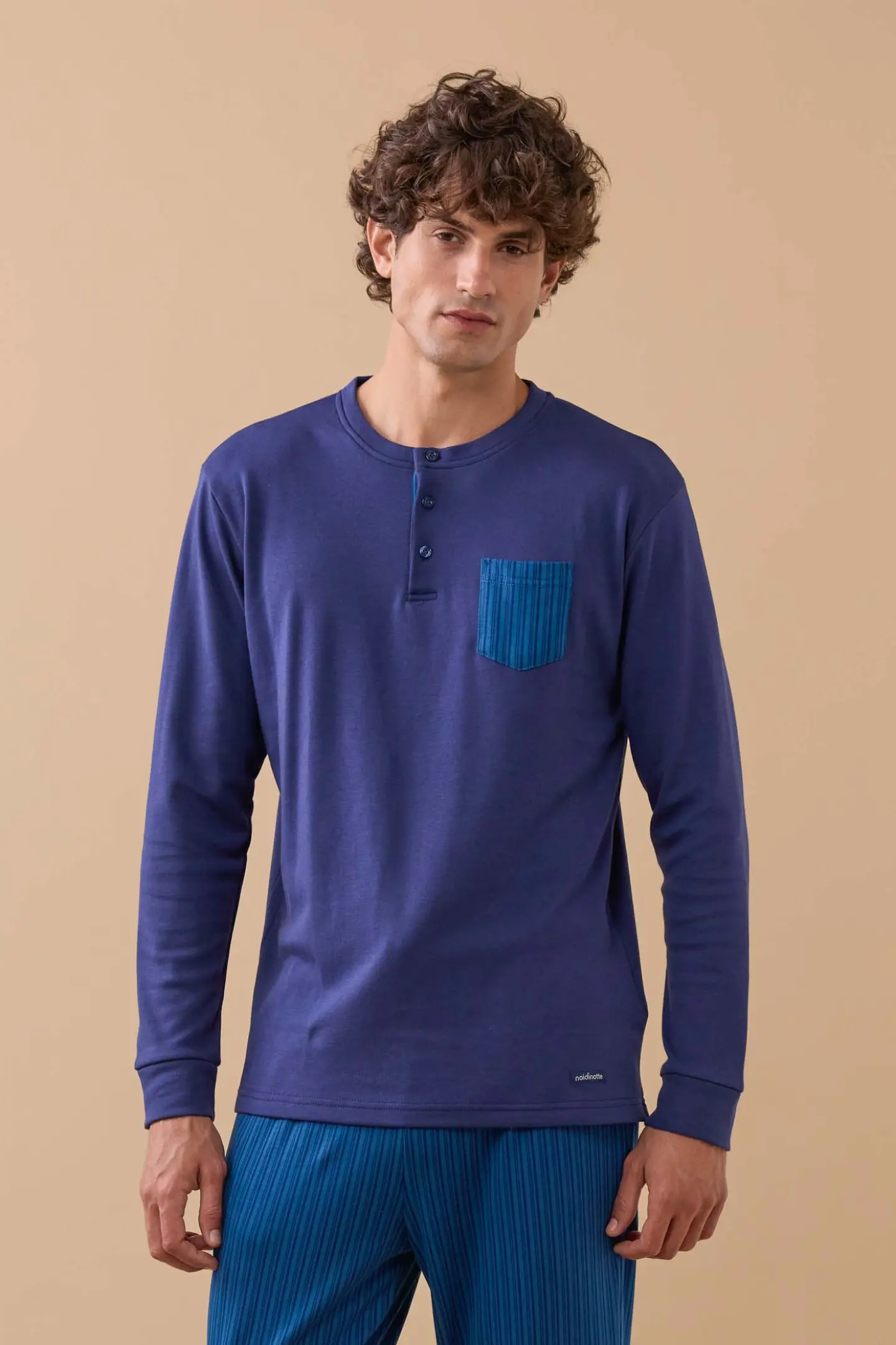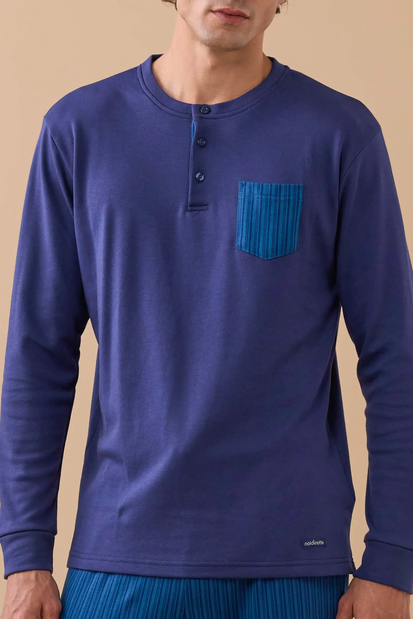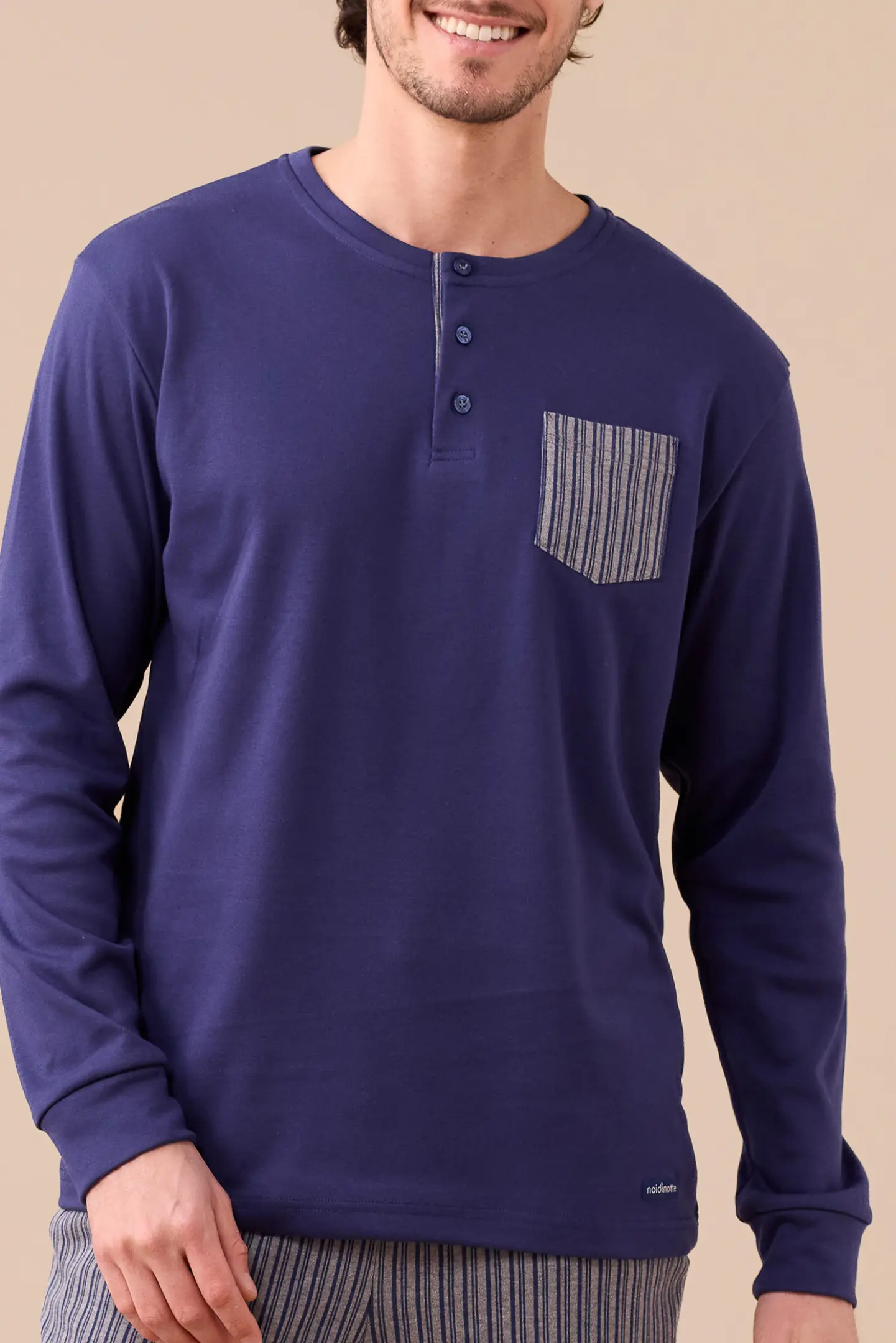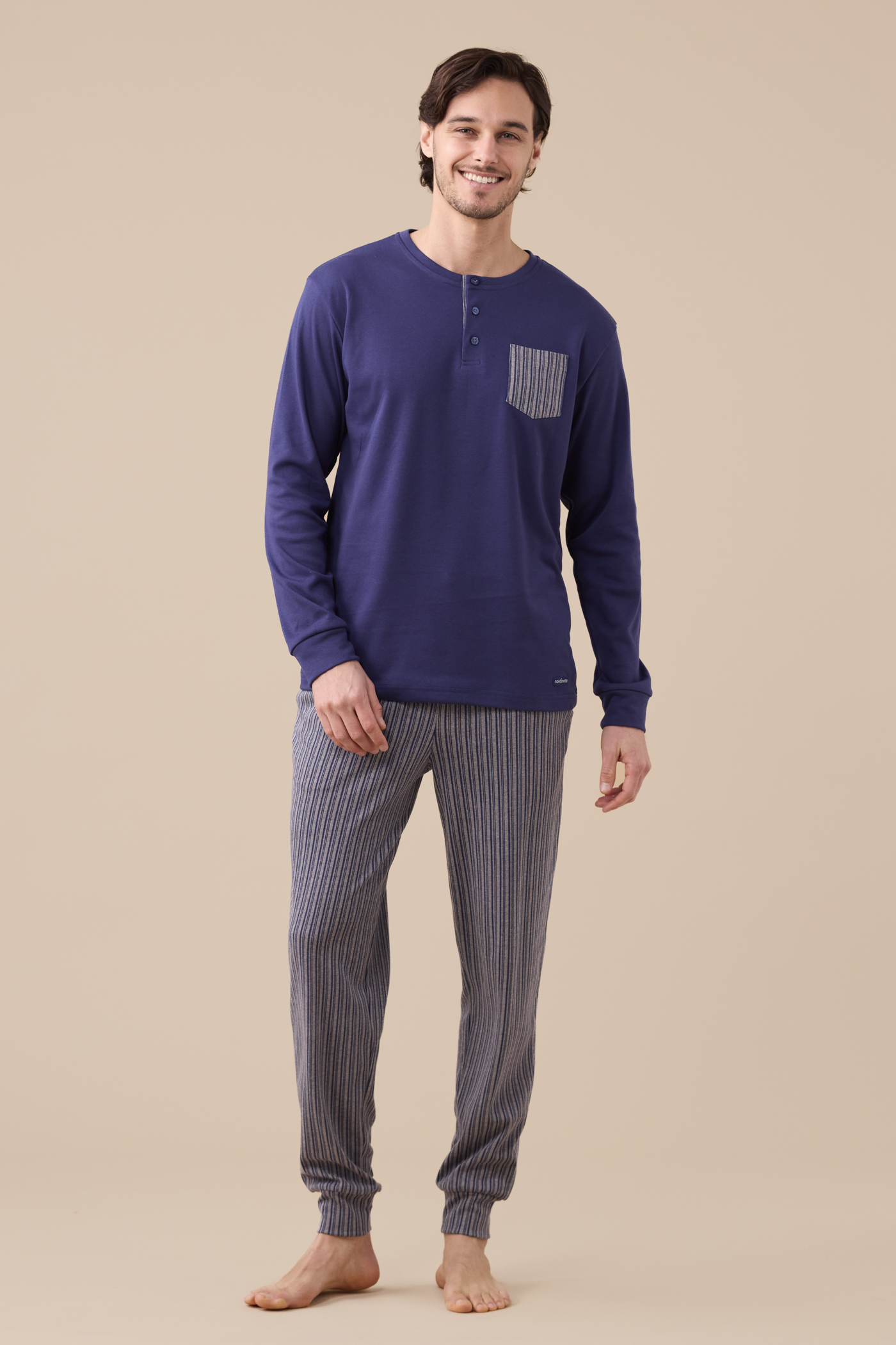 Pigiama uomo in caldo cotone felpato, top di colore unito con collo a tre bottoni e pantaloni in stampa rigata con polsino.