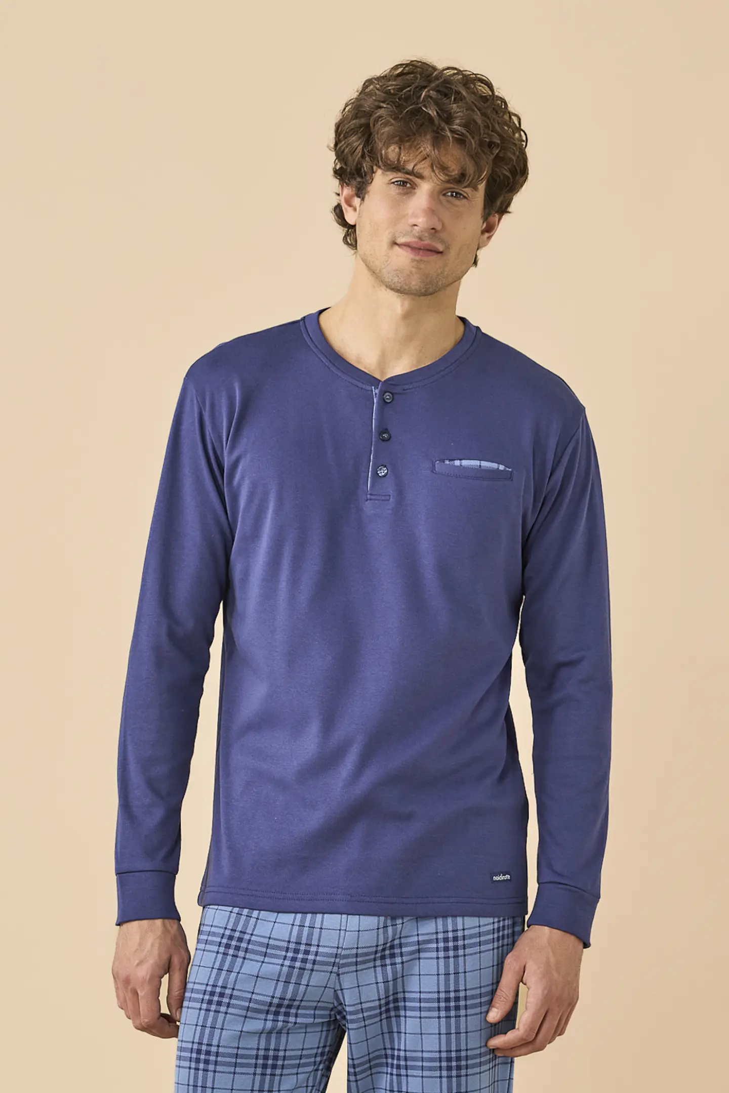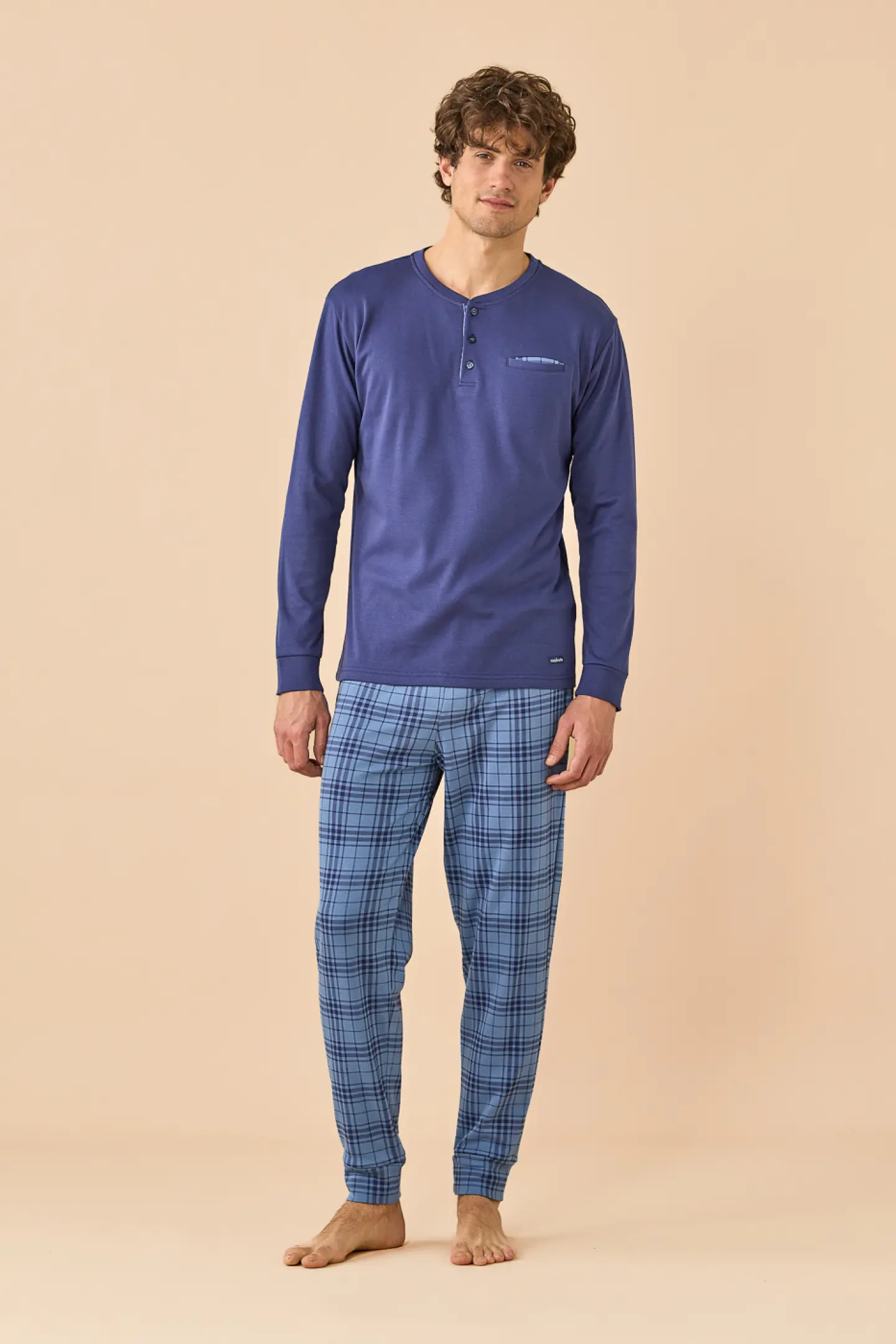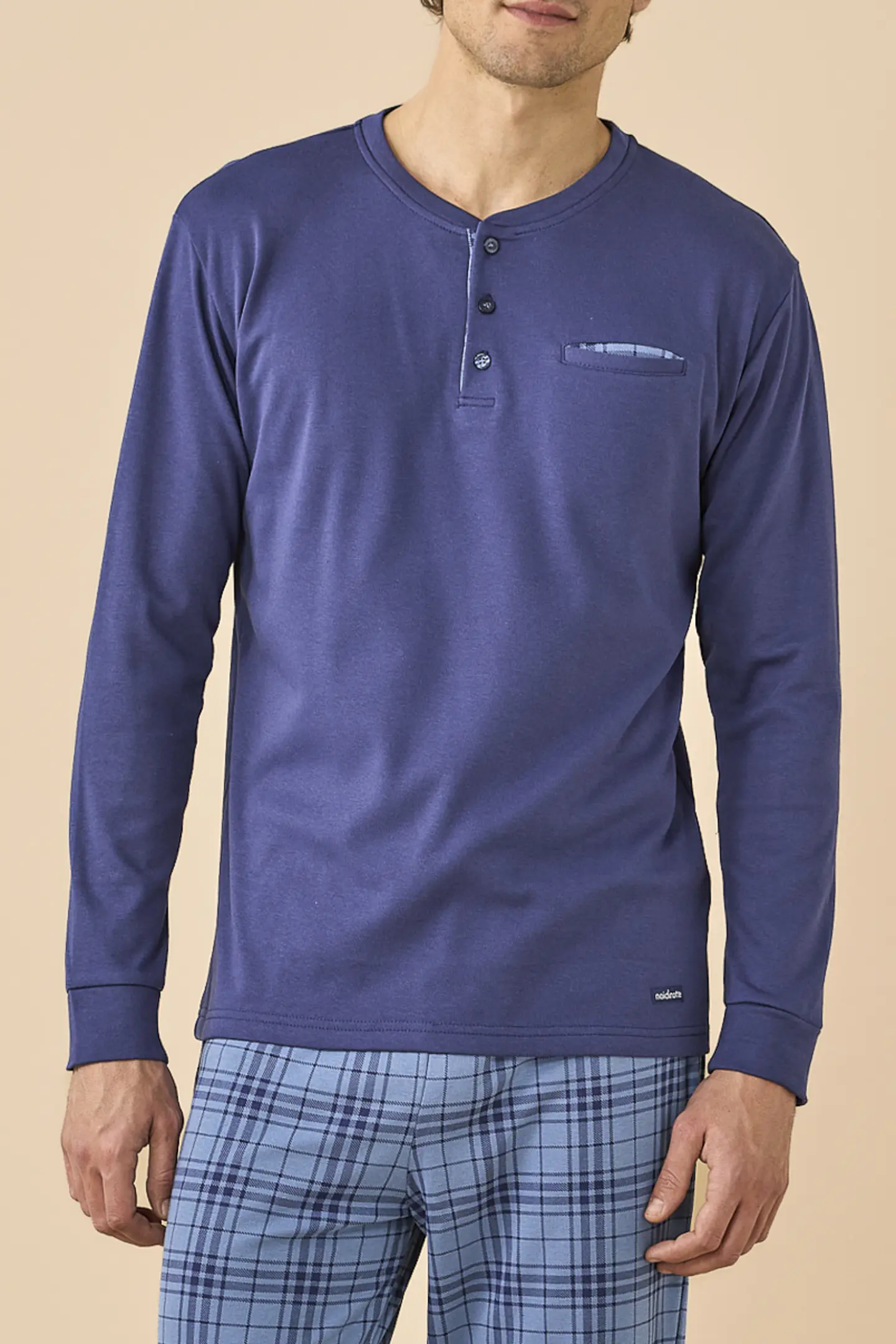 Pigiama uomo in caldo cotone felpato, top di colore unito con collo a tre bottoni e pantaloni in stampa a quadri con polsino.
