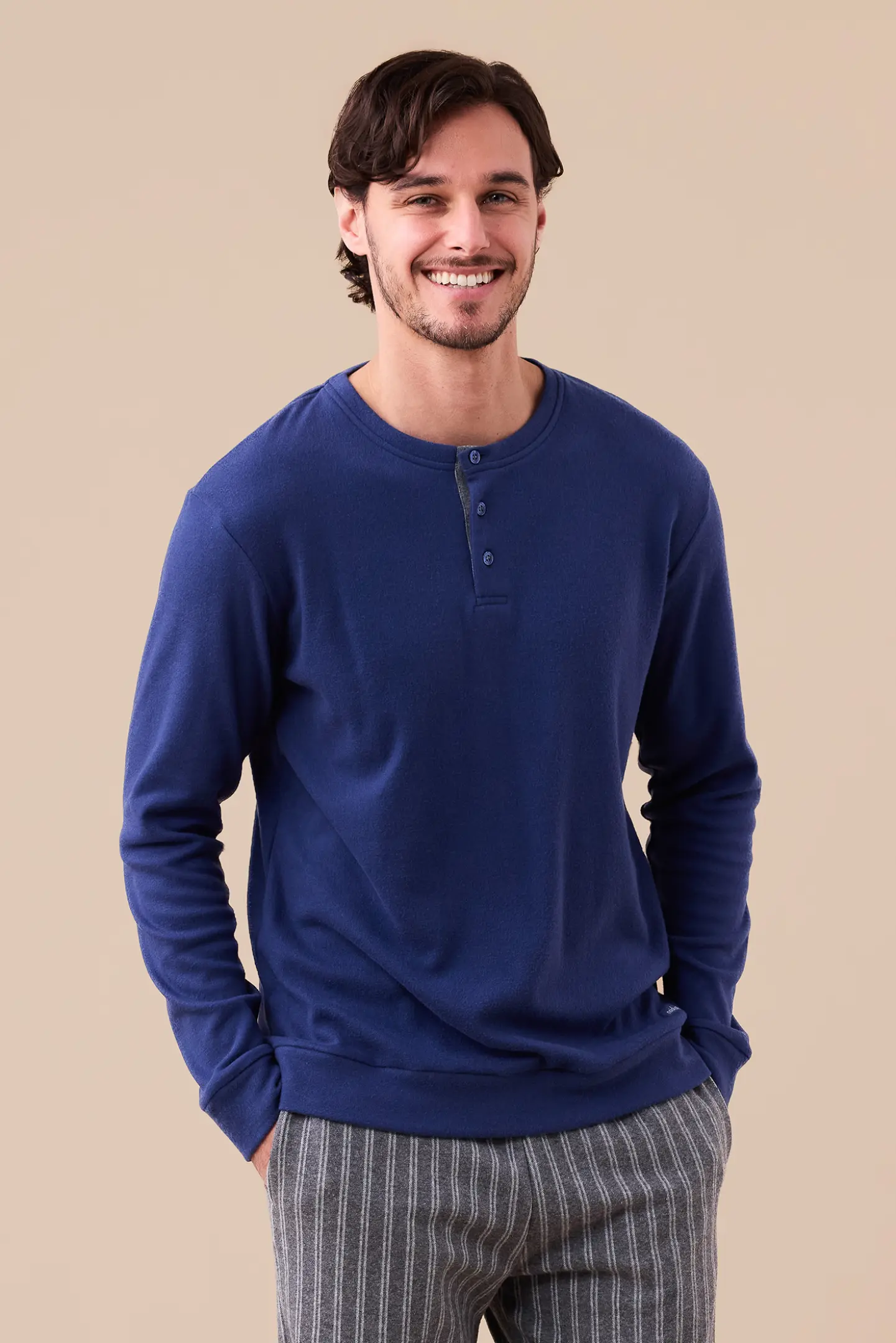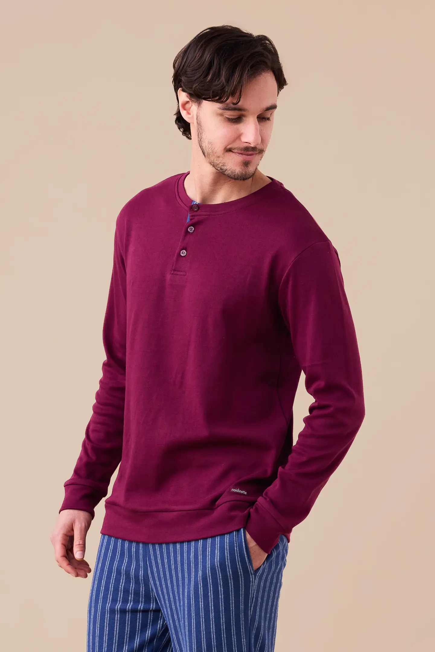 Pigiama uomo in punto milano, top di colore unito con collo a tre bottoni e pantaloni in stampa rigata con polsino.