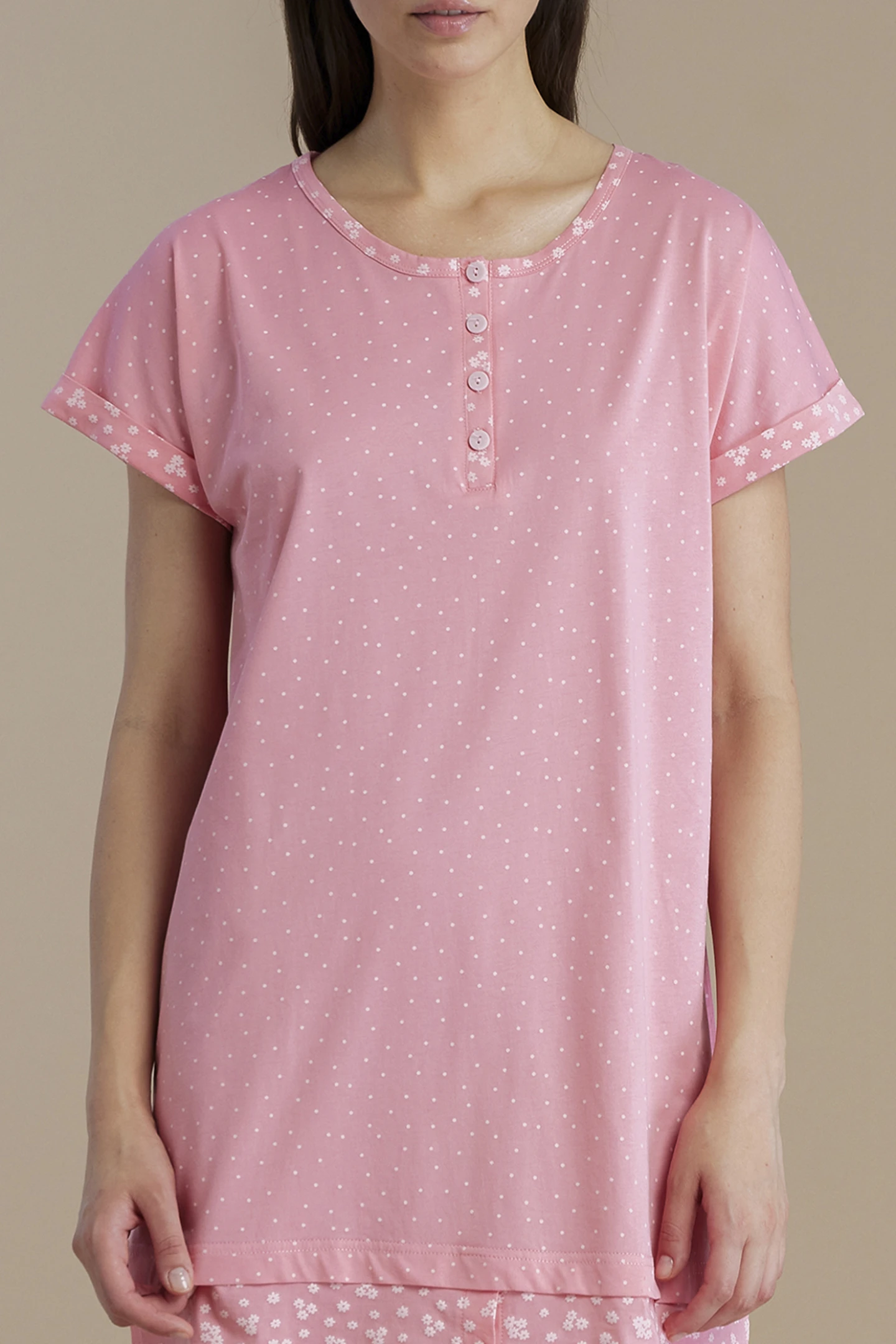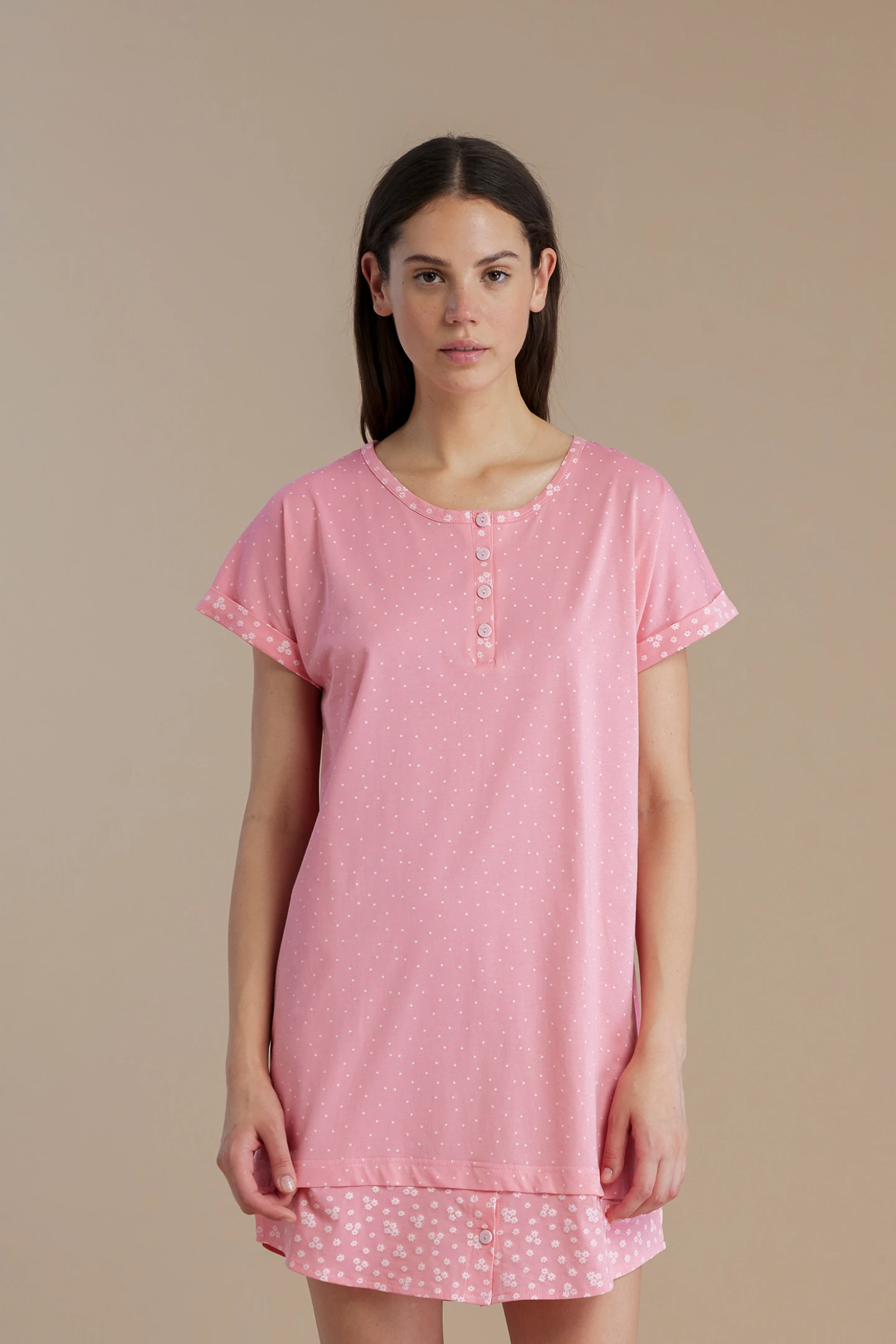 Camicia da notte donna in 100% cotone con maniche corte e collo a quattro bottoni, impreziosita da una delicata fantasia a pois. Il dettaglio del bordo a contrasto floreale aggiunge un tocco femminile e raffinato, ideale per notti di relax e comfort.