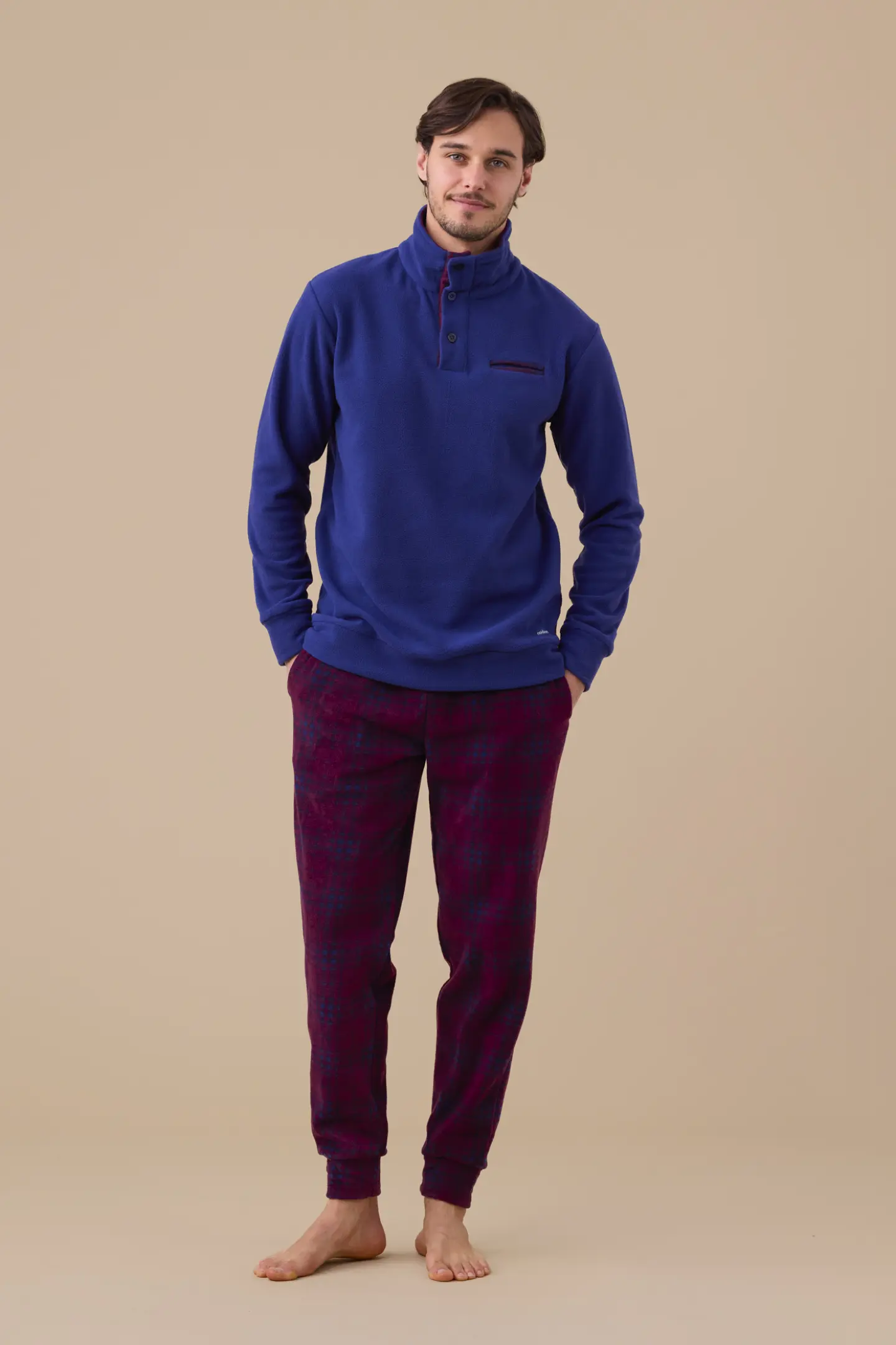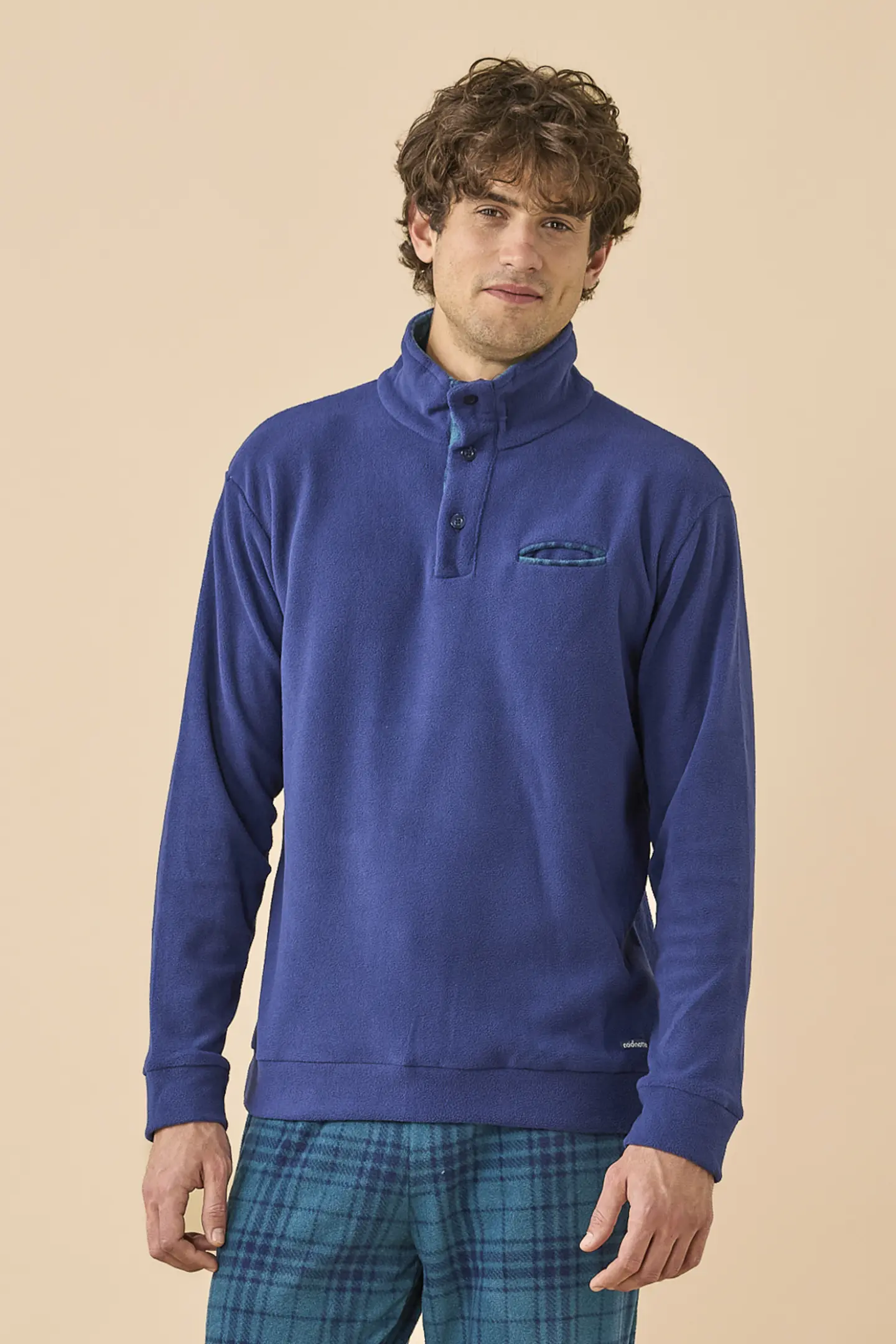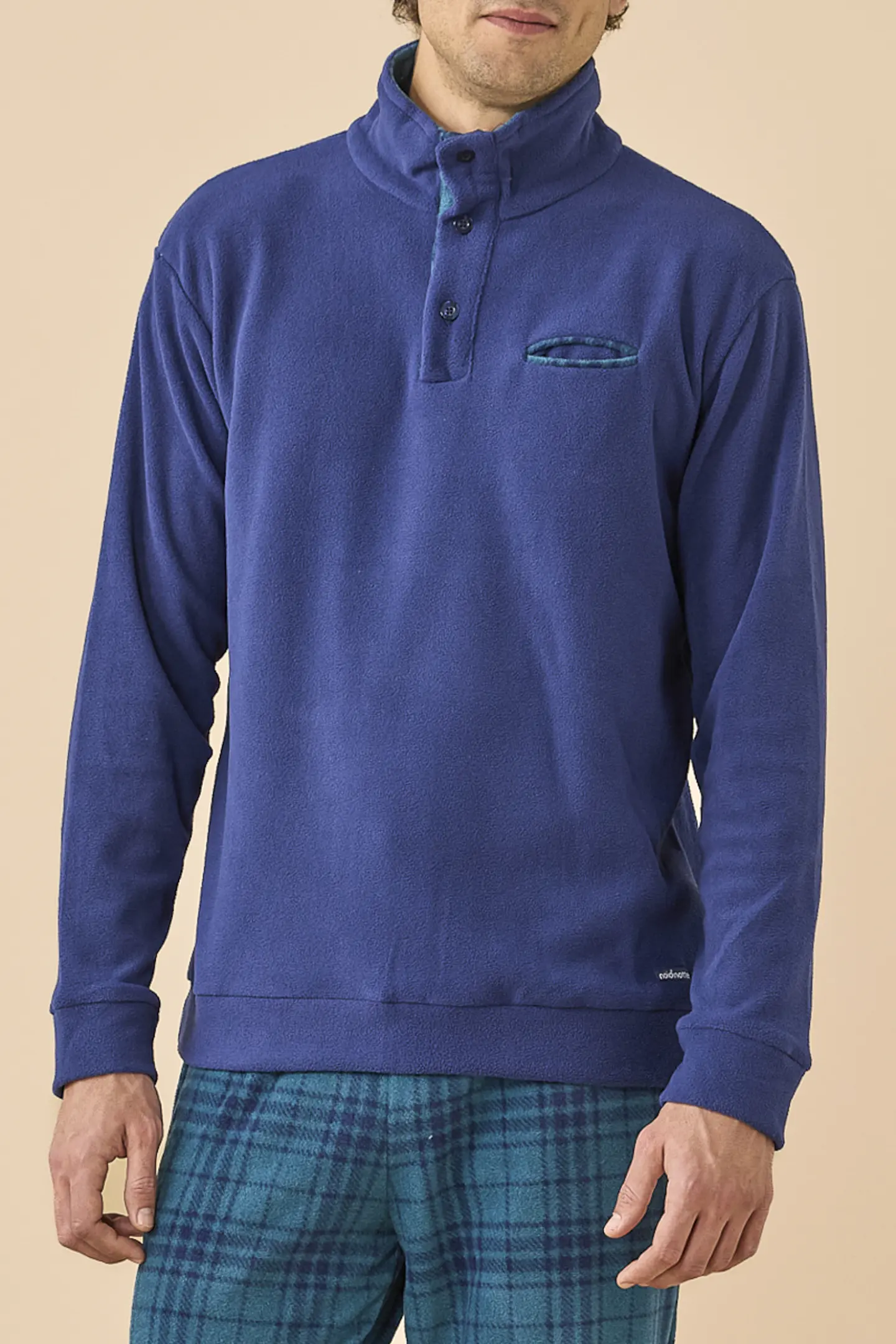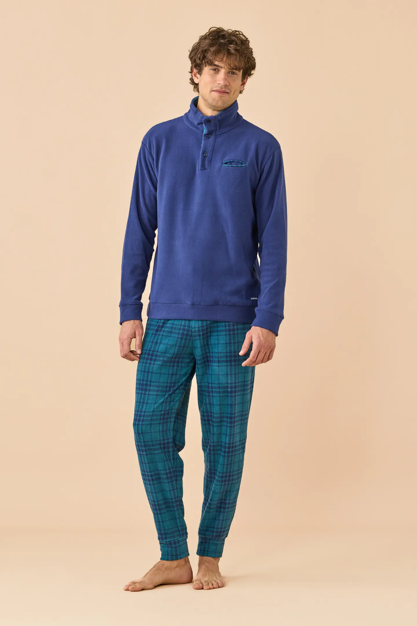 Pigiama uomo invernale in micropile, top di colore unito collo alto a tre bottoni e pantaloni in stampa scozzese con polsino.