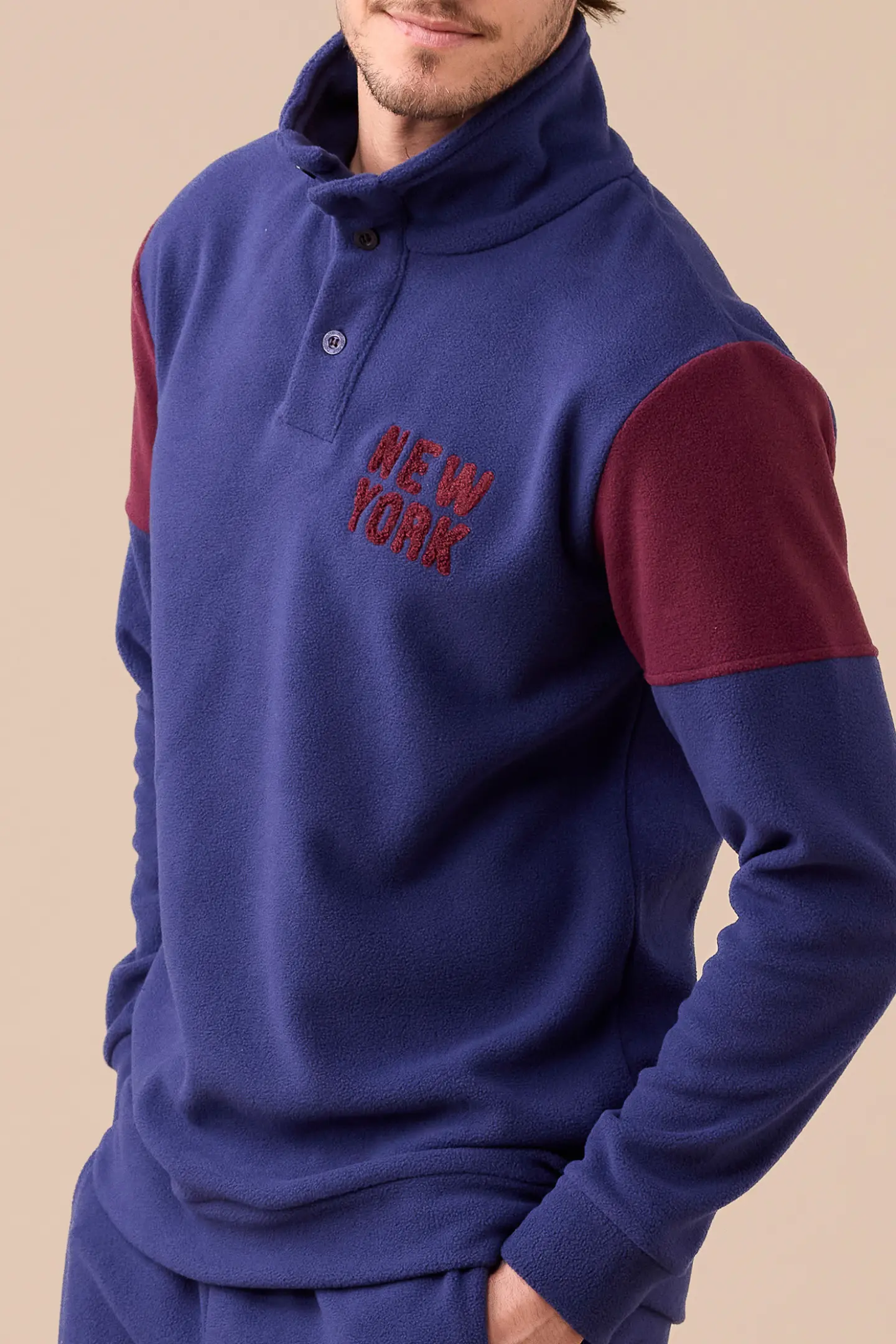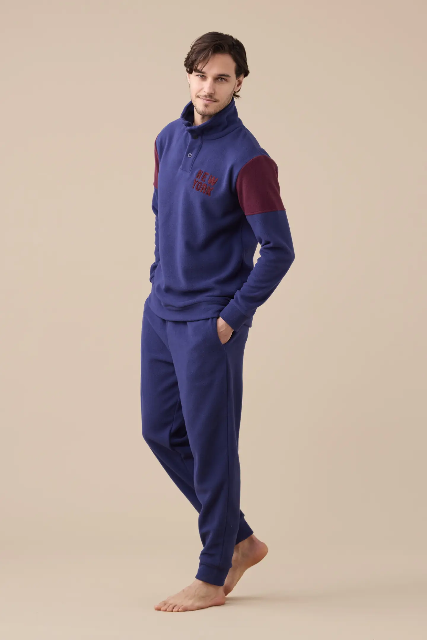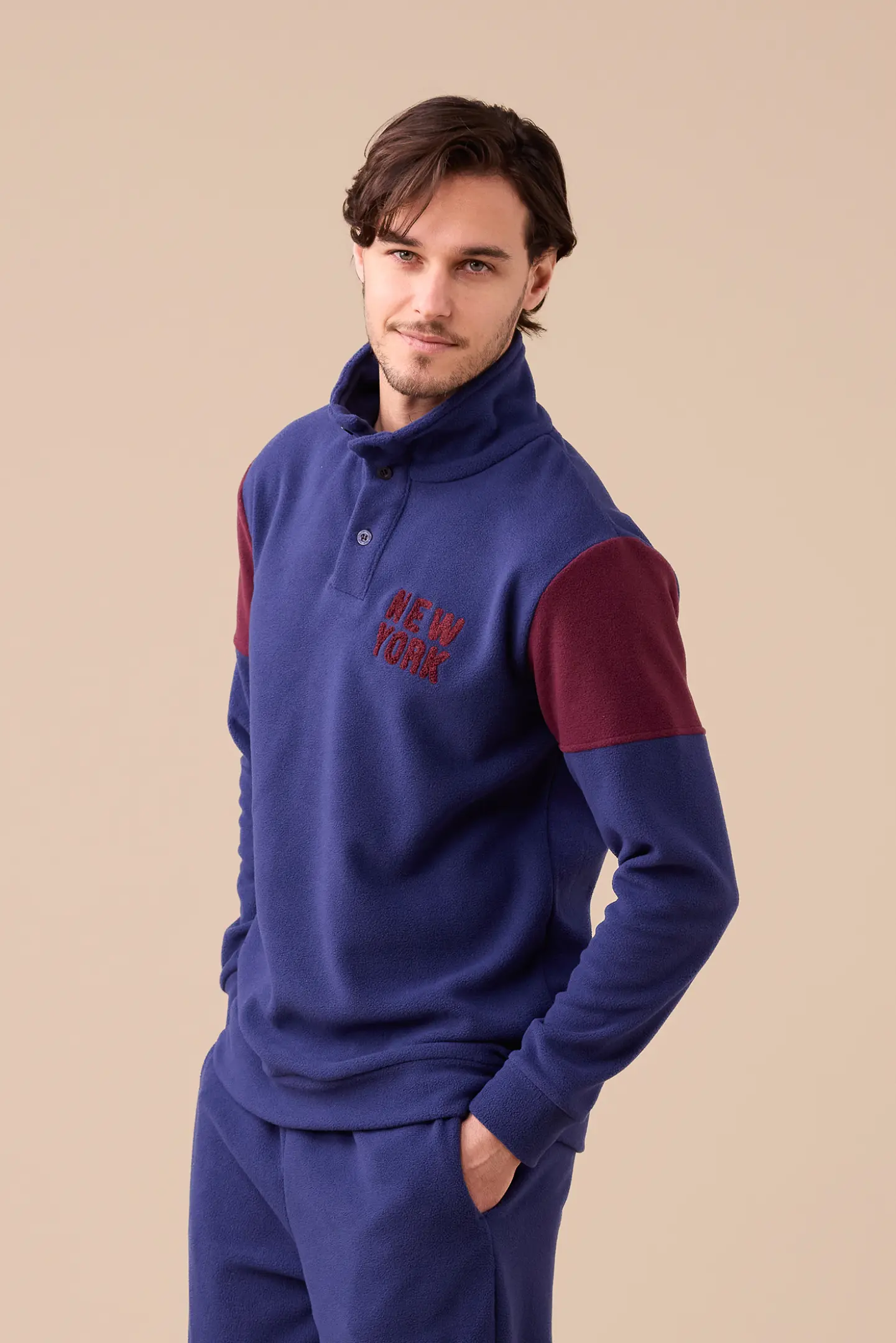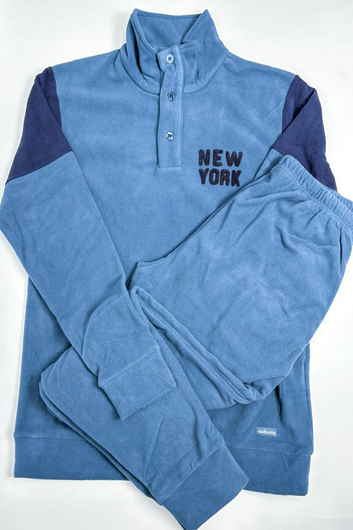 Pigiama uomo in micropile, top di colore unito collo alto a tre bottoni con applicazione e pantaloni di colore unito con polsino.