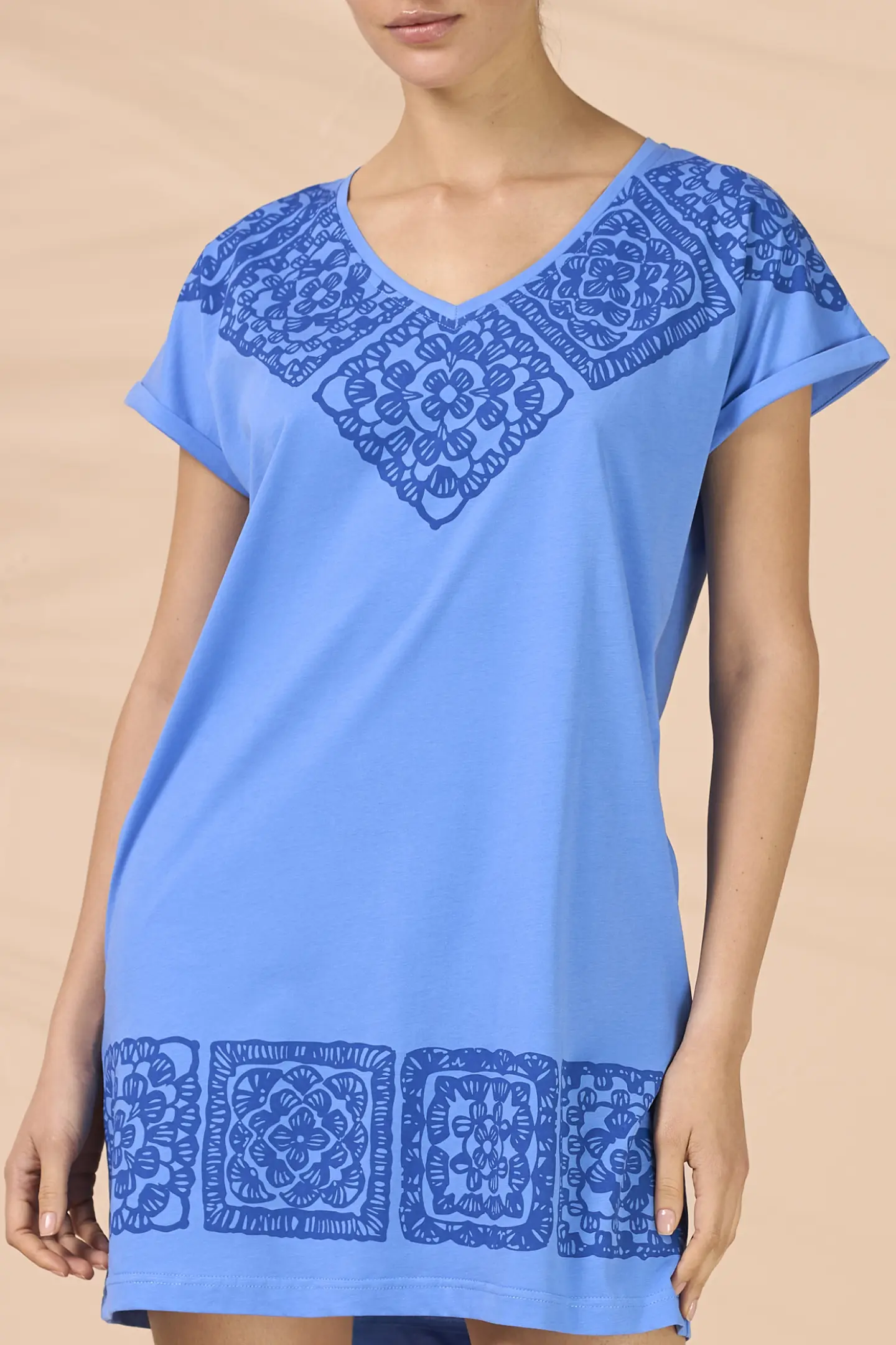 Abitino corto in cotone azzurro con stampa piazzata a motivo maiolica. La scollatura a V e le maniche morbide offrono una vestibilità comoda e ariosa.