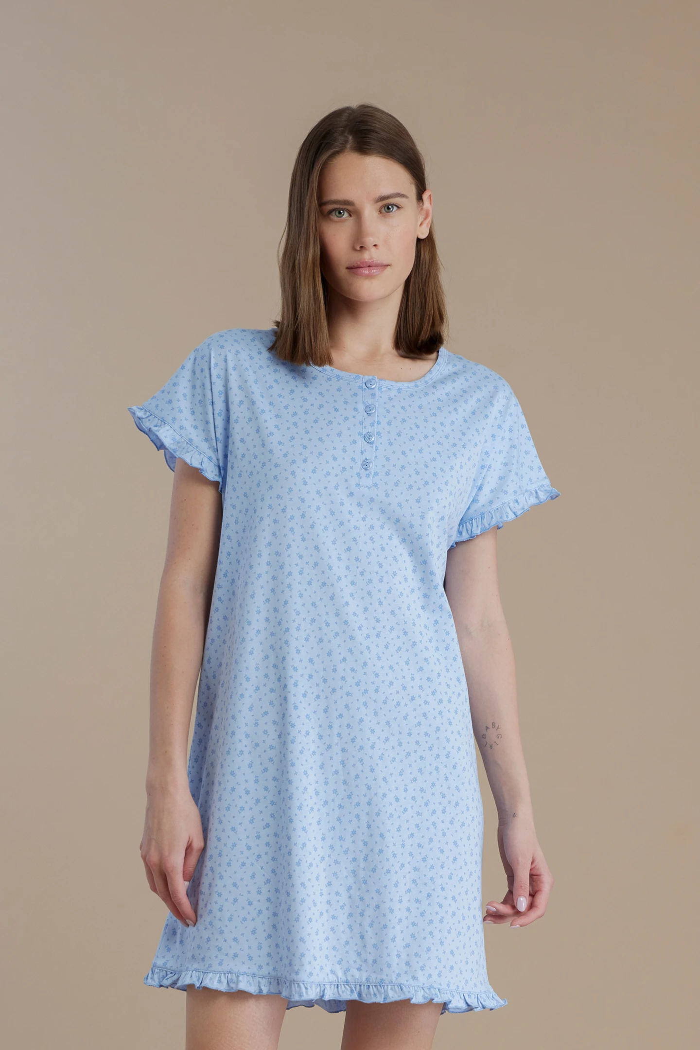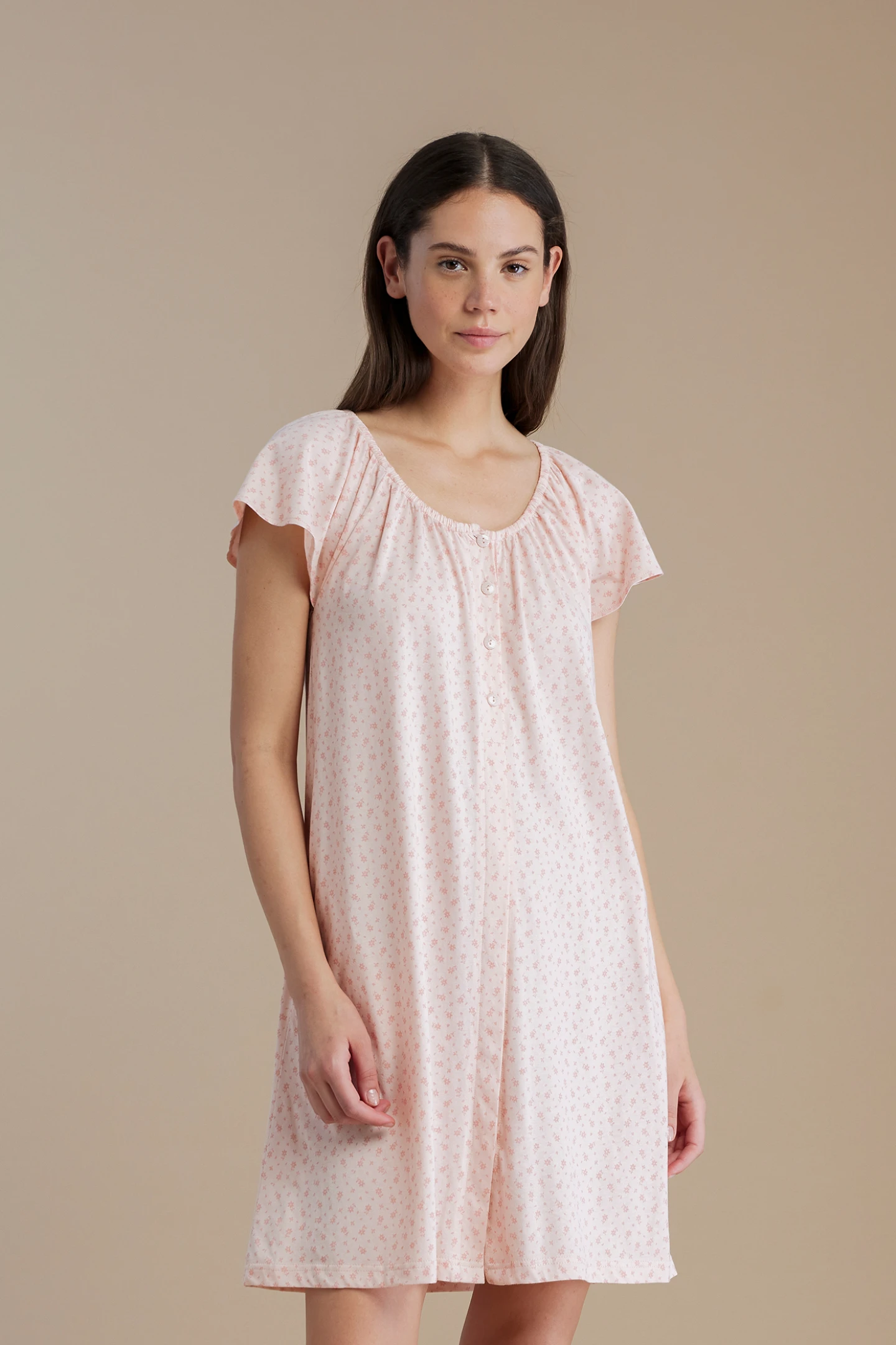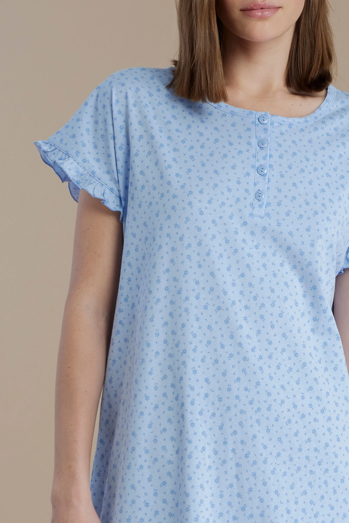 Camicia da notte donna in 100% cotone a manica corta con collo a quattro bottoni. La stampa a fiorellini, le rouches sulle maniche aggiungono un tocco di romanticismo.