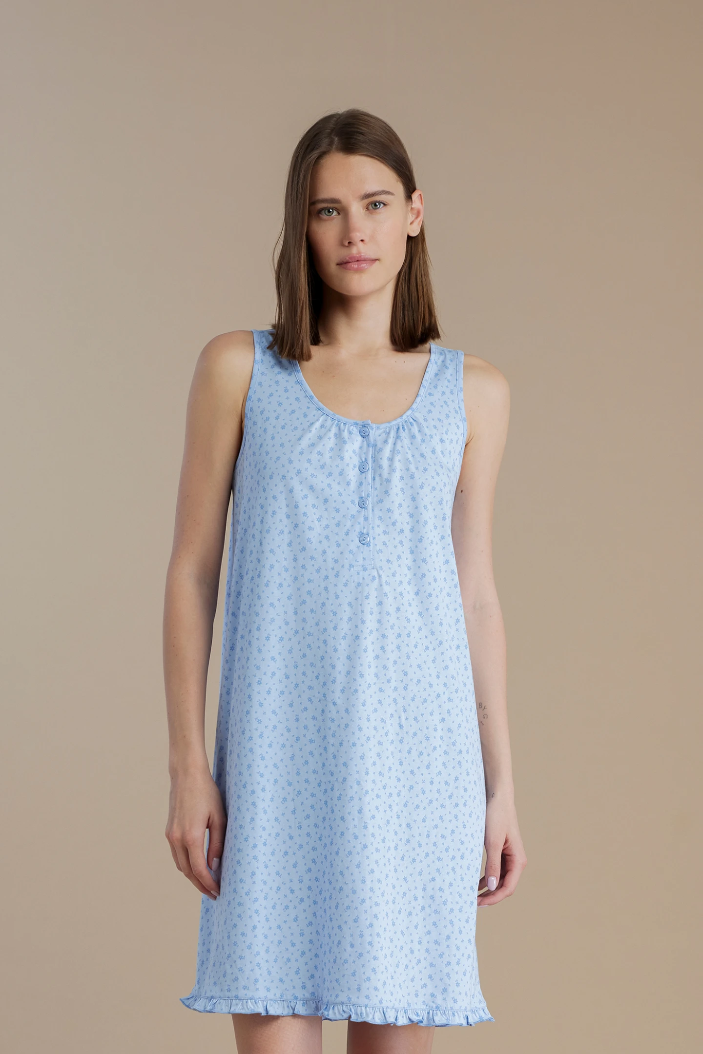Camicia da notte donna in 100% cotone a spalla larga con collo a quattro bottoni. La stampa a fiorellini, e la rouches sull’orlo aggiungono un tocco di romanticismo.