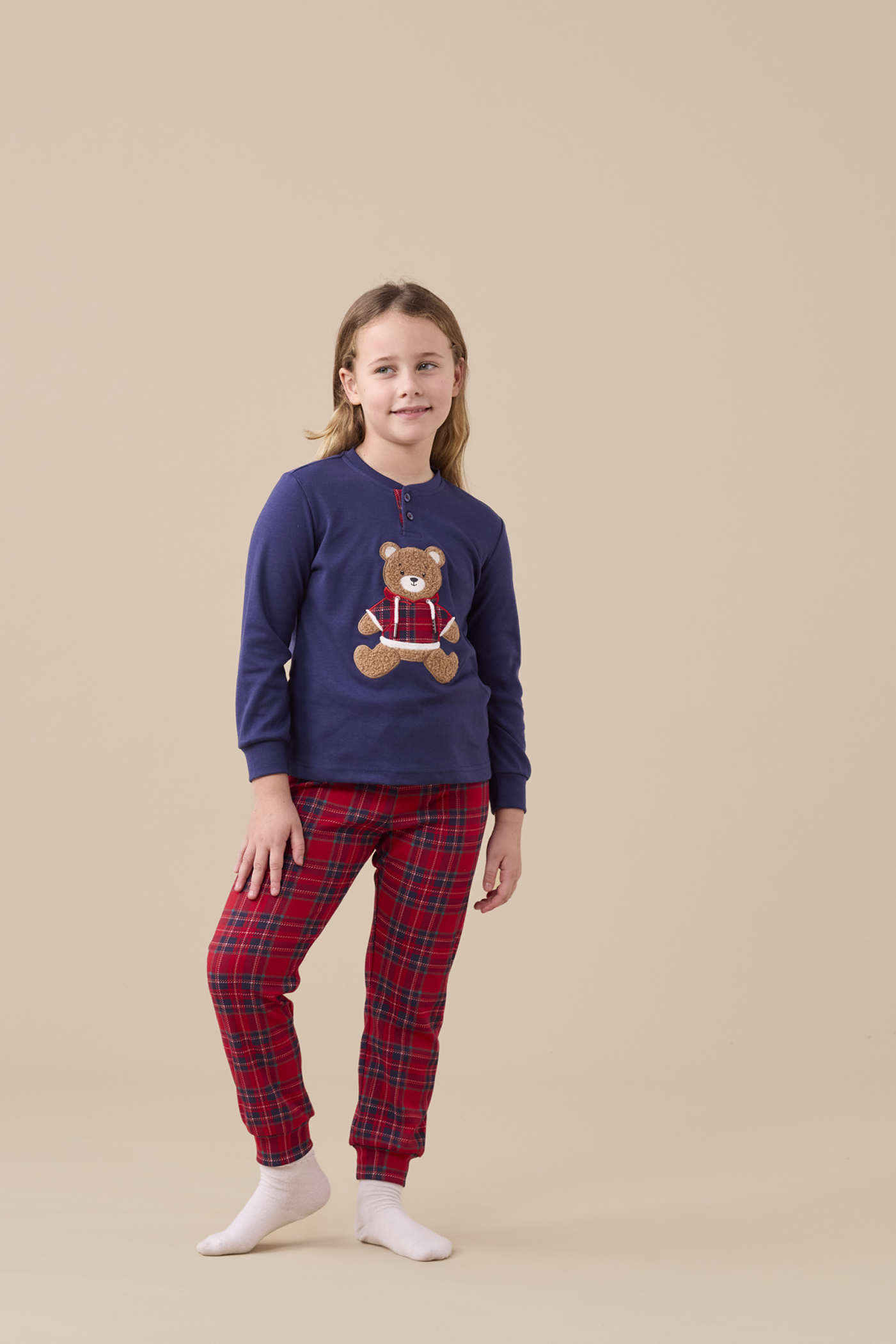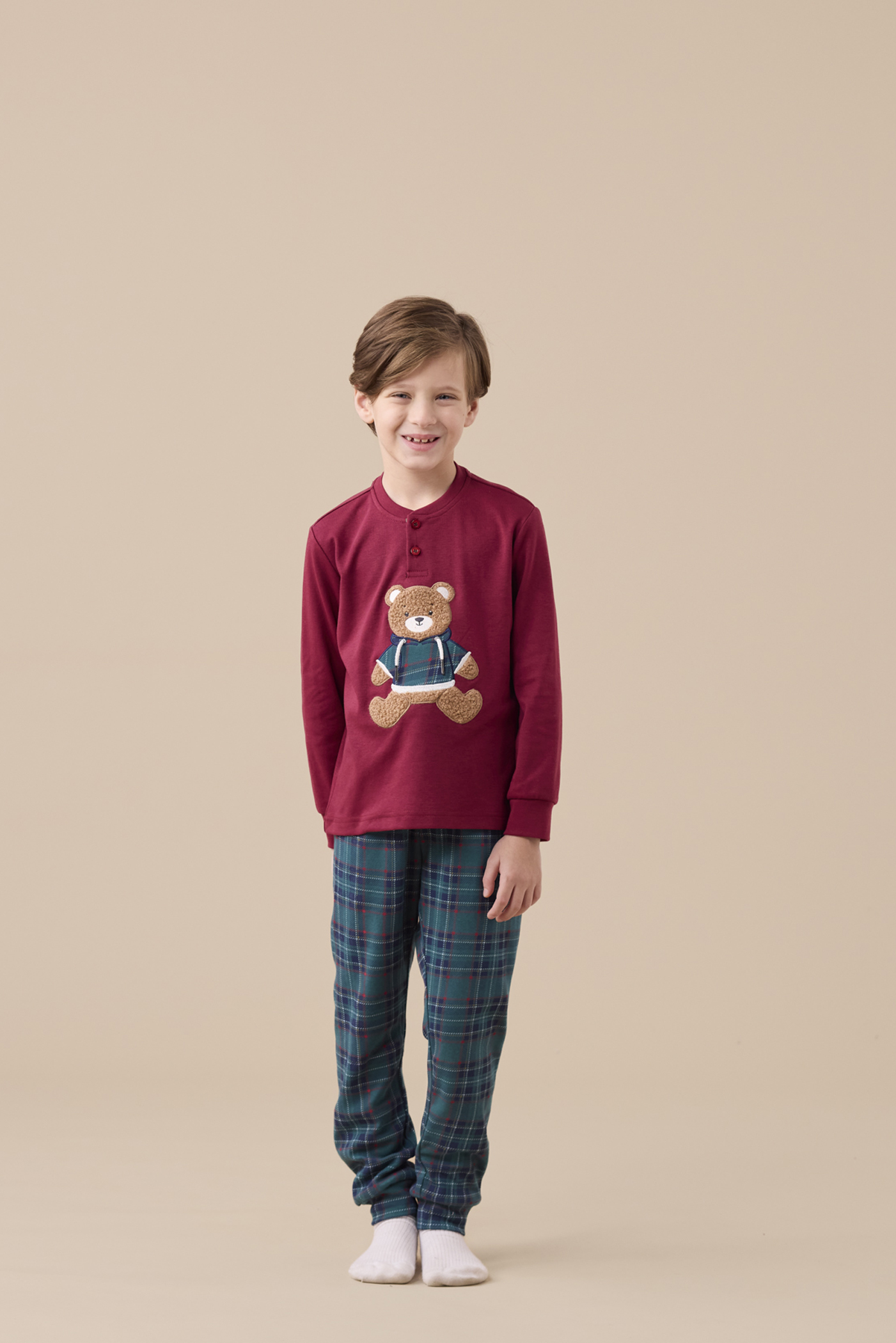 Pigiama ragazzo/a in caldo cotone, top a collo due bottoni con applicazione orso e pantaloni in stampa scozzese con polsini.