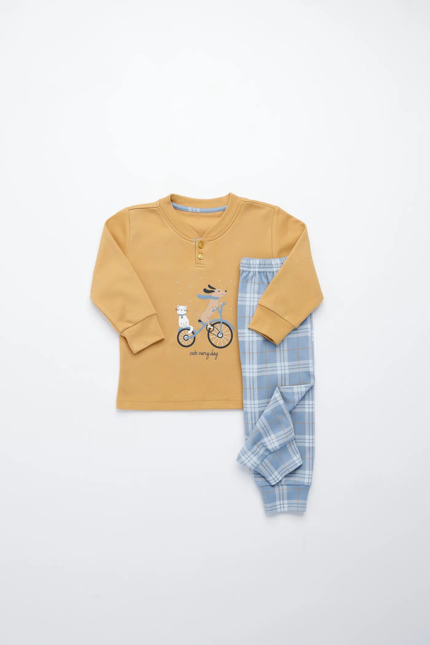 Pigiama neonata/o yuppie in morbido caldo cotone con collo due bottoni con simpatica stampa cagnolino e piccolo fiocco e pantalone lungo con comodi polsini in raffinata stampa scozzesev