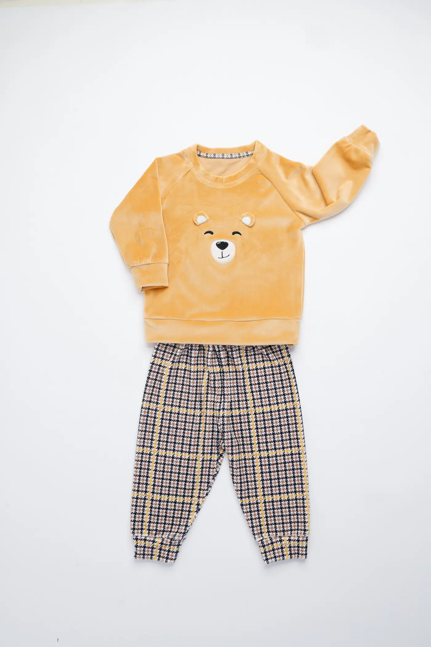 Pigiama neonato/a bear in morbida ciniglia, top tinta unita con divertente applicazione orso e pantalone con stampa pied de poule con comodi polsini