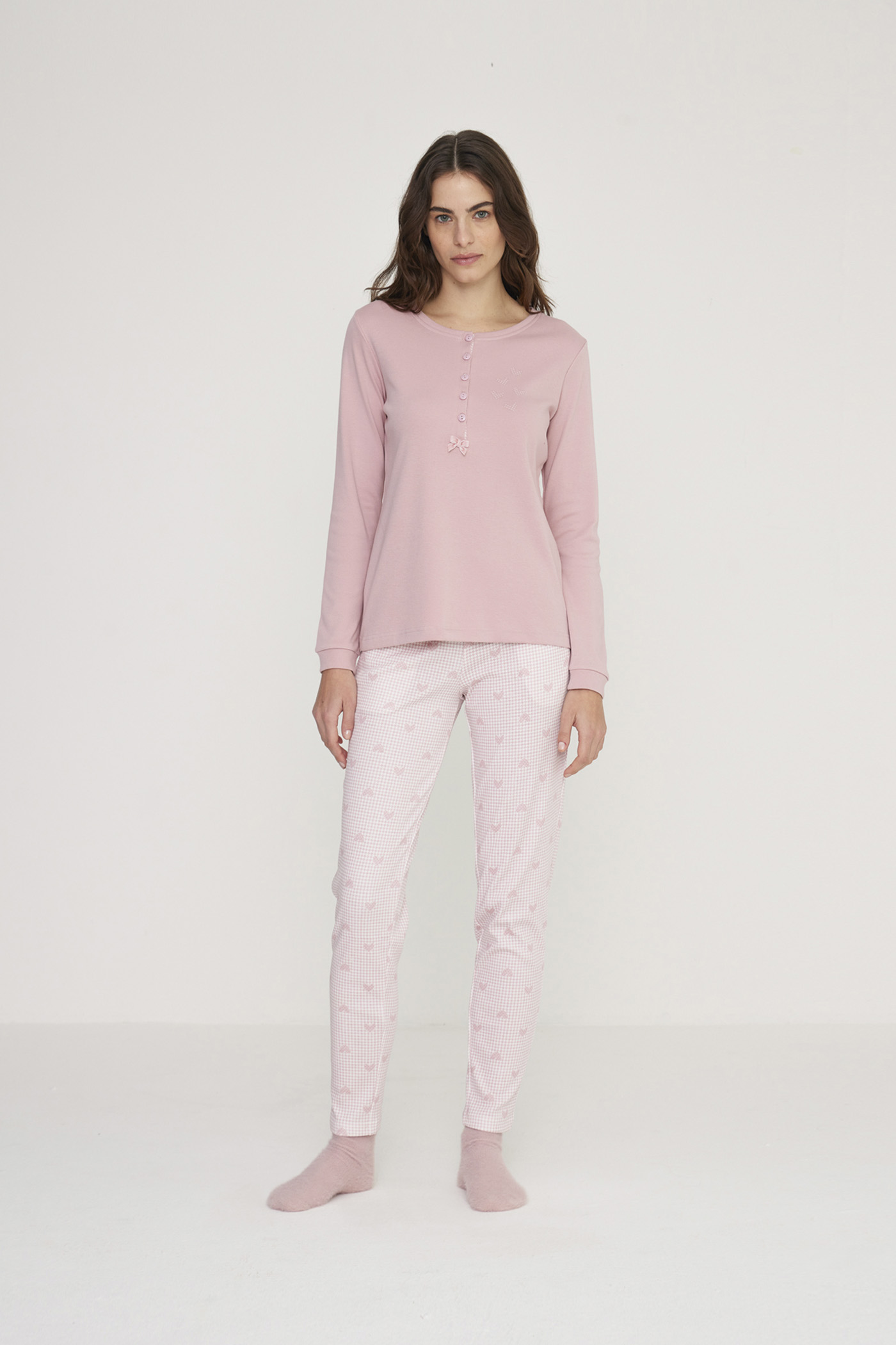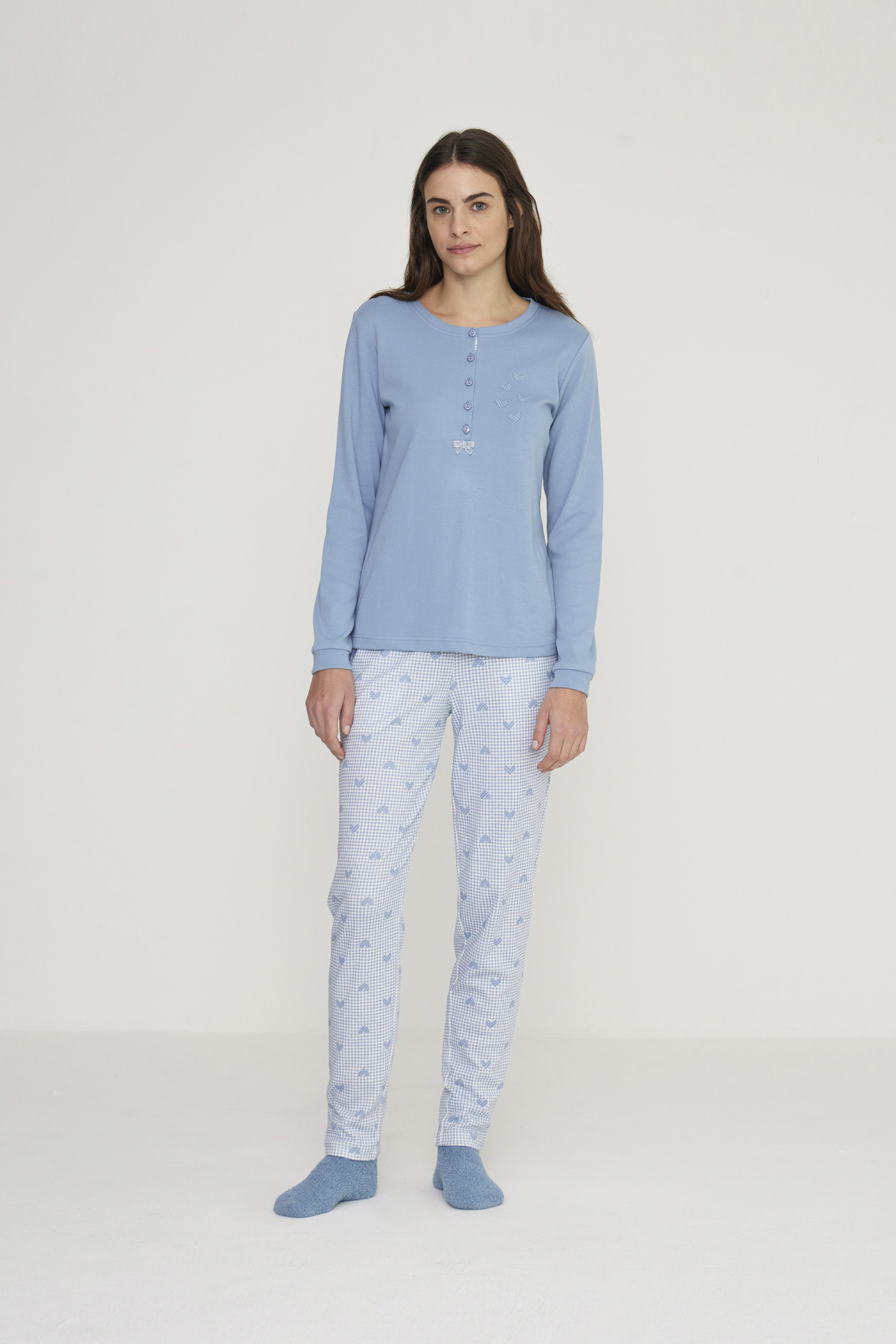 Pigiama donna calibrato in morbido caldo cotone con collo cinque bottoni con cuoricini e pantalone lungo.