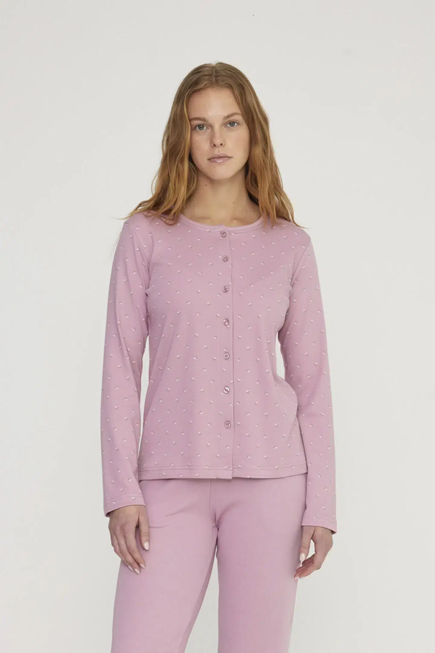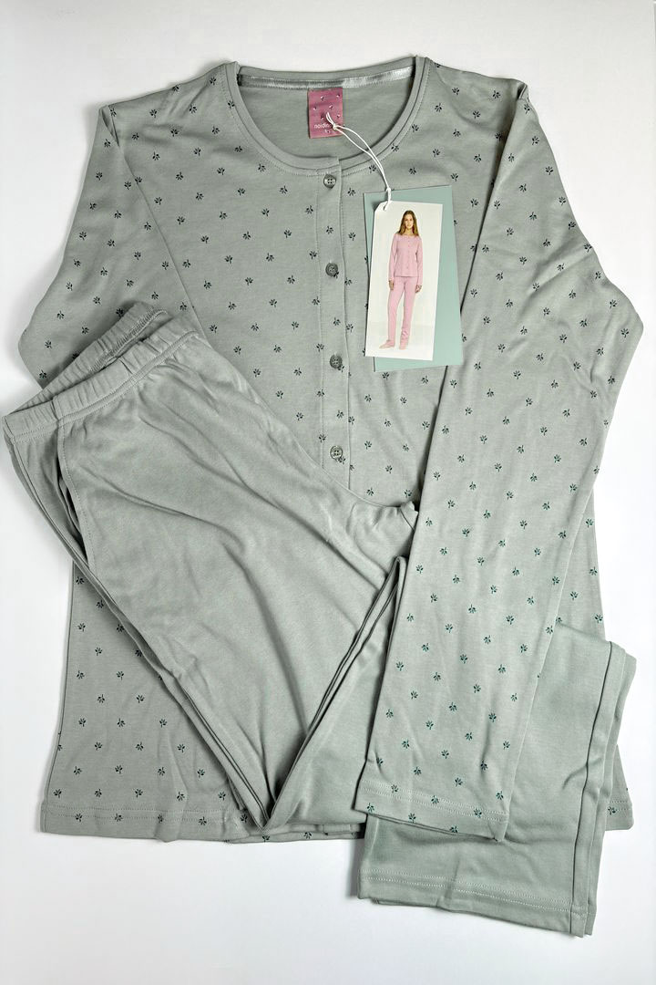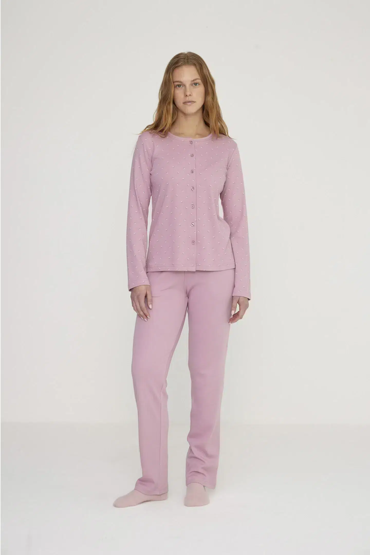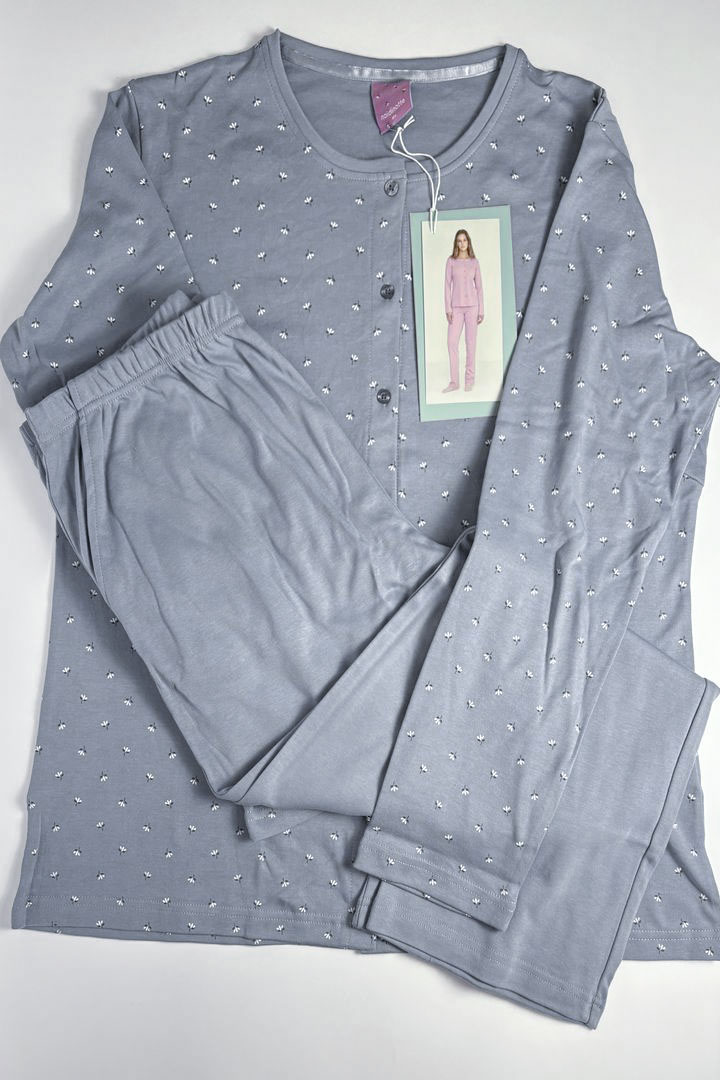 Pigiama donna tuly in morbido caldo cotone aperto sul davanti con pratica abbottonatura centrale e pantalone lungo senza polsino in romantica stampa a fiori