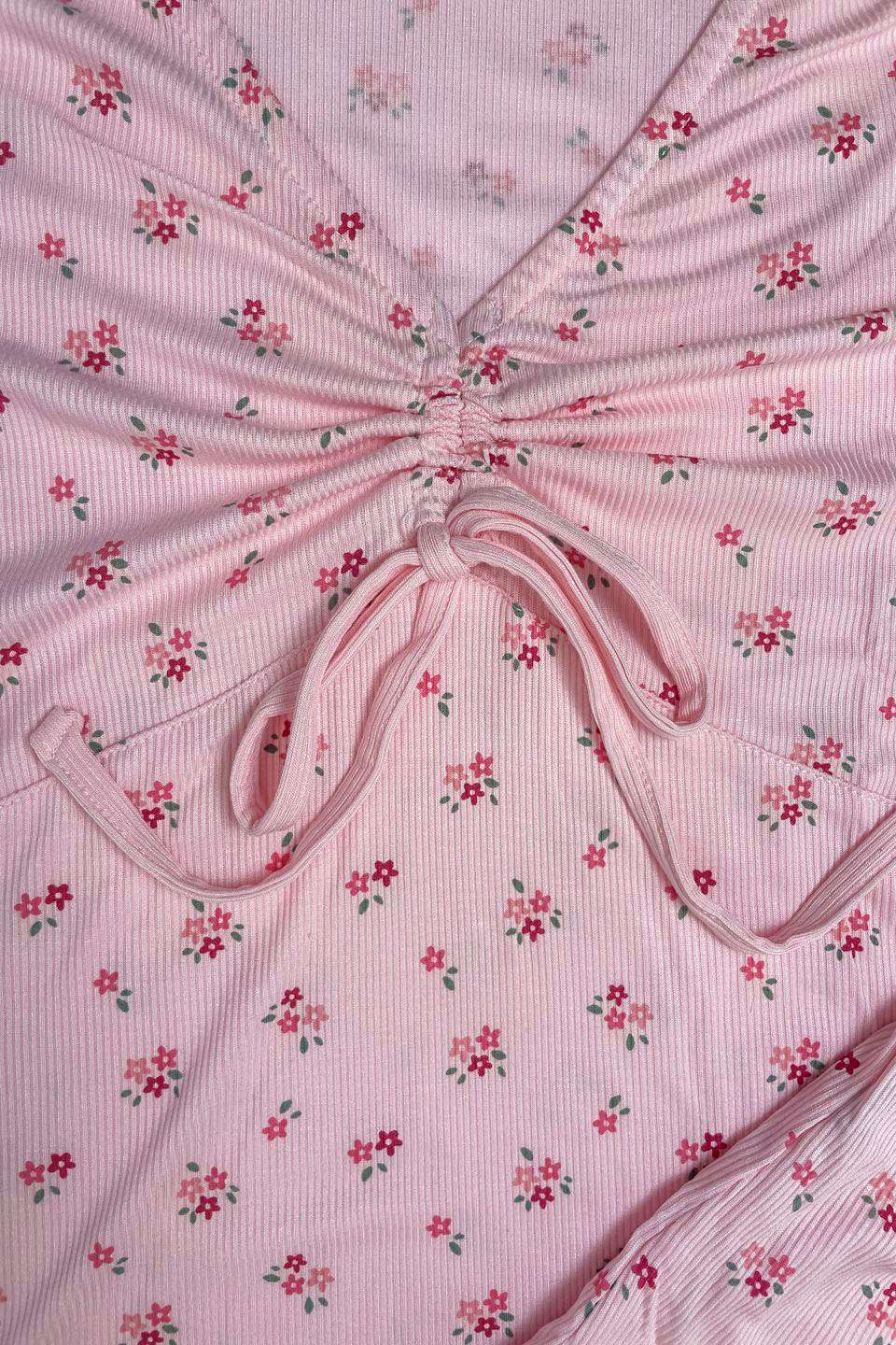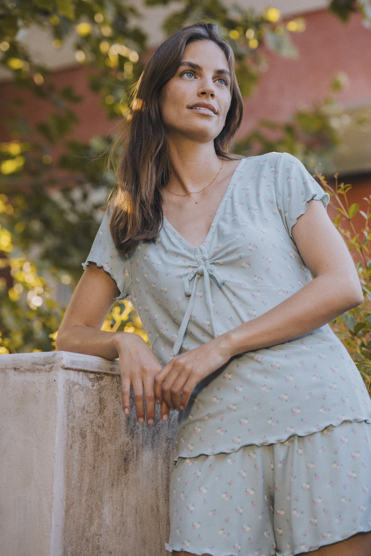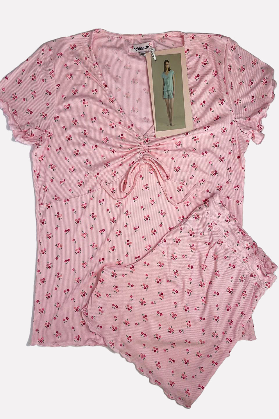 Pigiama donna in morbida costina. Il top a manica corta con scollo a V è impreziosito da un elegante arriccio centrale con fiocchetto regolabile. La delicata stampa a fiorellini si abbina al pantalone corto coordinato, ideale per le serate estive.