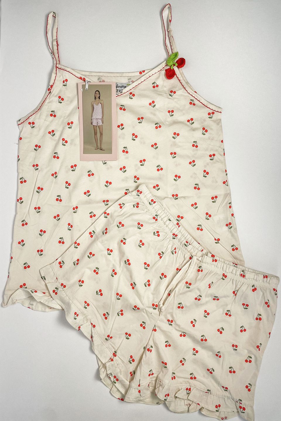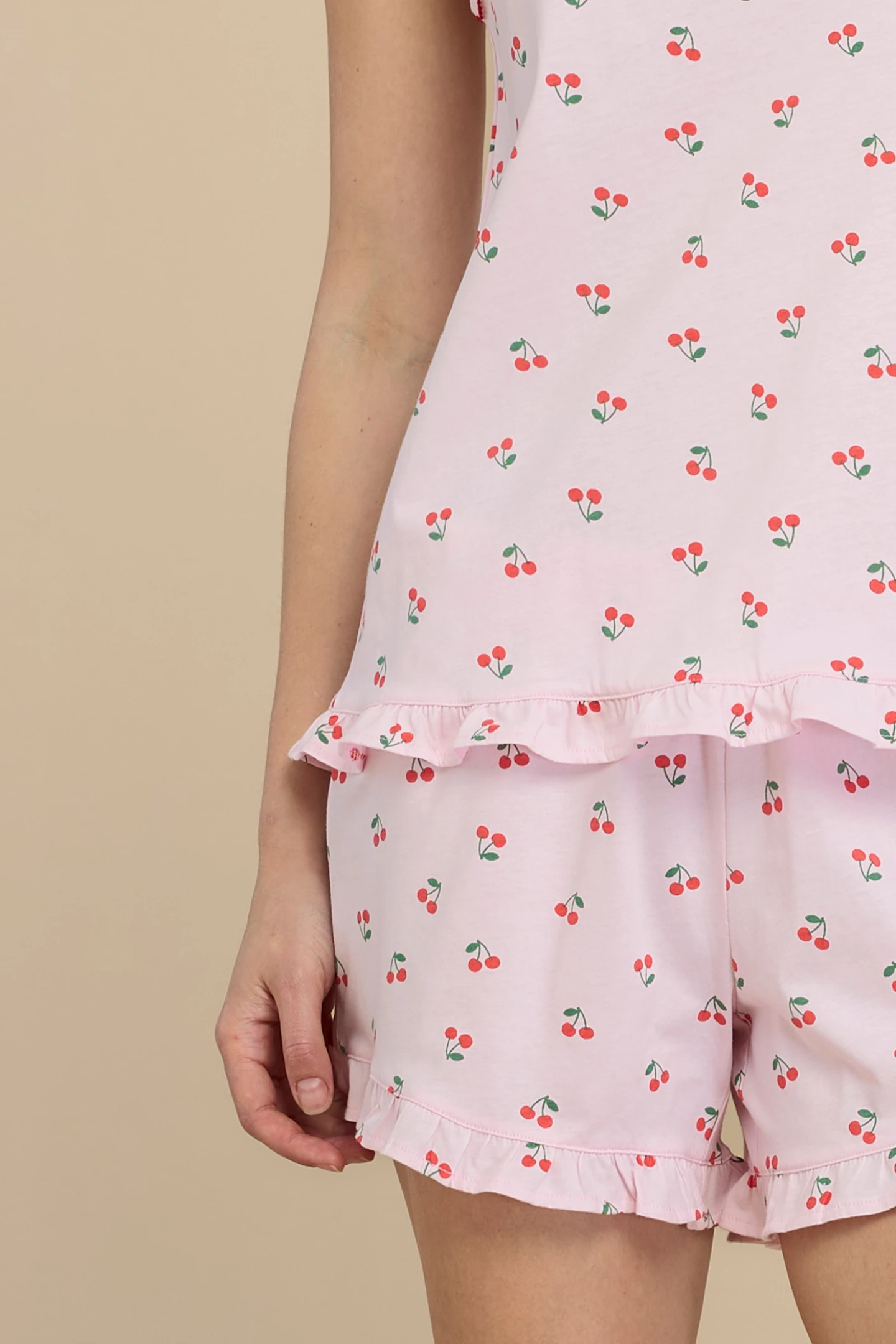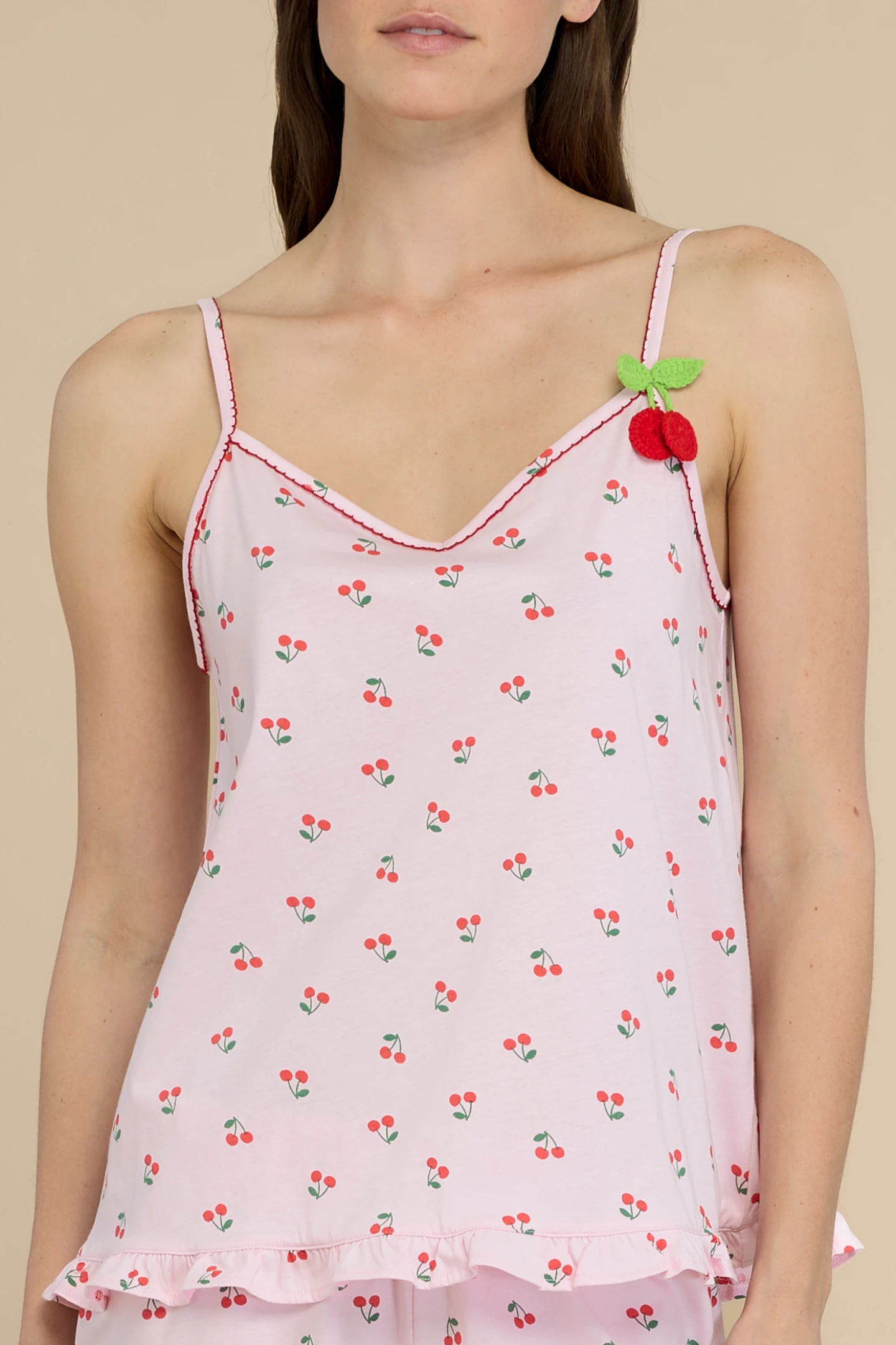 Pigiama donna in 100% cotone, con top a bretelline e scollo a V decorato da un dolce dettaglio a forma di ciliegia applicato su una spallina. I pantaloncini coordinati presentano una vivace stampa ciliegie.