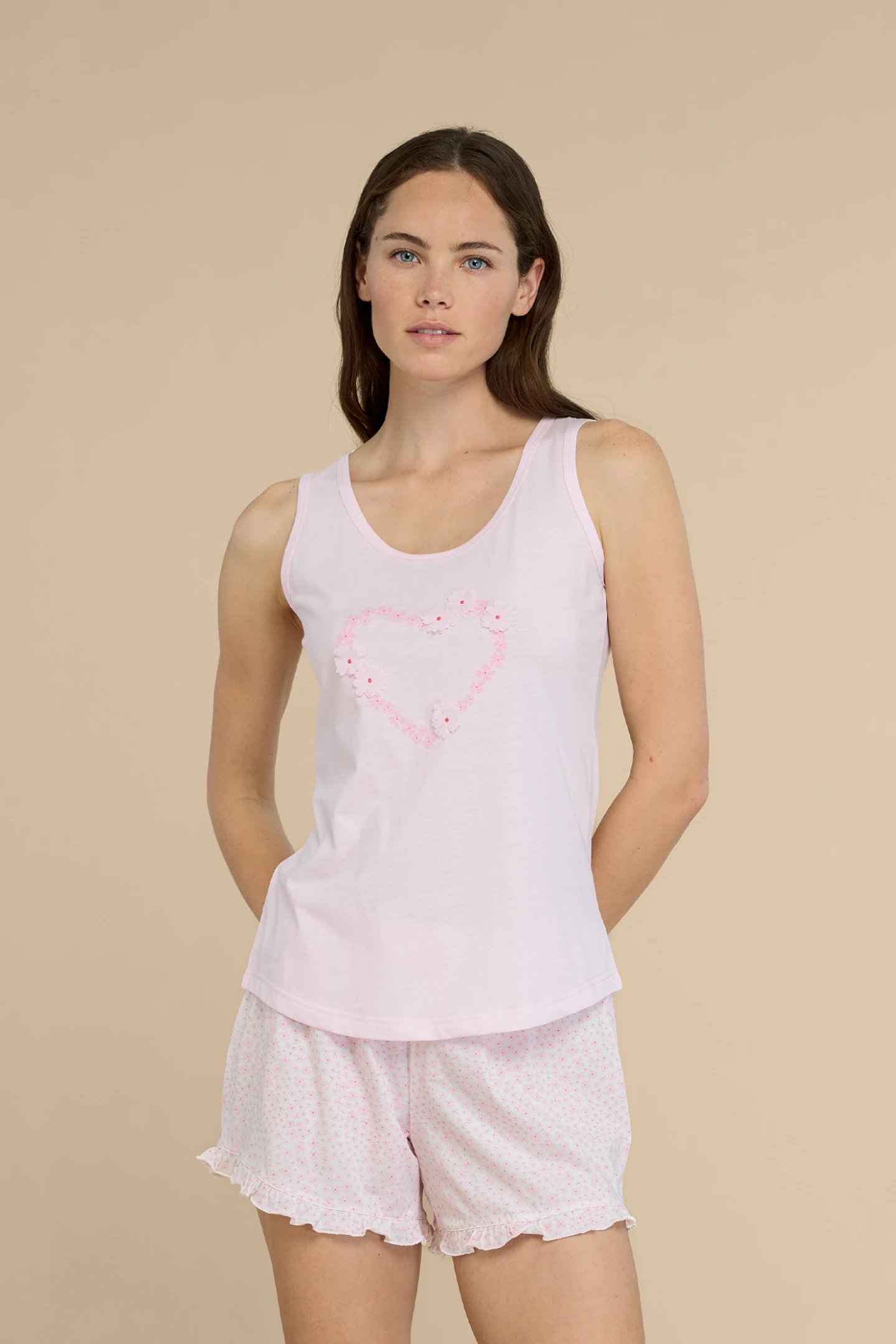 Pigiama donna in 100% cotone con top spalla larga con romantica applicazione con fiori e pantalone corto con stampa a fiori con rouches per un tocco romantico