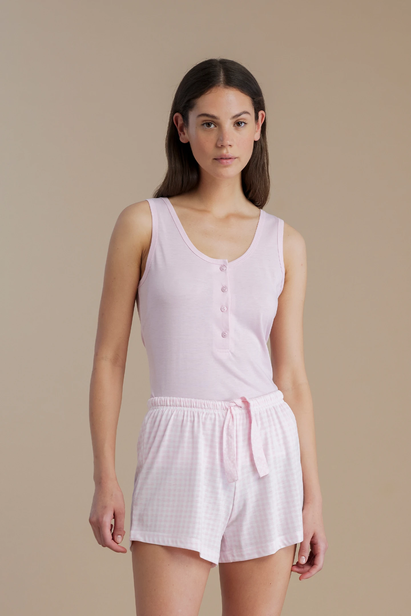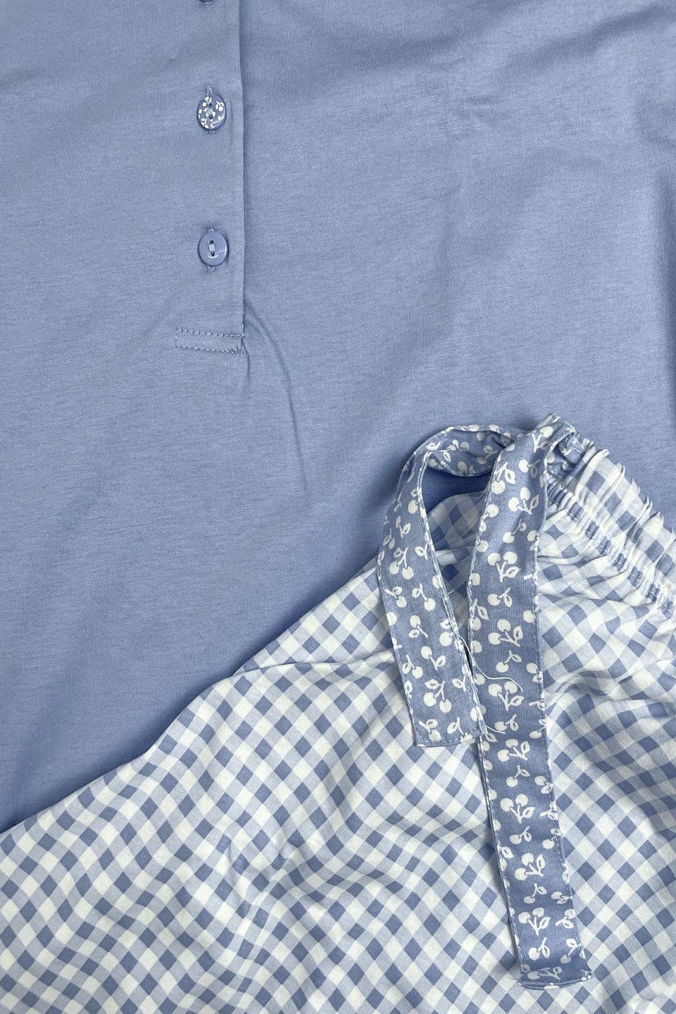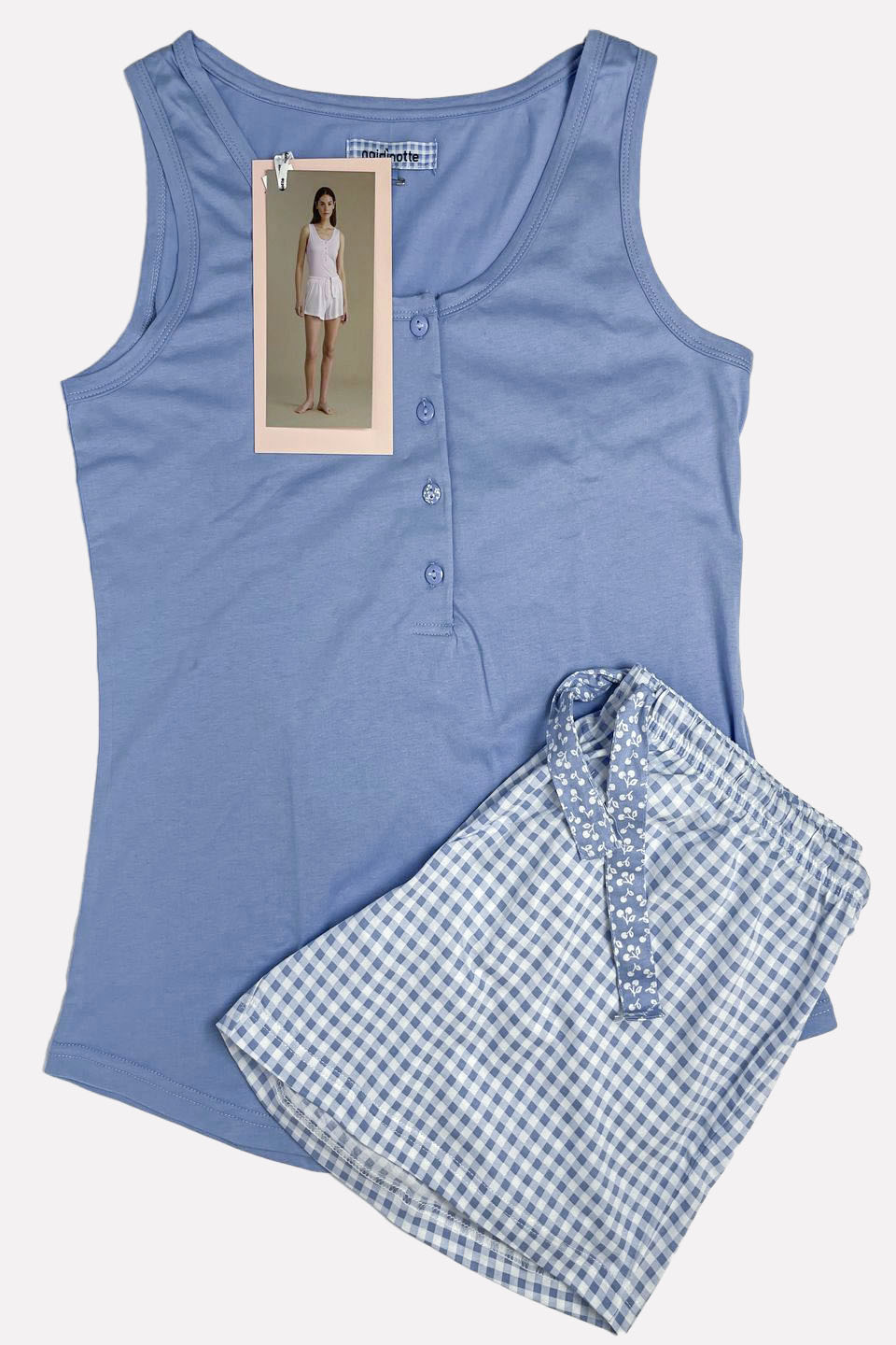 Pigiama donna in 100% cotone. Il top spalla larga con collo quattro bottoni e il pantalone corto con stampa a quadretti è arricchito da un morbido laccetto in vita, ideale per un look fresco.