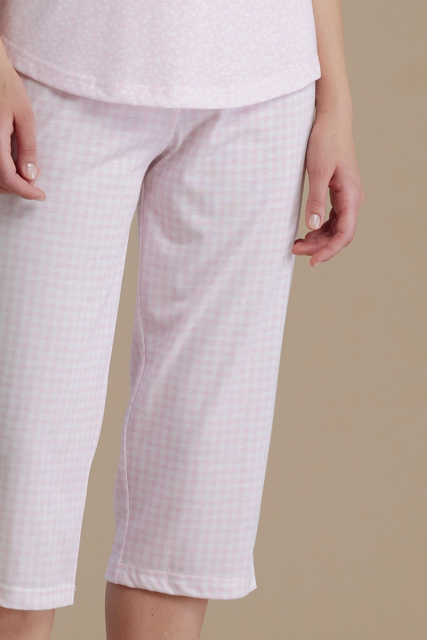 Pigiama donna in 100% cotone. Il top a spalla larga presenta una delicata stampa con ciliegie e il pantalone pescatore con stampa a quadretti aggiunge un tocco classico e romantico.