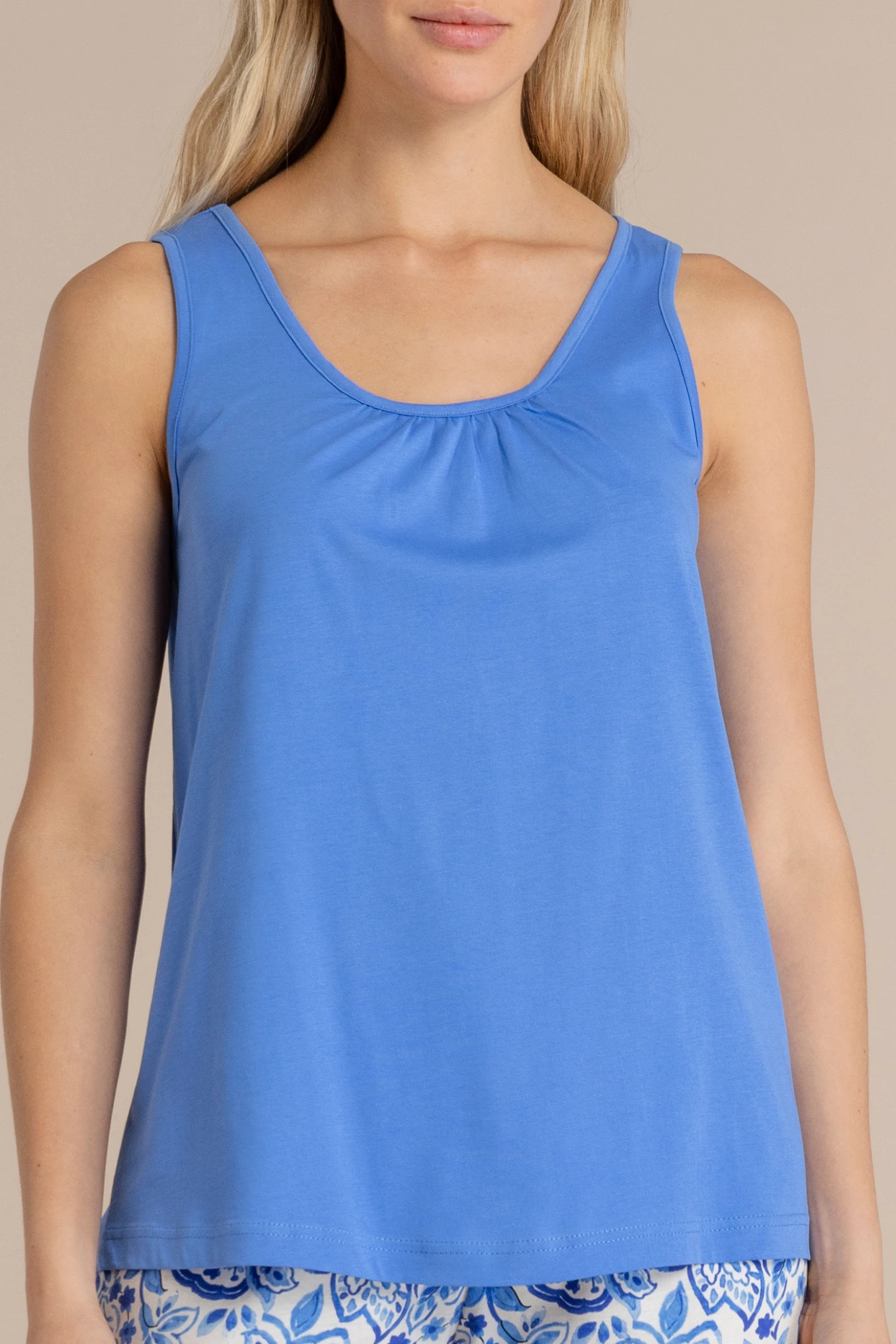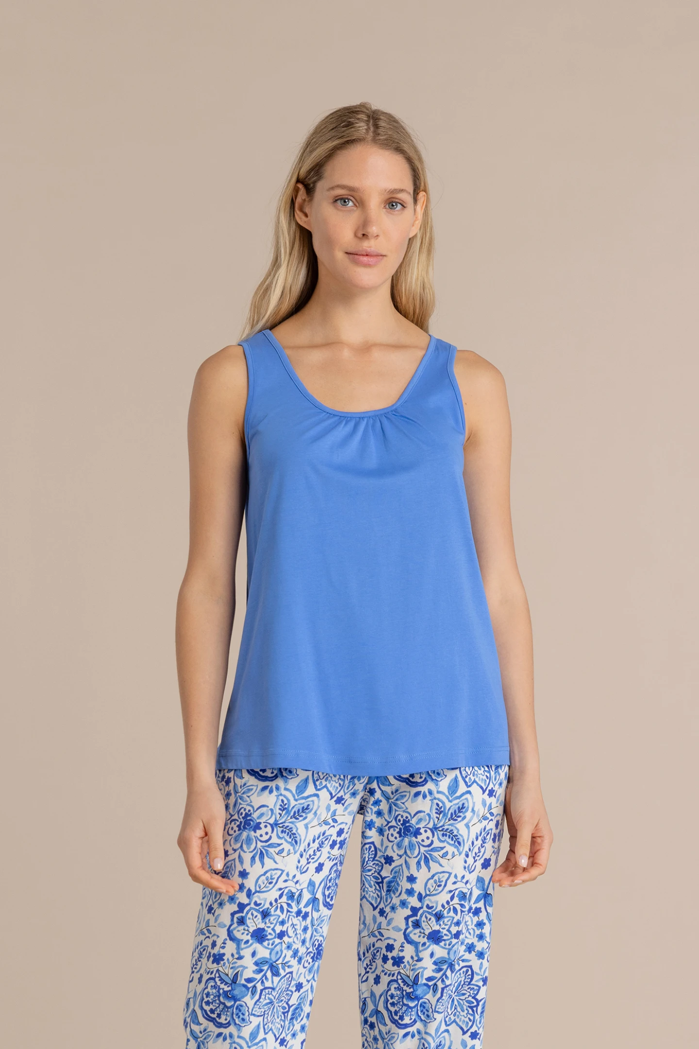 Pigiama donna in 100% cotone con top spalla larga e delicata arricciatura sullo scollo per un tocco femminile. I pantaloni pescatore 3/4, senza polsini, presentano una raffinata stampa floreale nei toni dell’azzurro