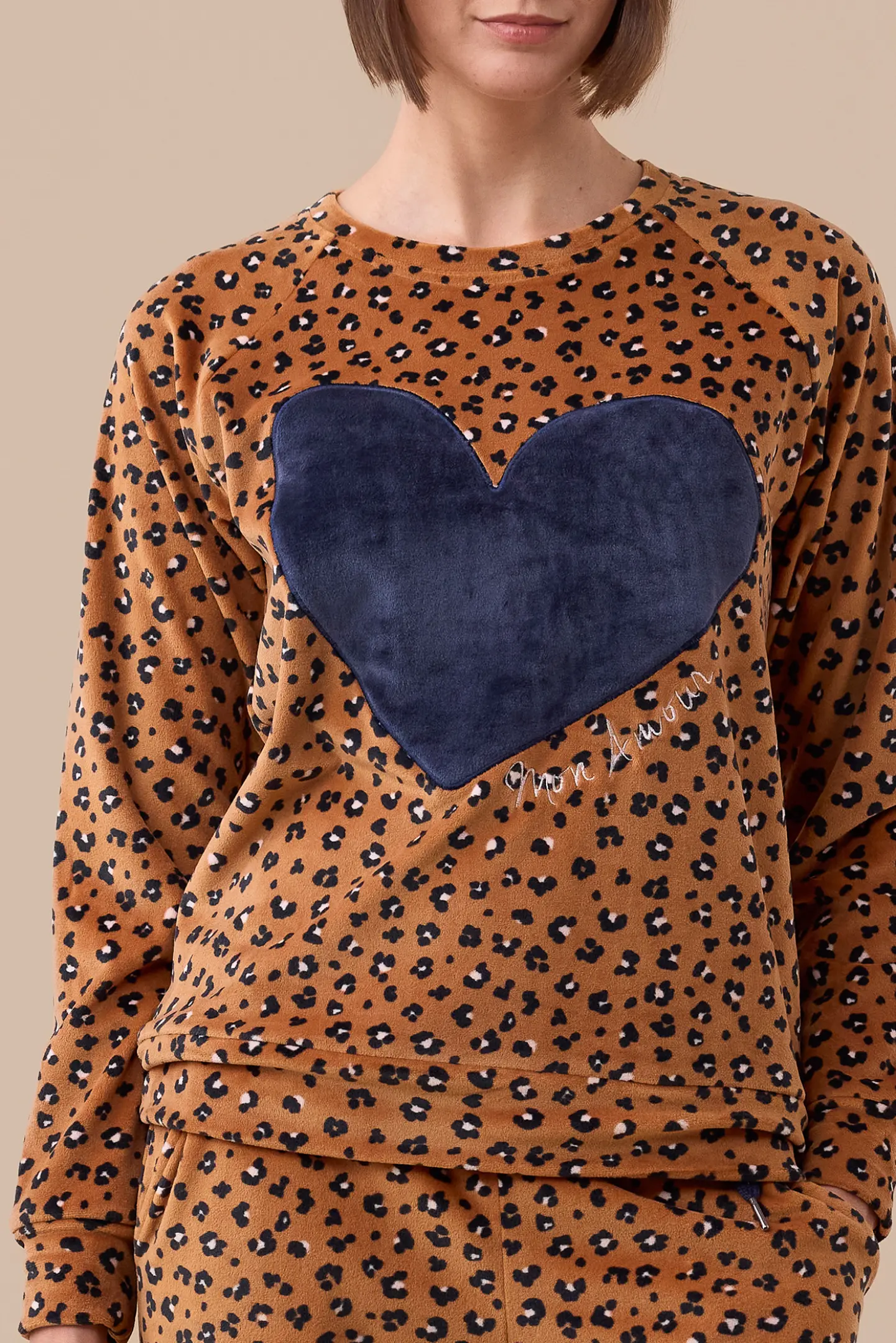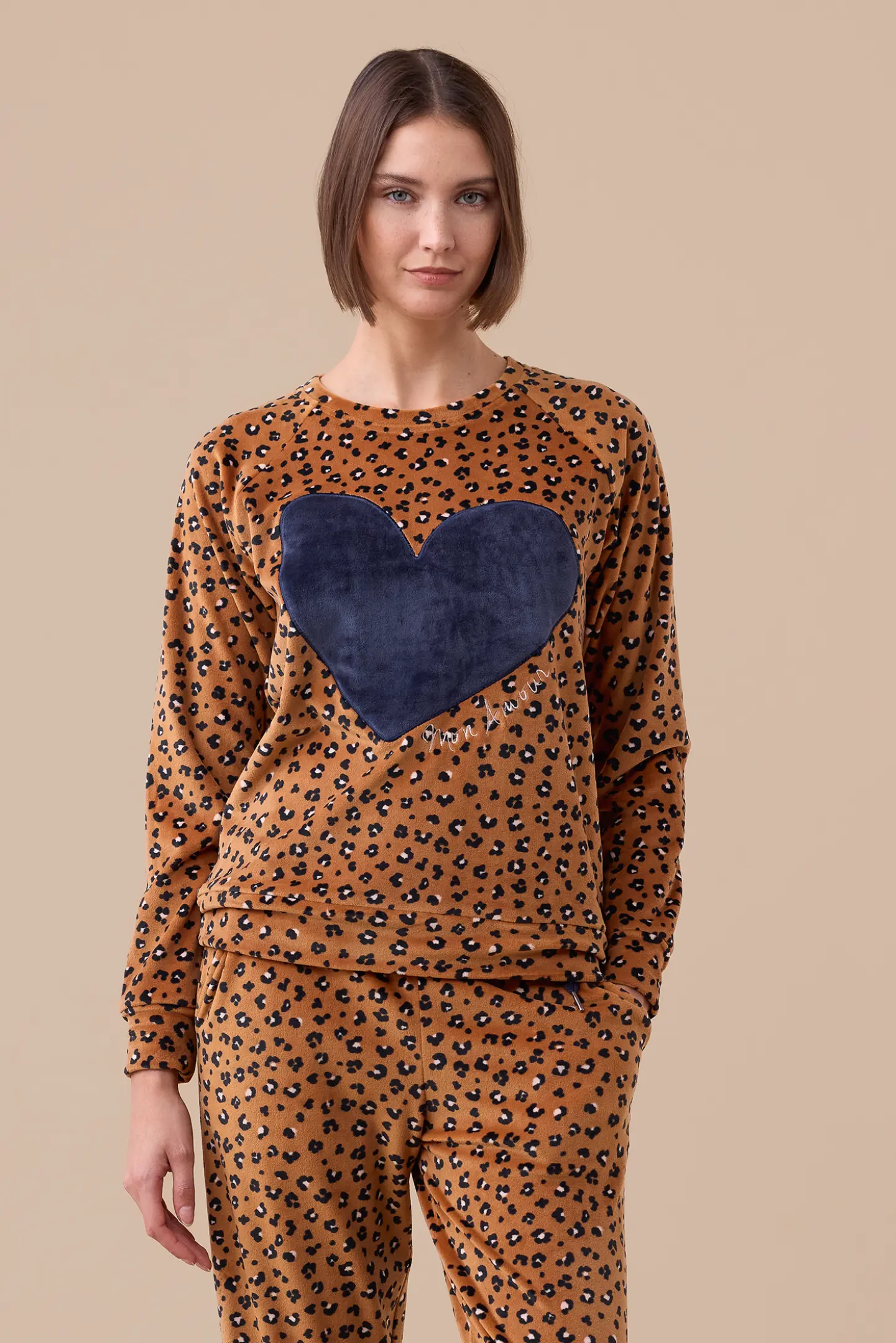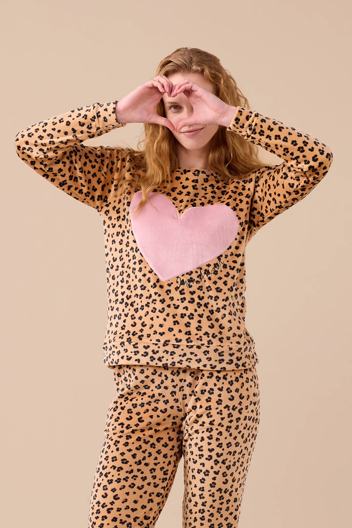 Pigiama donna in ciniglia felpata – soft touch in stampa animalier. Top con applicazione cuore unito. Pantaloni con tasche.