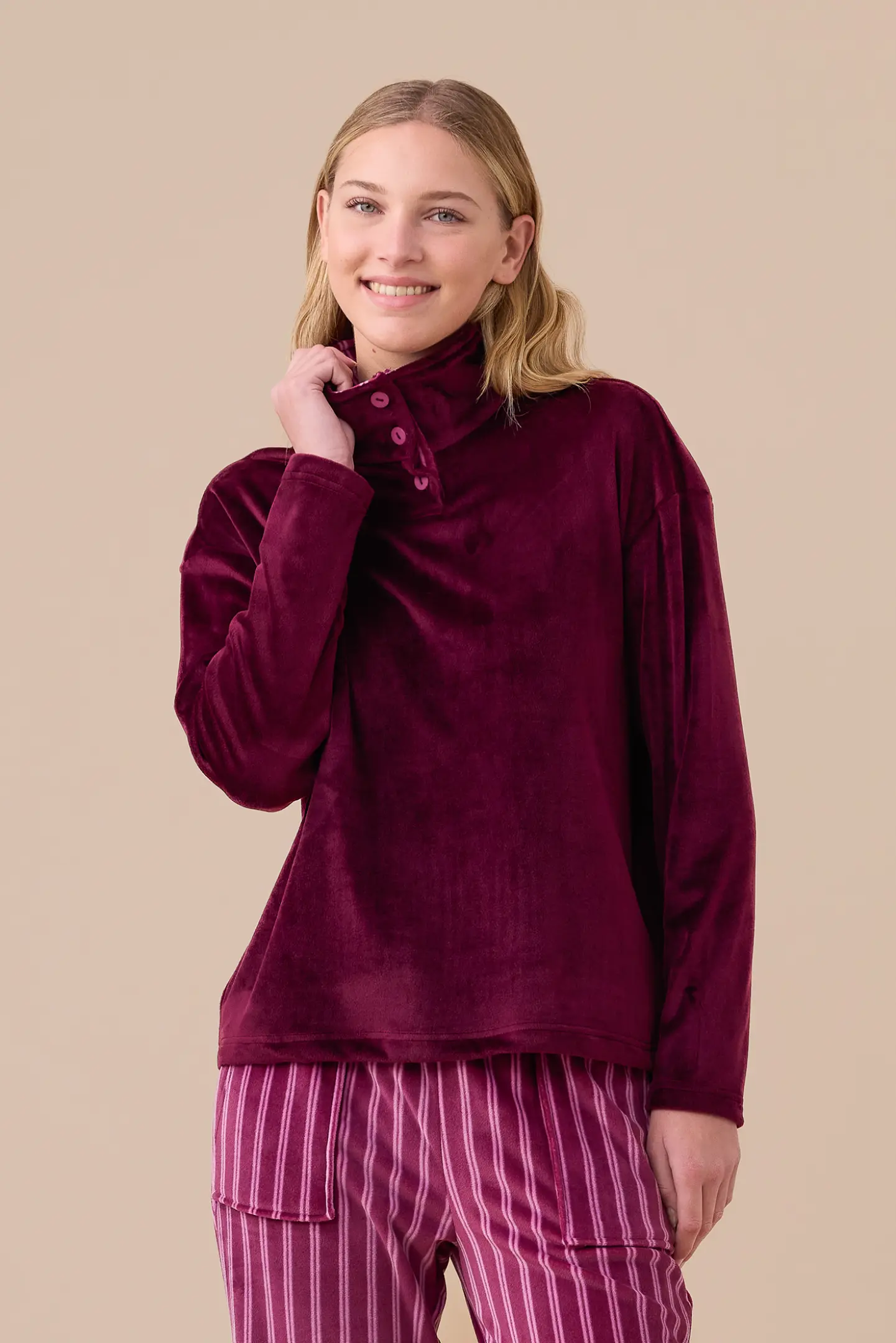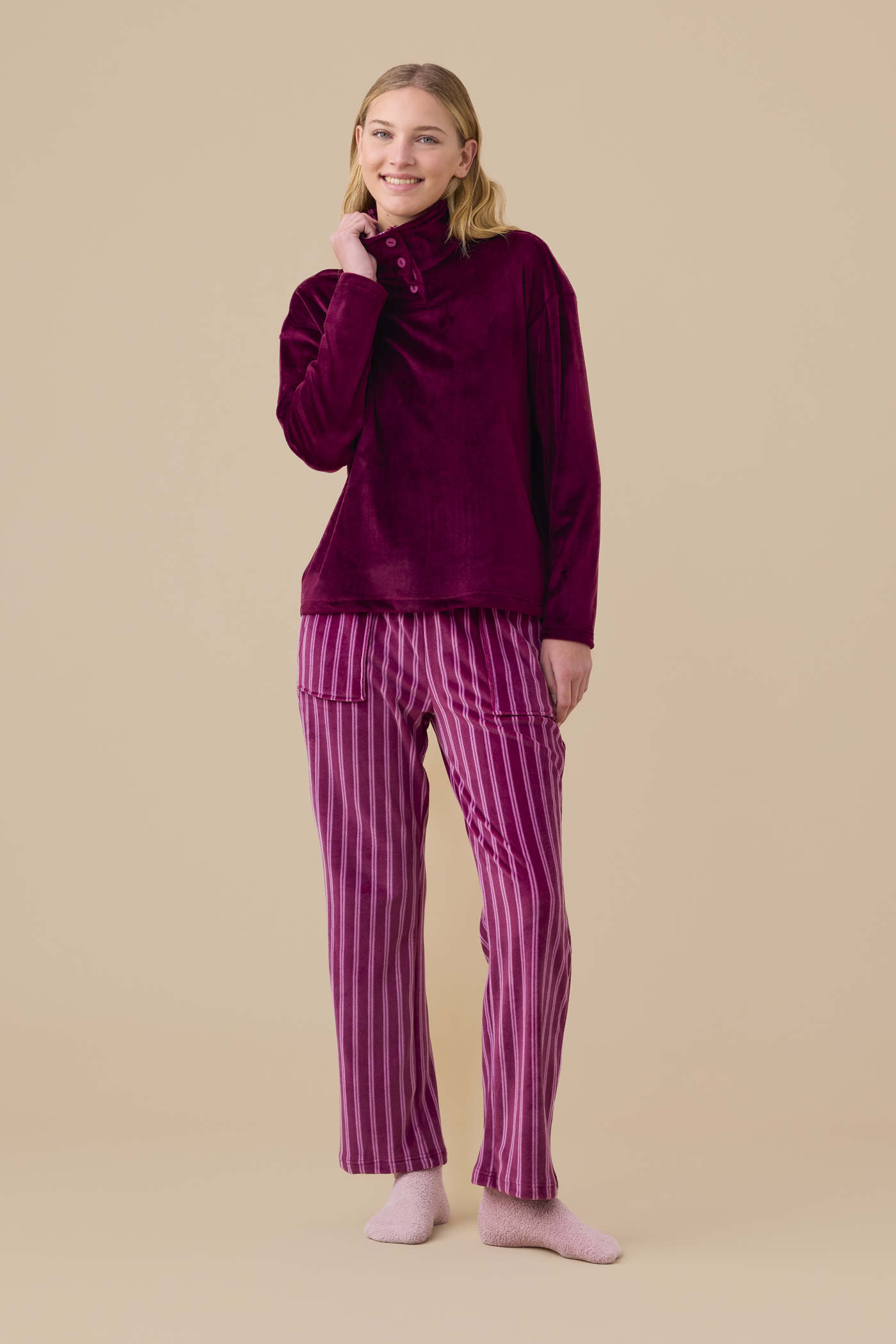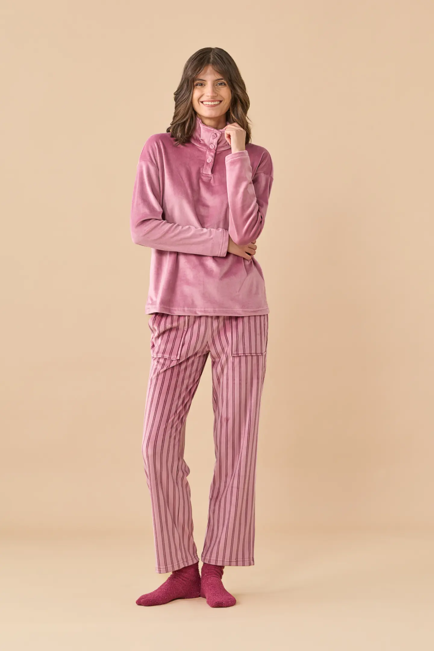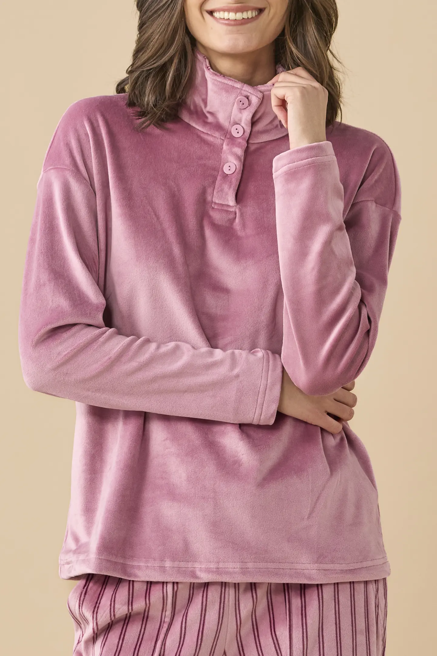 Completo donna in ciniglia felpata – soft touch. Top stampato rigato con collo alto e tre bottoni. Pantaloni uniti con tasche.
