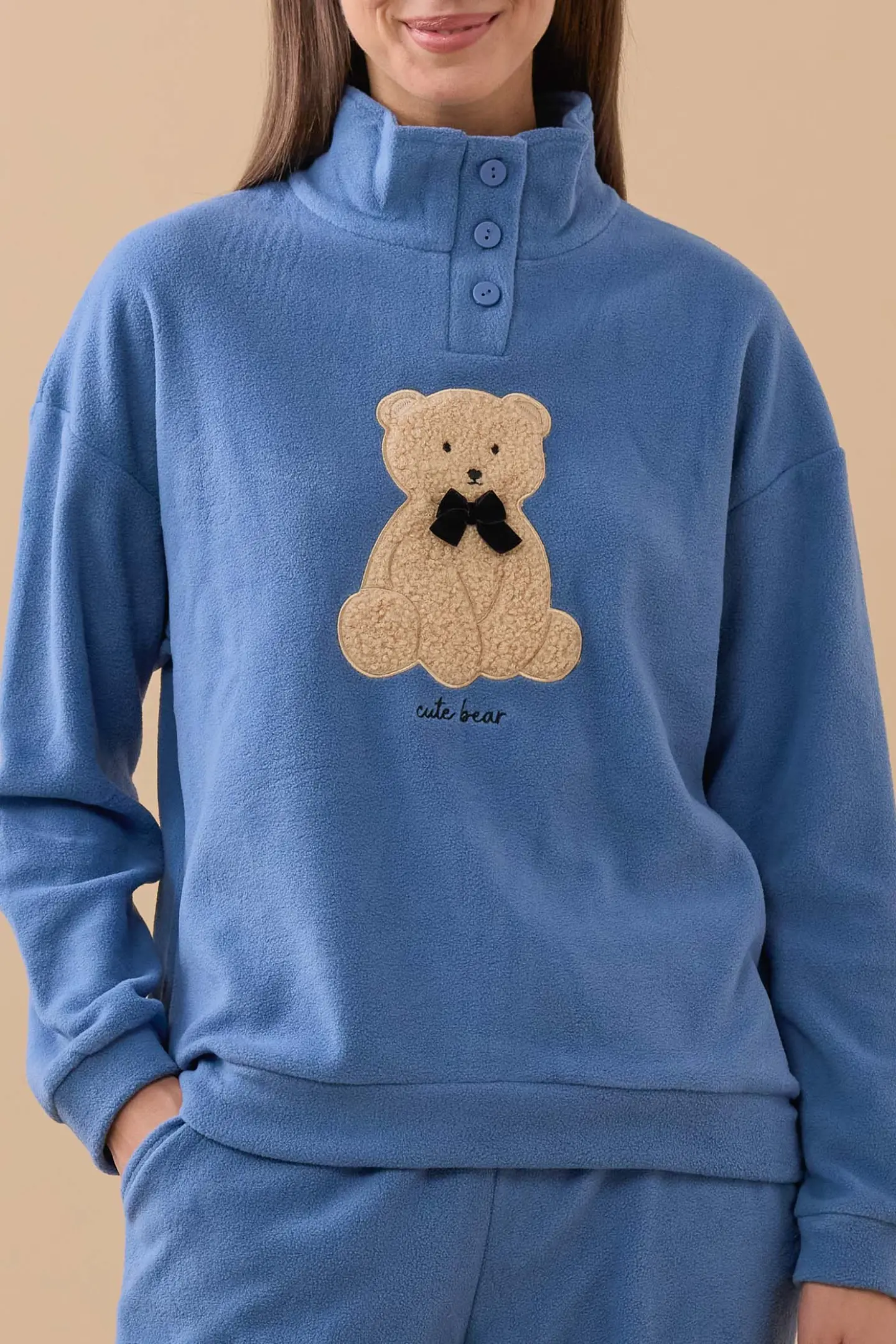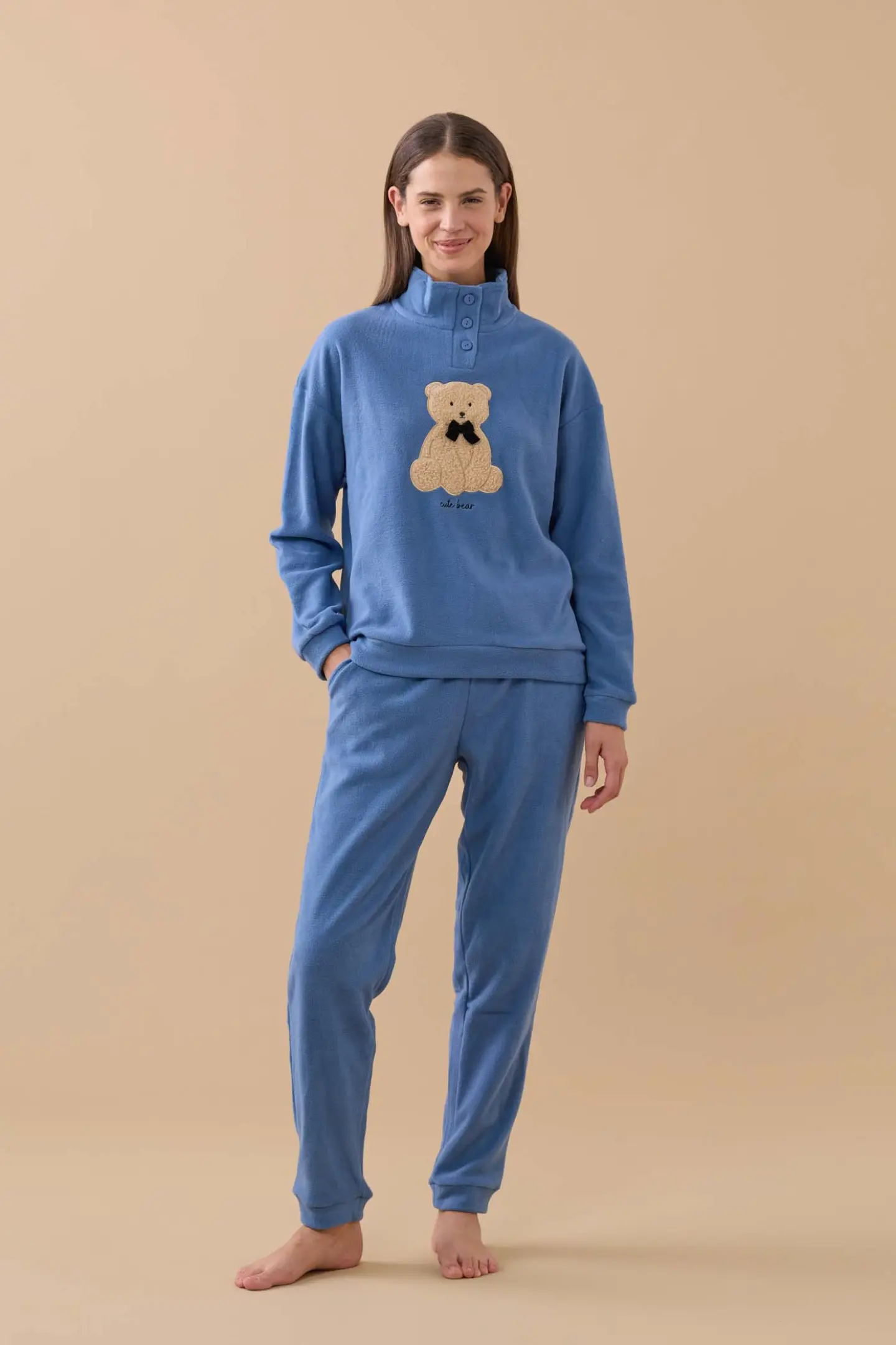 Pigiama donna unito in micropile con collo 3 bottoni ed applicazione con orso e ficco in velluto e pantaloni con polsini sul fondo.