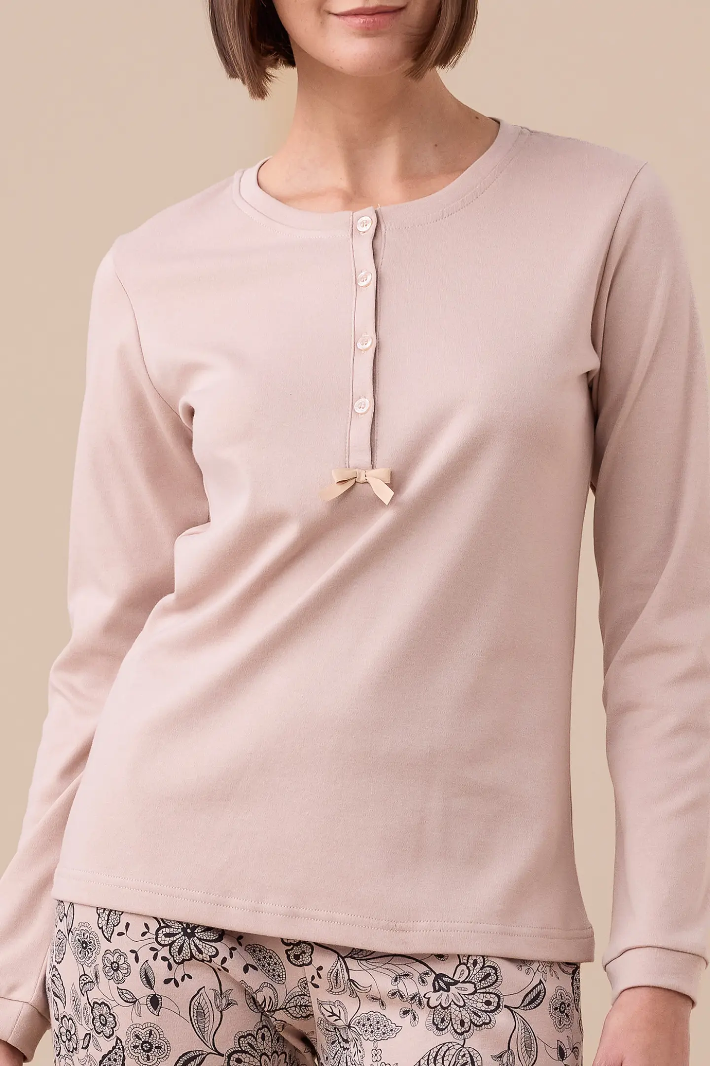 Pigiama donna in caldo cotone. Top unito con collo quattro bottoni e pantaloni stampati con polsini.