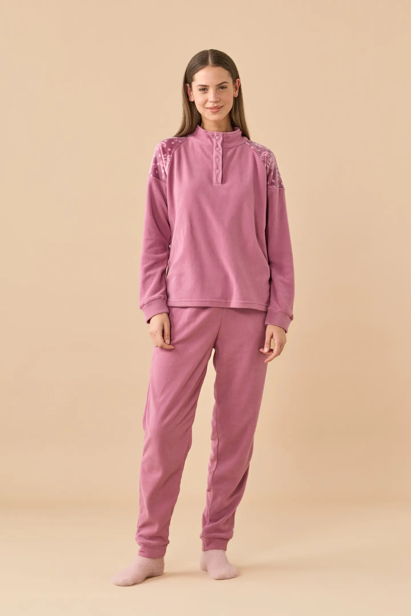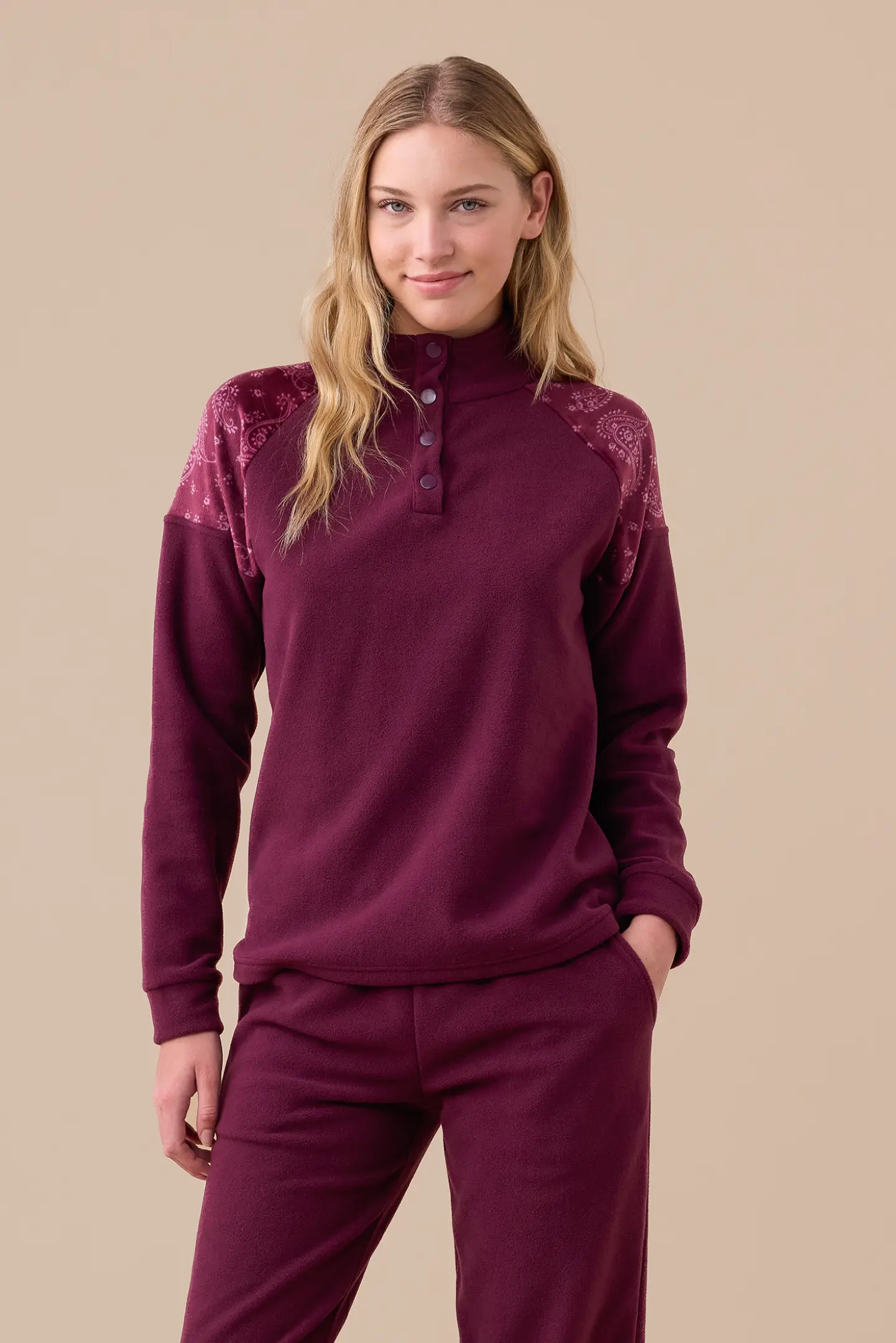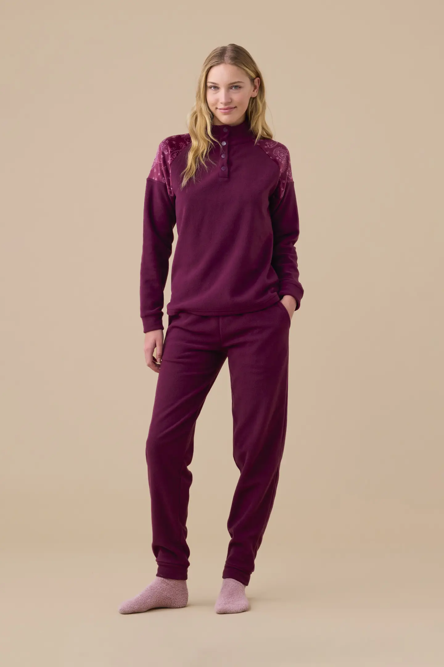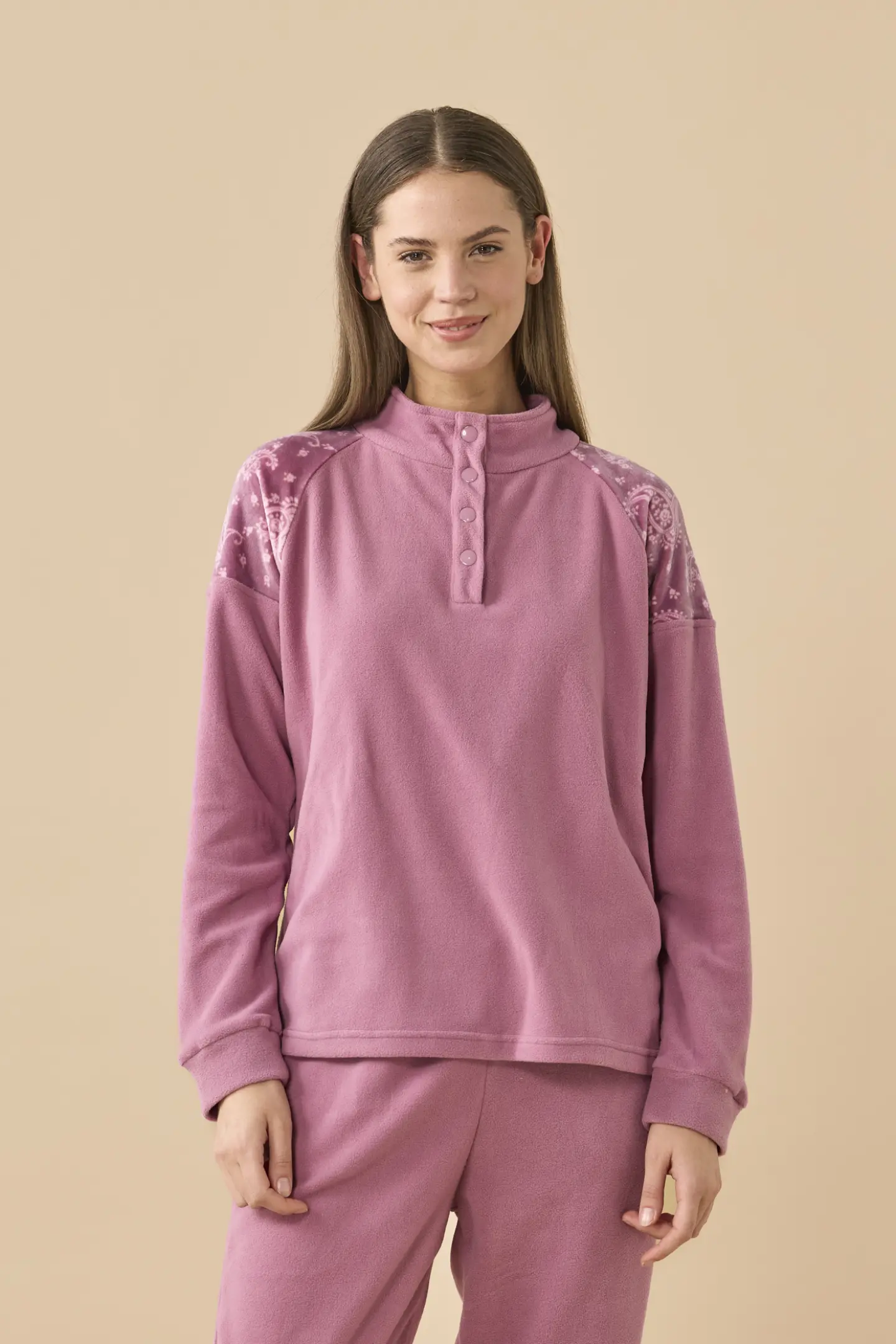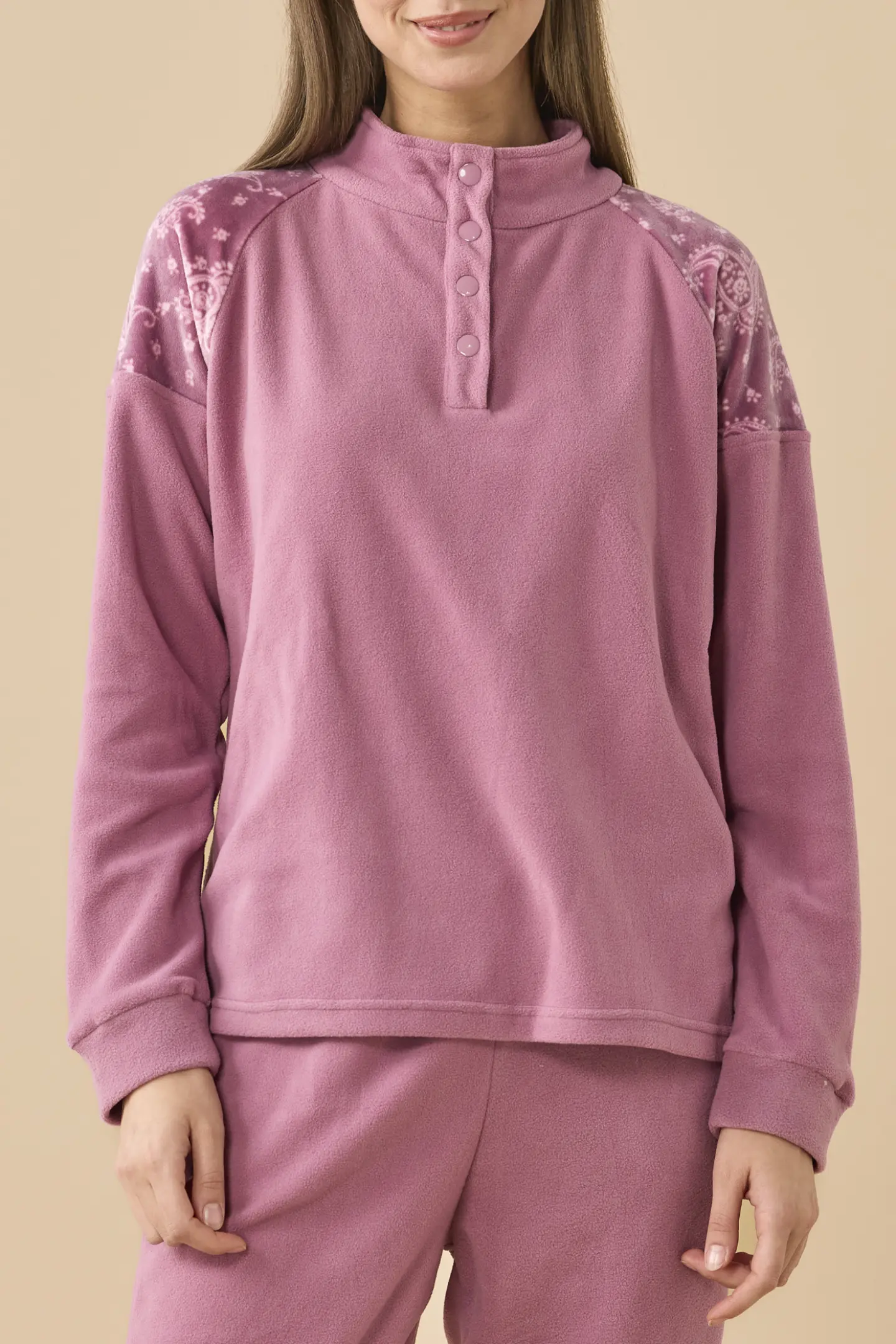 Pigiama in micropile, top collo alto a quattro bottoni tinta unita con inserti in coral stampa cachemire sulle spalle, pantaloni tinta unita con tasche e polsini.