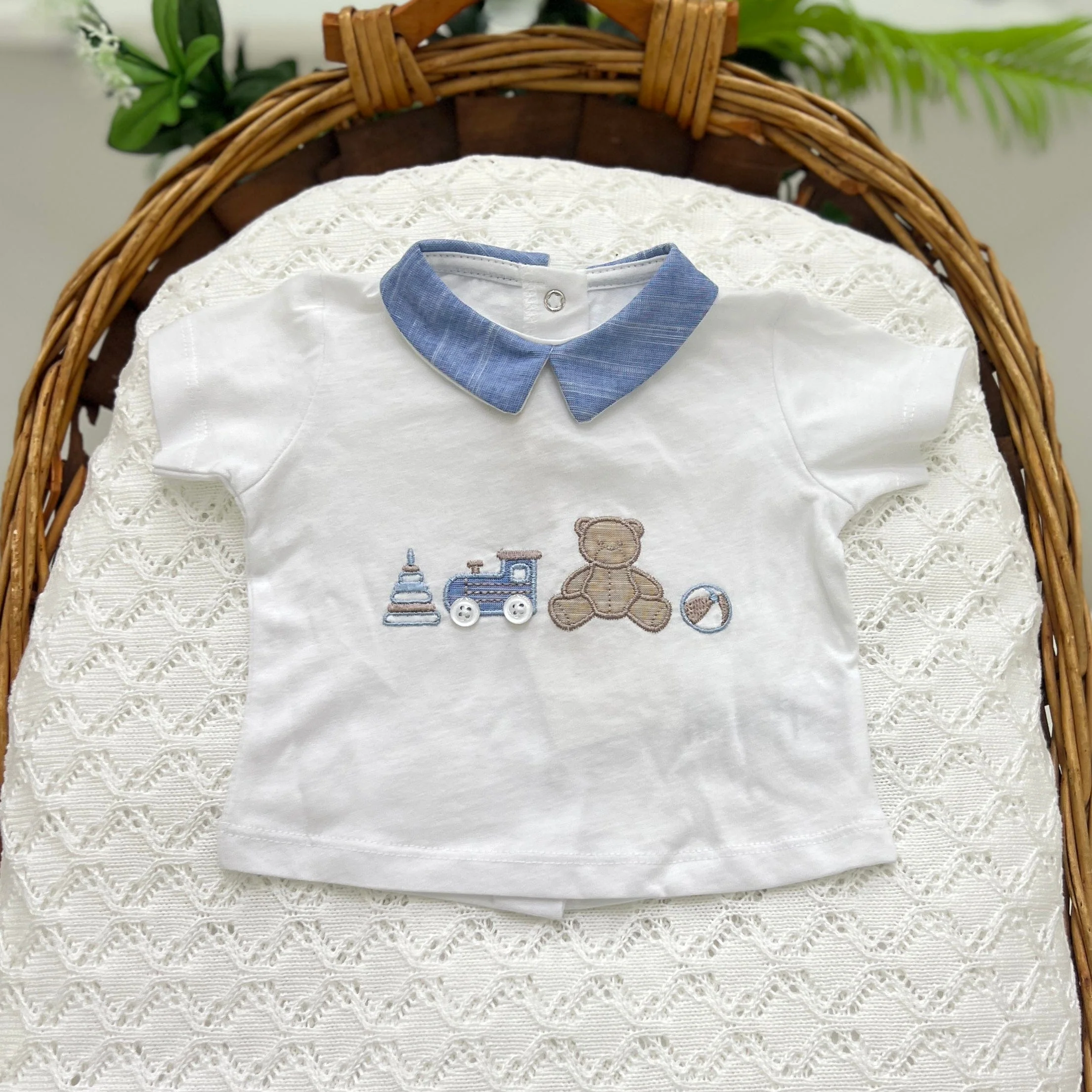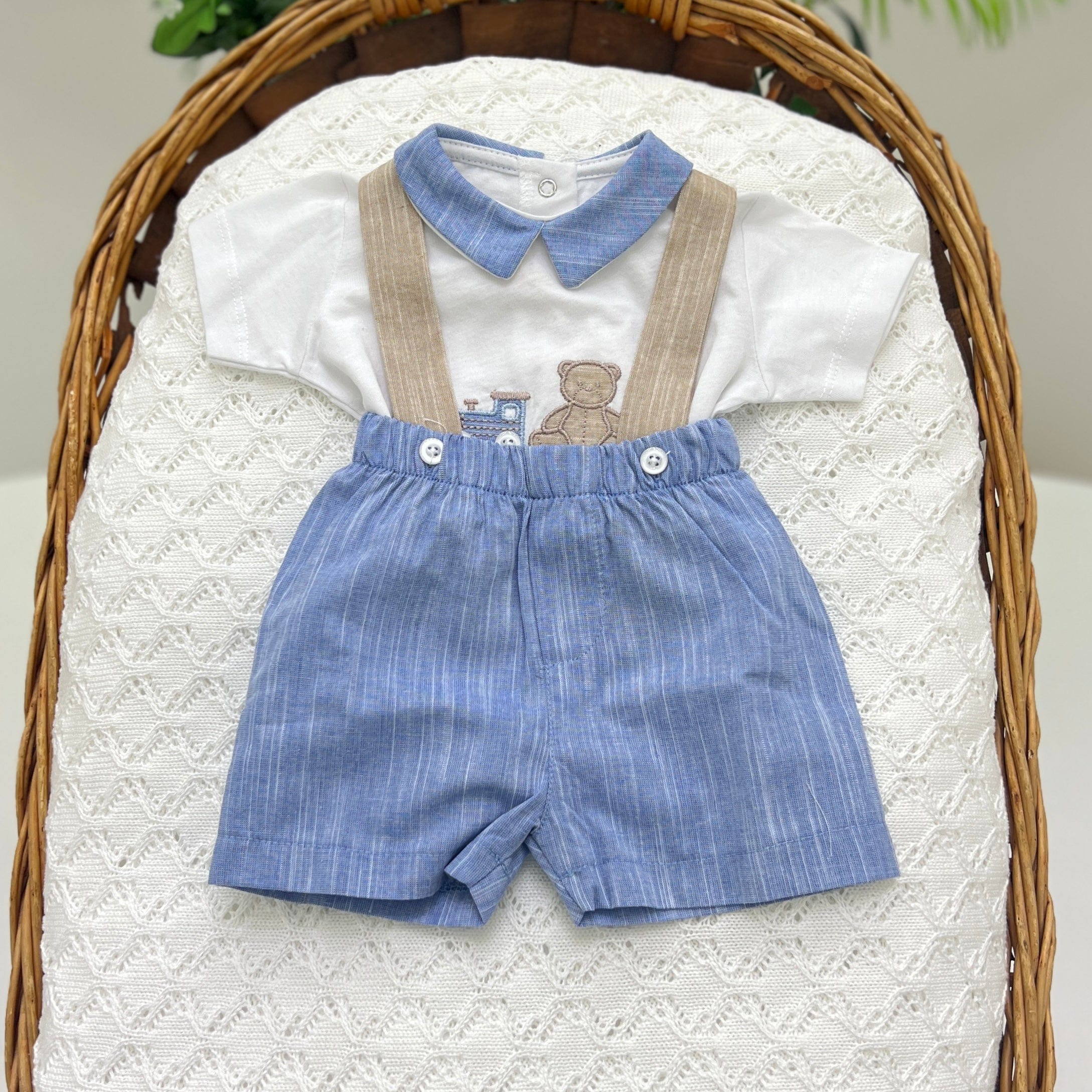 Salopette in 100% cotone con effetto denim, bretelle regolabili e maglia in cotone jersey. Il colletto e il ricamo aggiungono un tocco raffinato, ideale per le occasioni speciali.