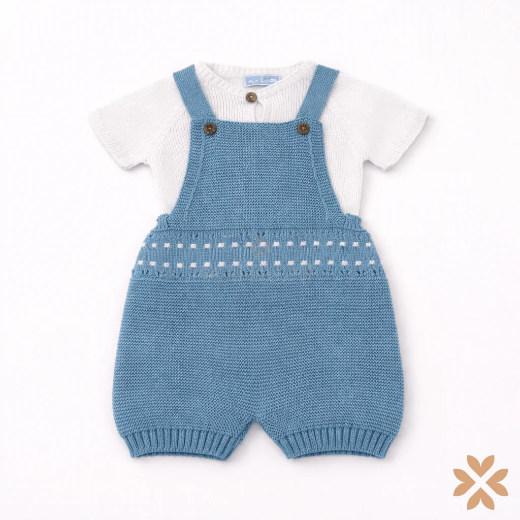 Completo in filo di cotone composto da salopette corta con bretelle e maglia a manica corta coordinata. Dettagli traforati e bottoni decorativi. comp: cotone/acrilicocod art: 0042 / oasis