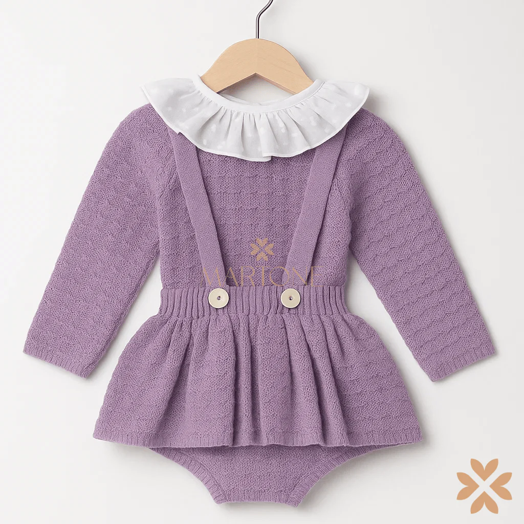 Completino neonata in maglia lilla, composto da maglia a maniche lunghe con lavorazione a punto e colletto bianco in tessuto leggero, abbinata a gonnellina con bretelle e bottoni frontali.