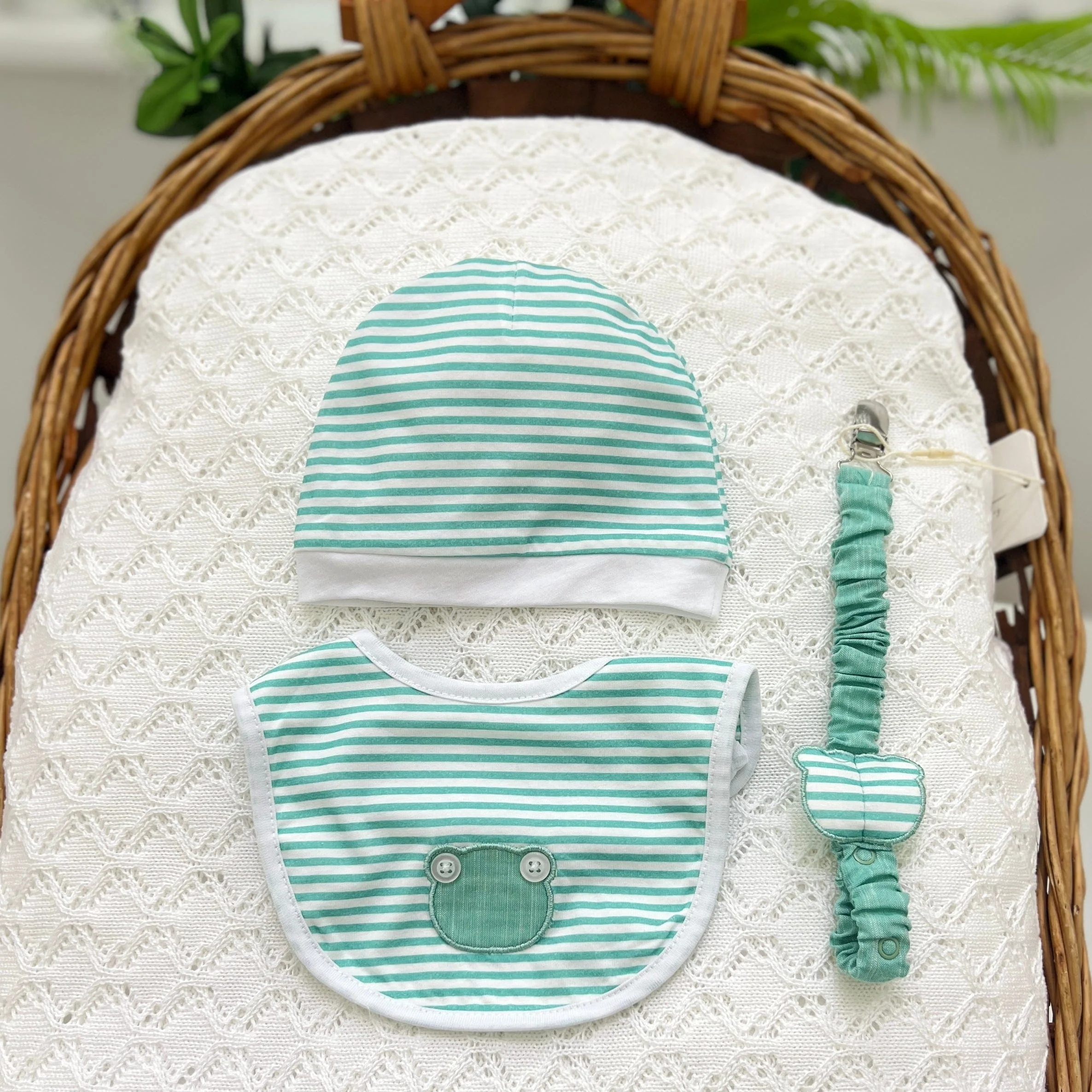 Set accessori neonato composto da cappello, bavetta e portaciuccio. Eleganza e praticità per completare ogni look del tuo piccolo. COD ART: 25N495