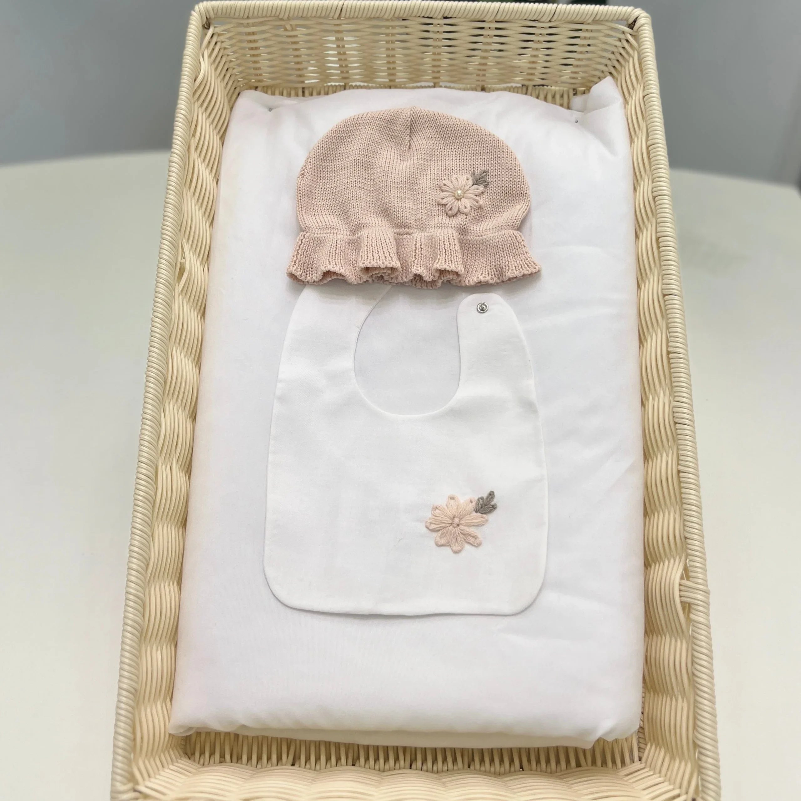 Set coordinato accessori cappello e bavetta per neonata.