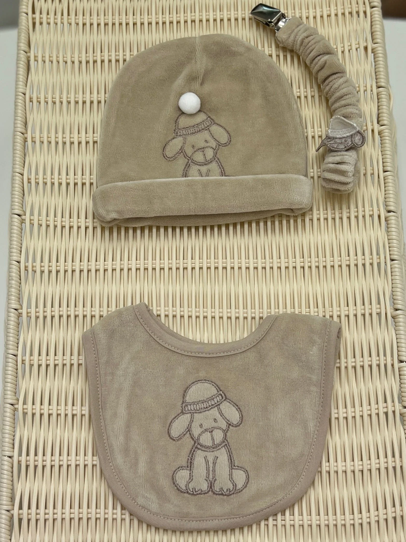 Questo set di accessori è realizzato in morbida ciniglia e comprende cappellino, bavetta e portaciuccio per offrire al tuo piccolo comfort e calore senza rinunciare allo stile.