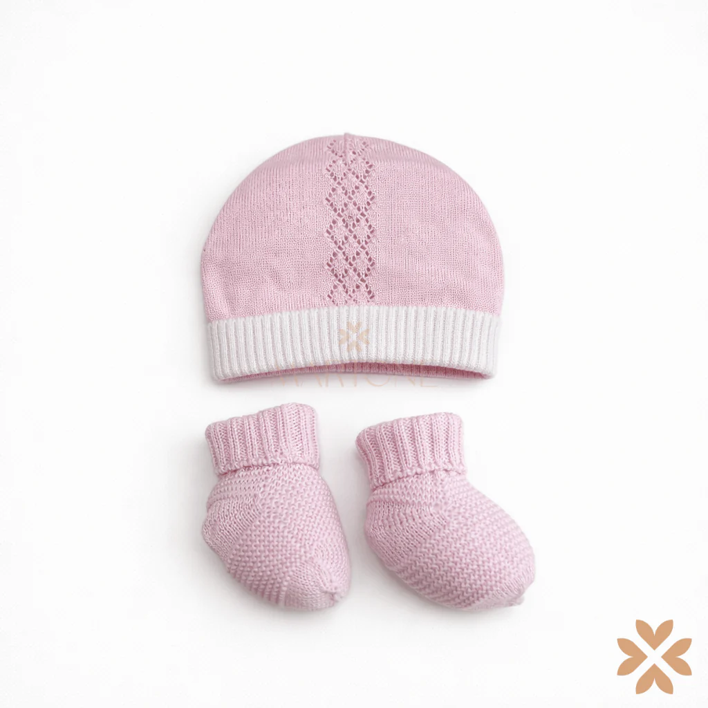Set Coordinato di accessori per neonata composto da cappellino in filo di cotone e babbucce, morbide ed avvolgenti, ideale per completare ogni outfit già dalla prima infanzia.