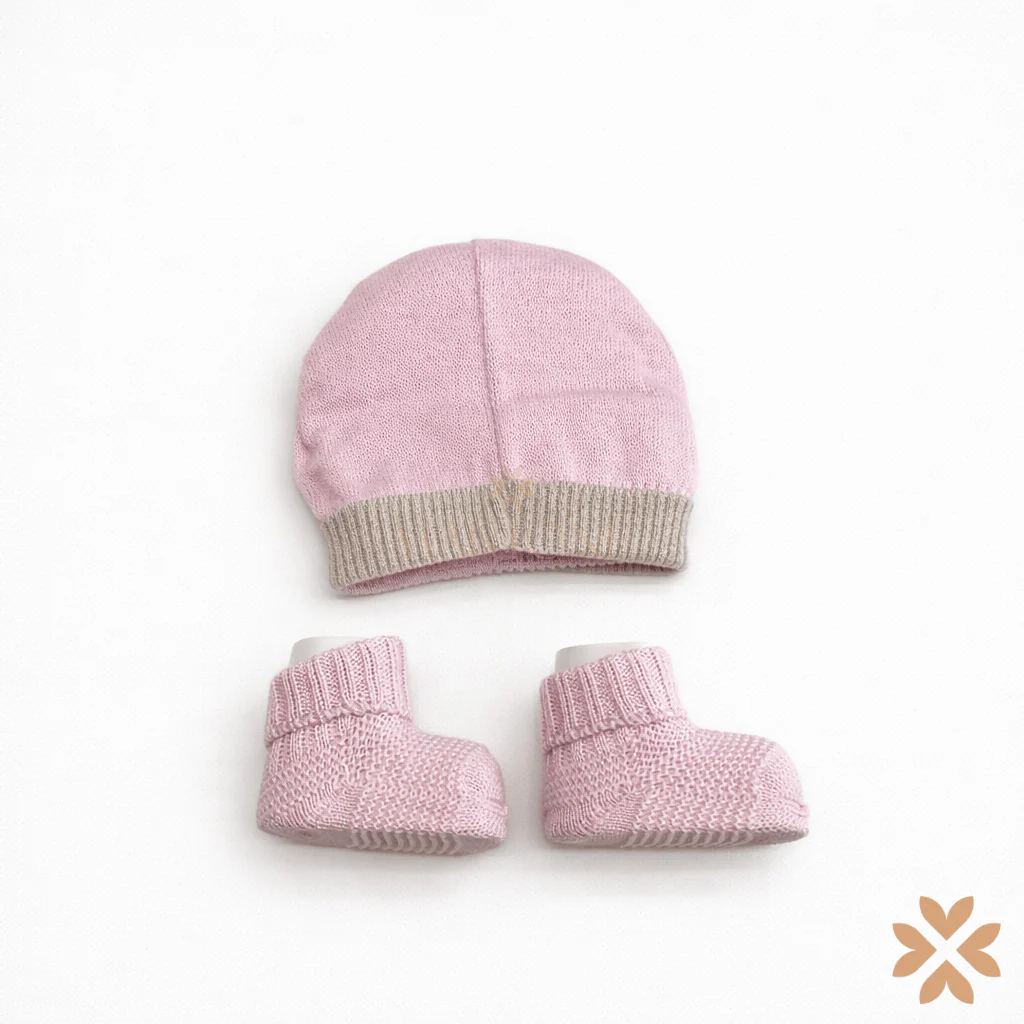 Set Coordinato di accessori per neonata composto da cappellino in filo di cotone e babbucce, morbide ed avvolgenti, ideale per completare ogni outfit già dalla prima infanzia.