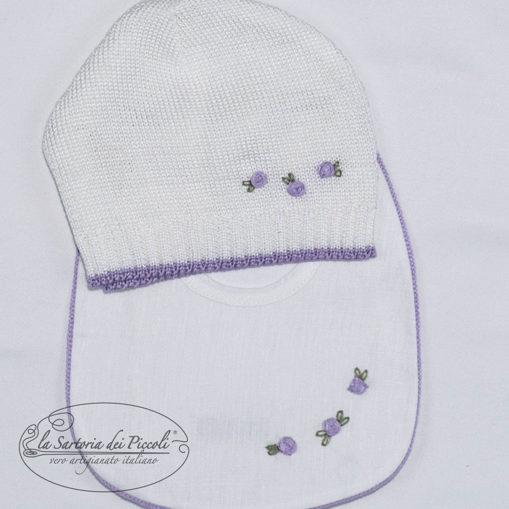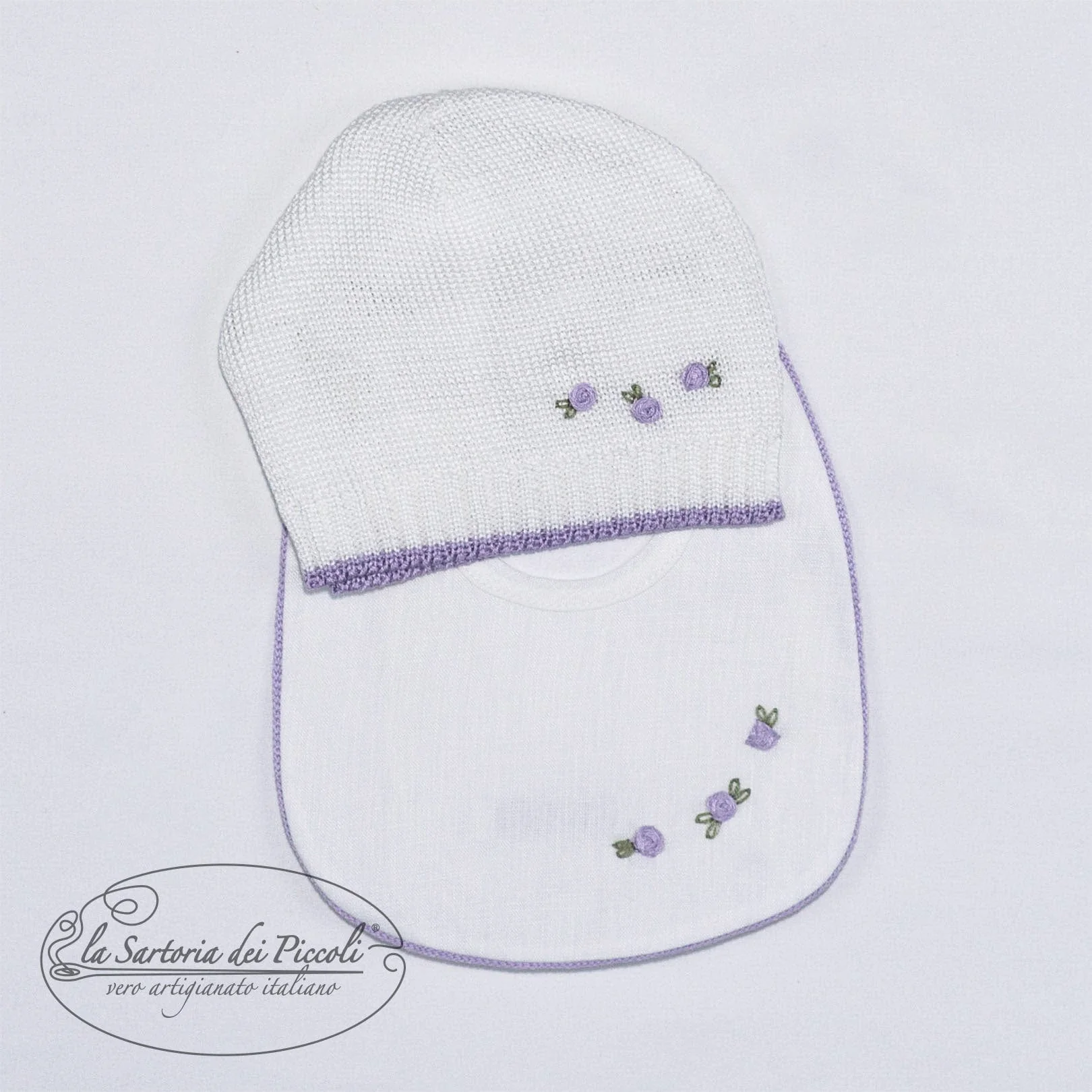 Set composto da cappellino in filo di cotone e bavetta, entrambi decorati con roselline a vapore ricamate a mano. Un accostamento elegante e delicato, pensato per completare con raffinatezza il look della tua neonata. 100% cotonecod art: LR1006
