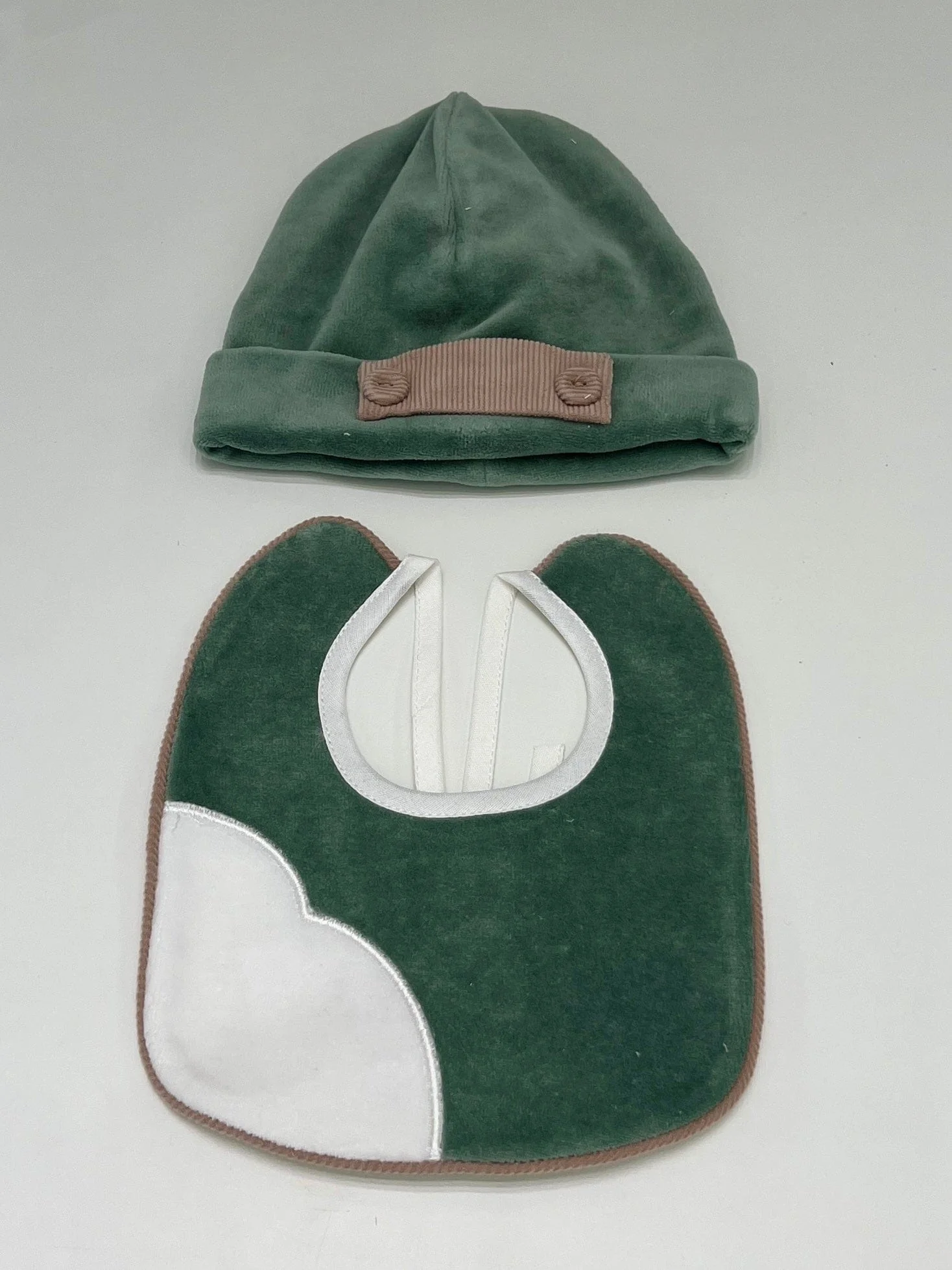 Questo set invernale per neonato include una bavetta e un cappello realizzati in morbida ciniglia color verde salvia. Entrambi i pezzi offrono una calda protezione durante i mesi freddi, con un design elegante e accogliente, perfetto per mantenere il tuo piccolo al caldo.