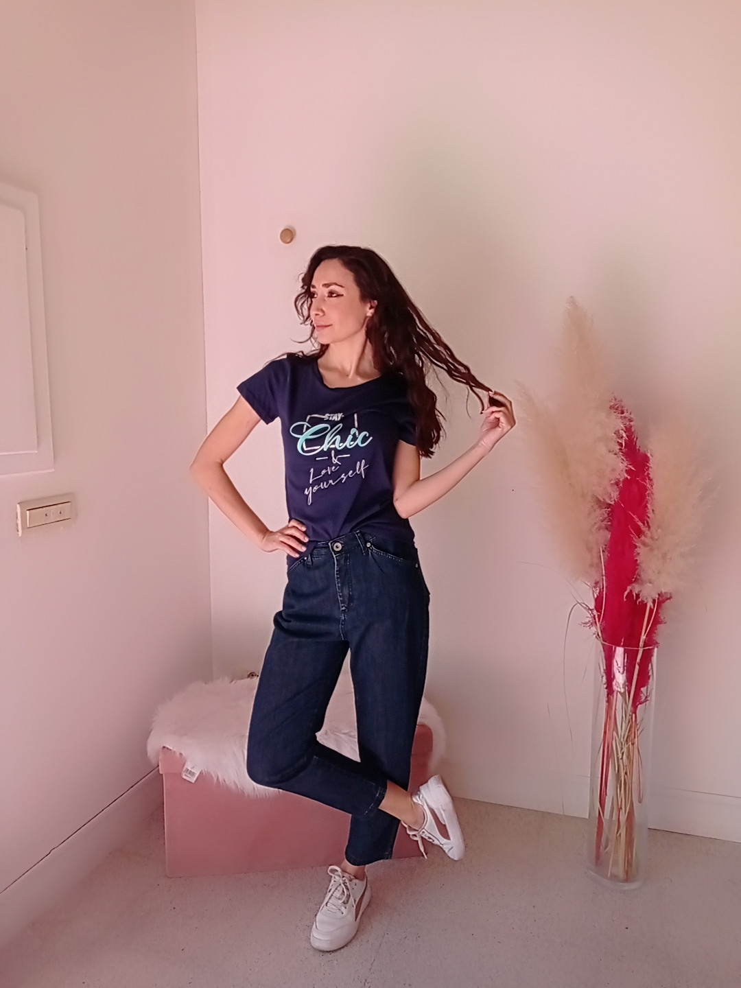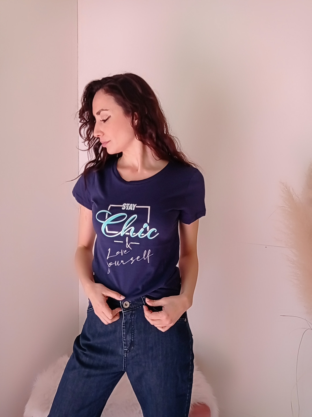 T-Shirt Blu “Stay Chic & Love Yourself” – Semplice, Elegante e di Tendenza!