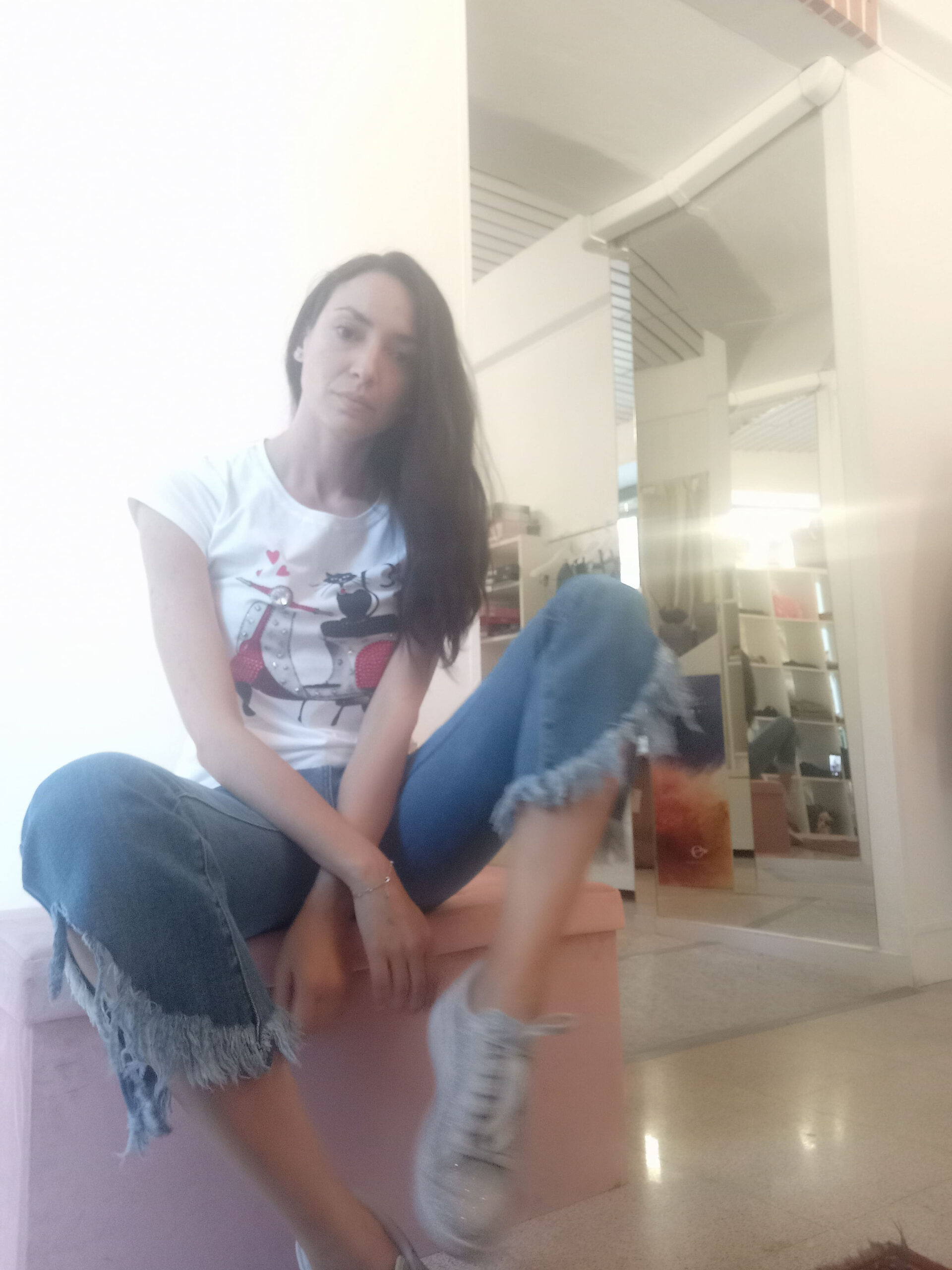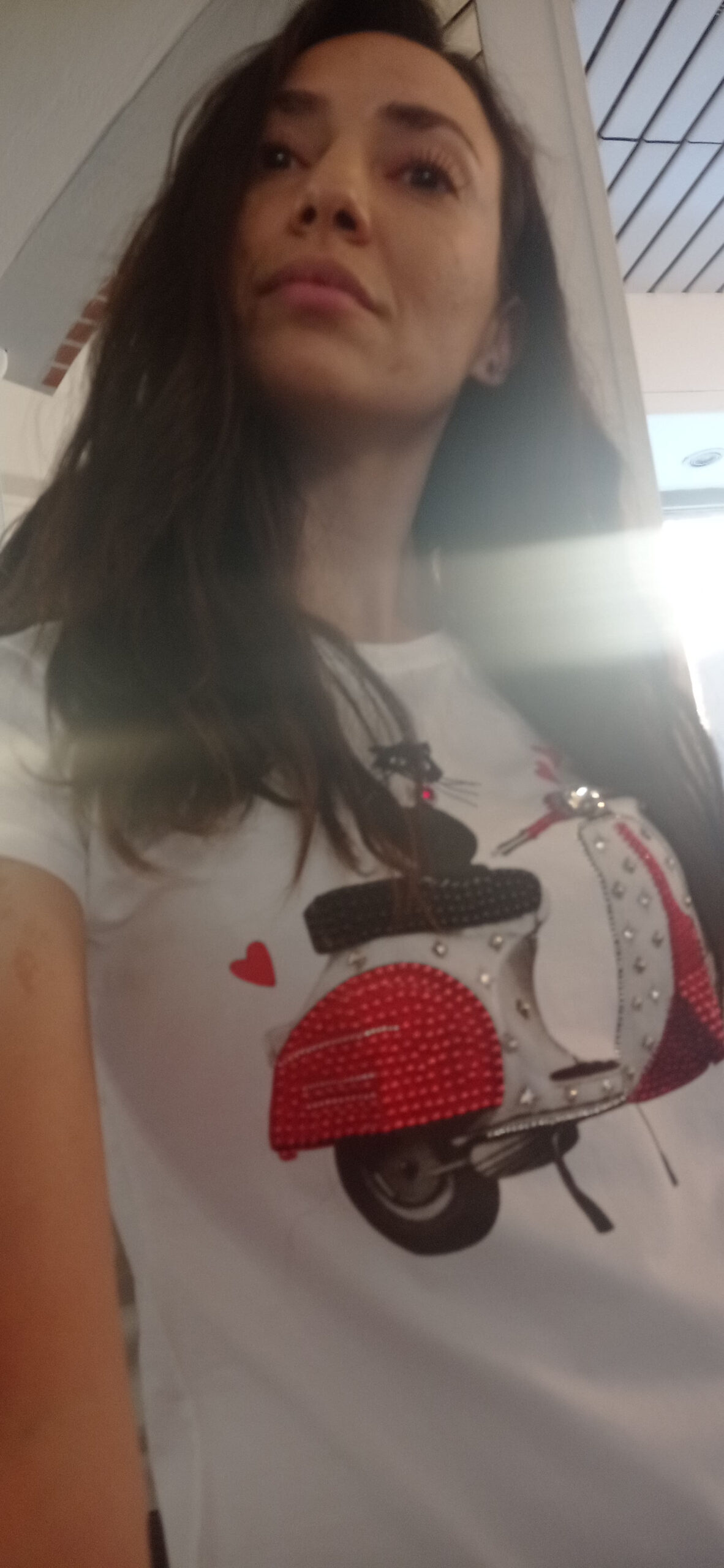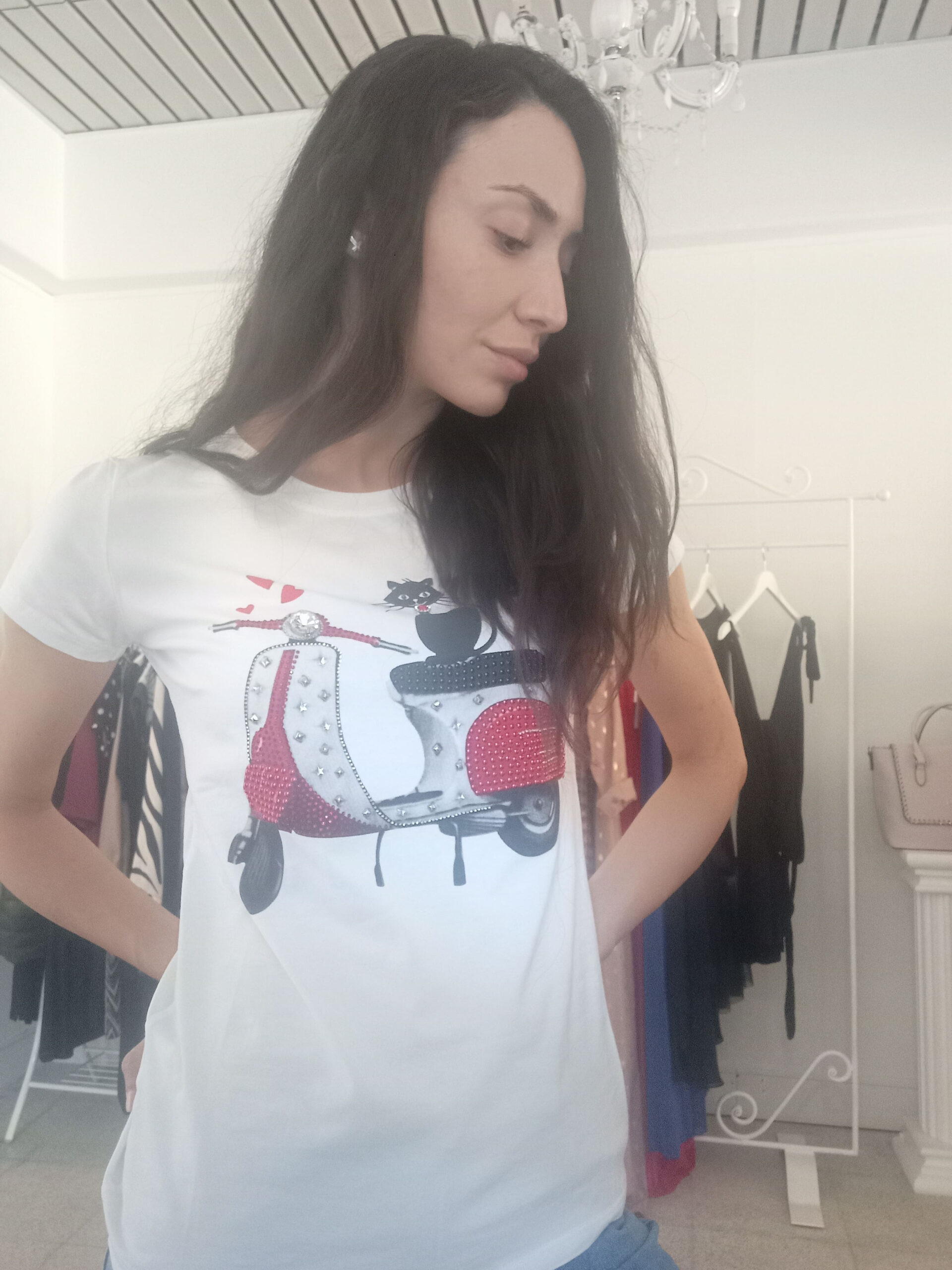 T-shirt con gattino su Vespa rossa e strass – taglia unica, originale e super richiesta.
