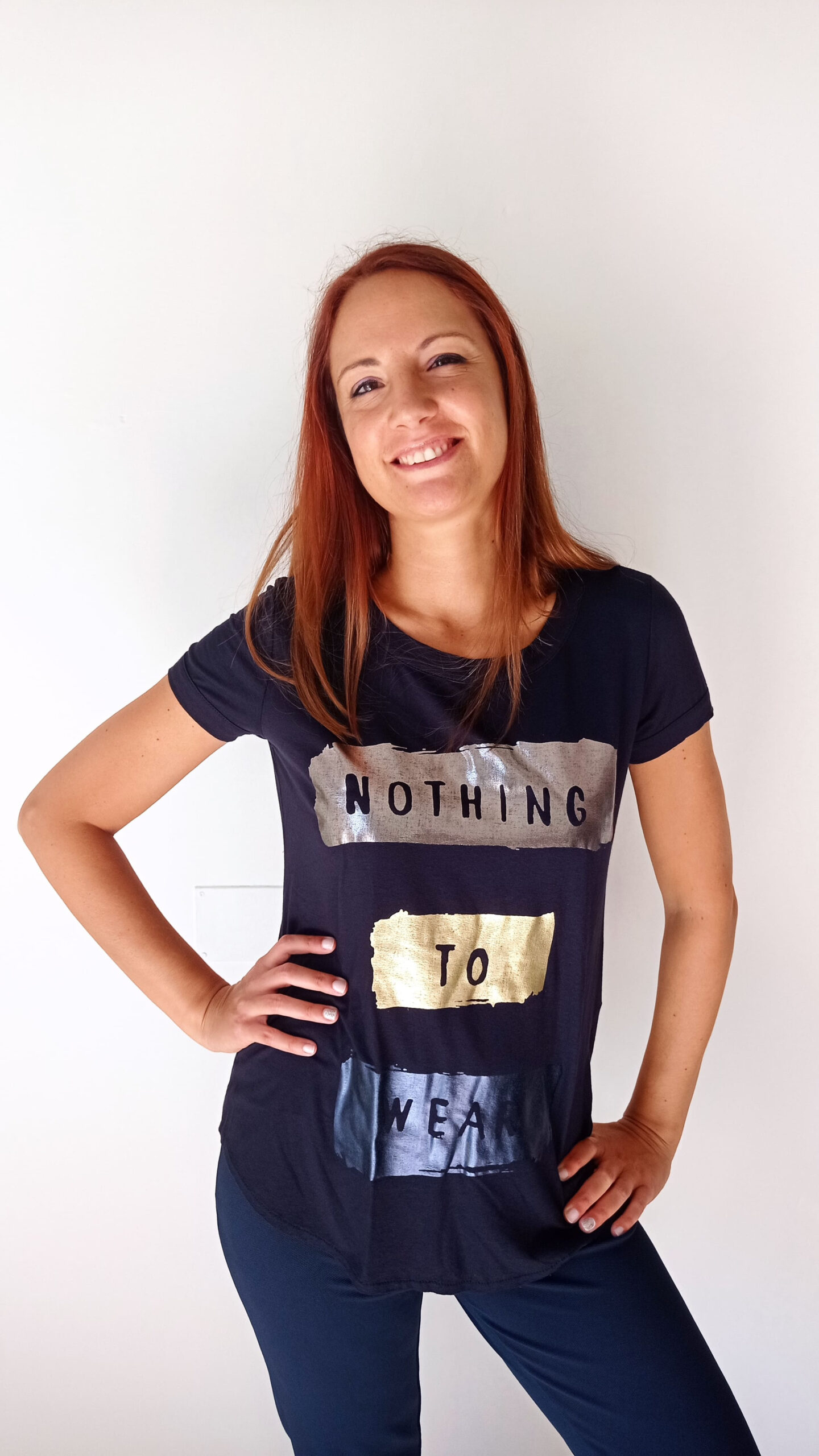 Il colore blu intenso aggiunge un tocco di freschezza e originalità al tuo look. La scritta audace ‘Nothing to Wear’ è il tocco divertente che ti farà sorridere e sentire pronta ad affrontare qualsiasi situazione.