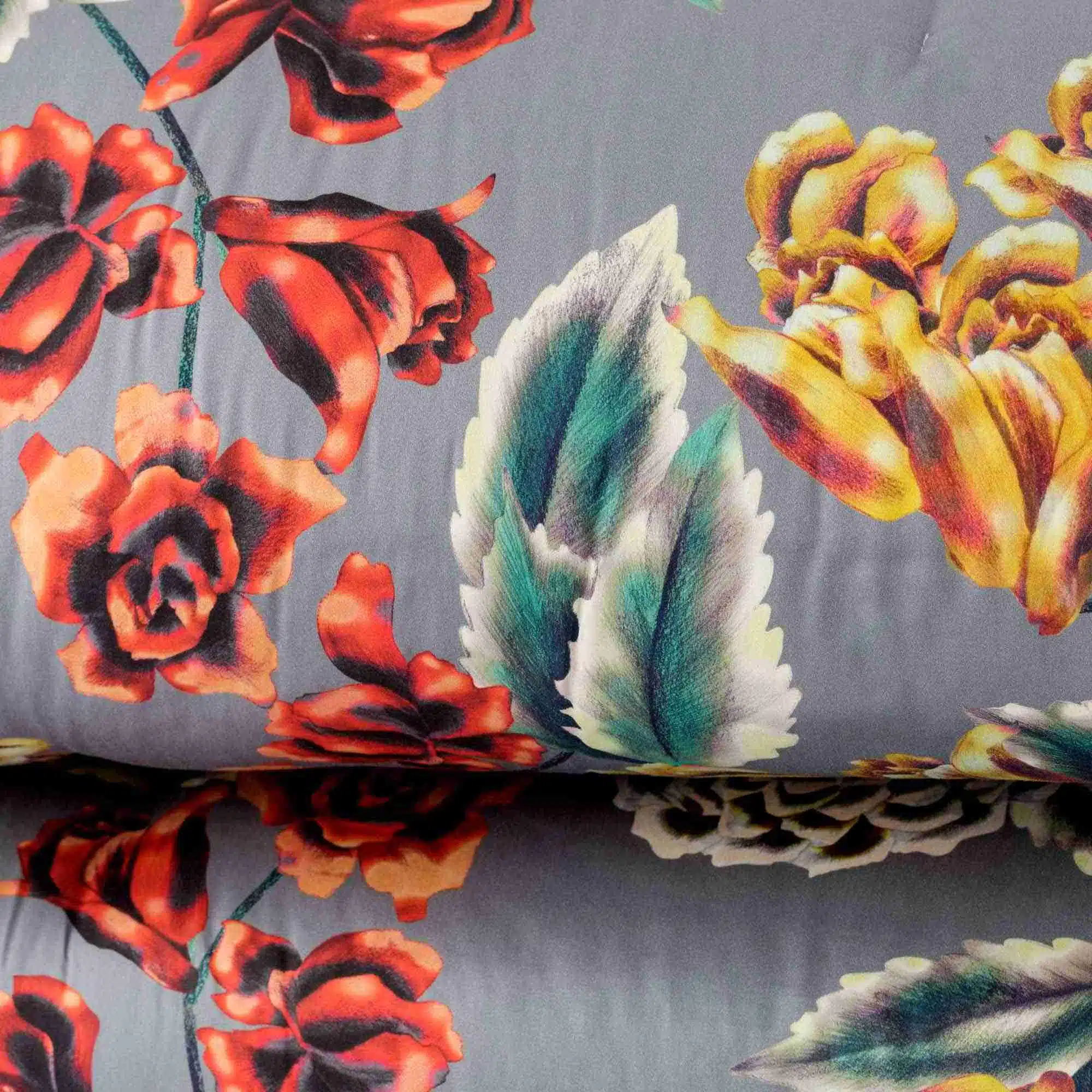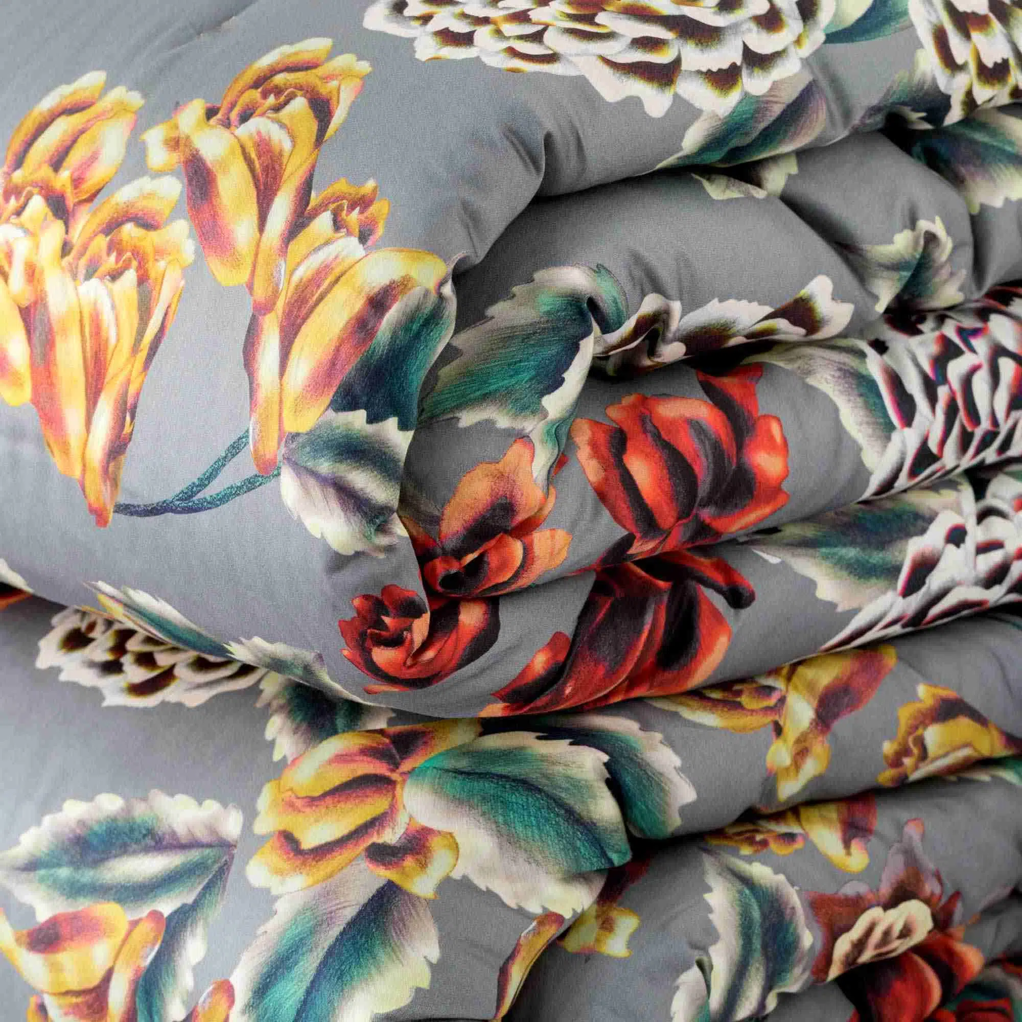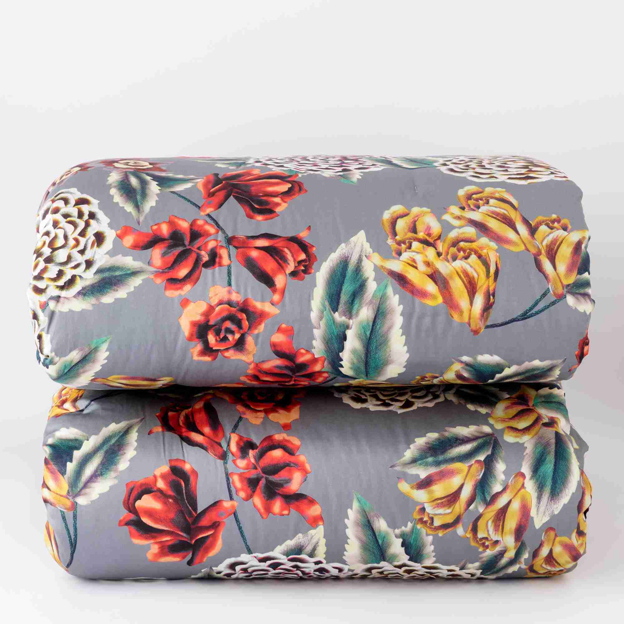 Trapunta in tessuto Fronte in raso di cotone 280 fili con stampa digitale, Tessuto Retro in cotone 100% tinta unita, Imbottitura 100% poliestere 300 gr/m2, trapuntatura piazzata a jumping, angoli a trapezio, chiusura ribattuta.