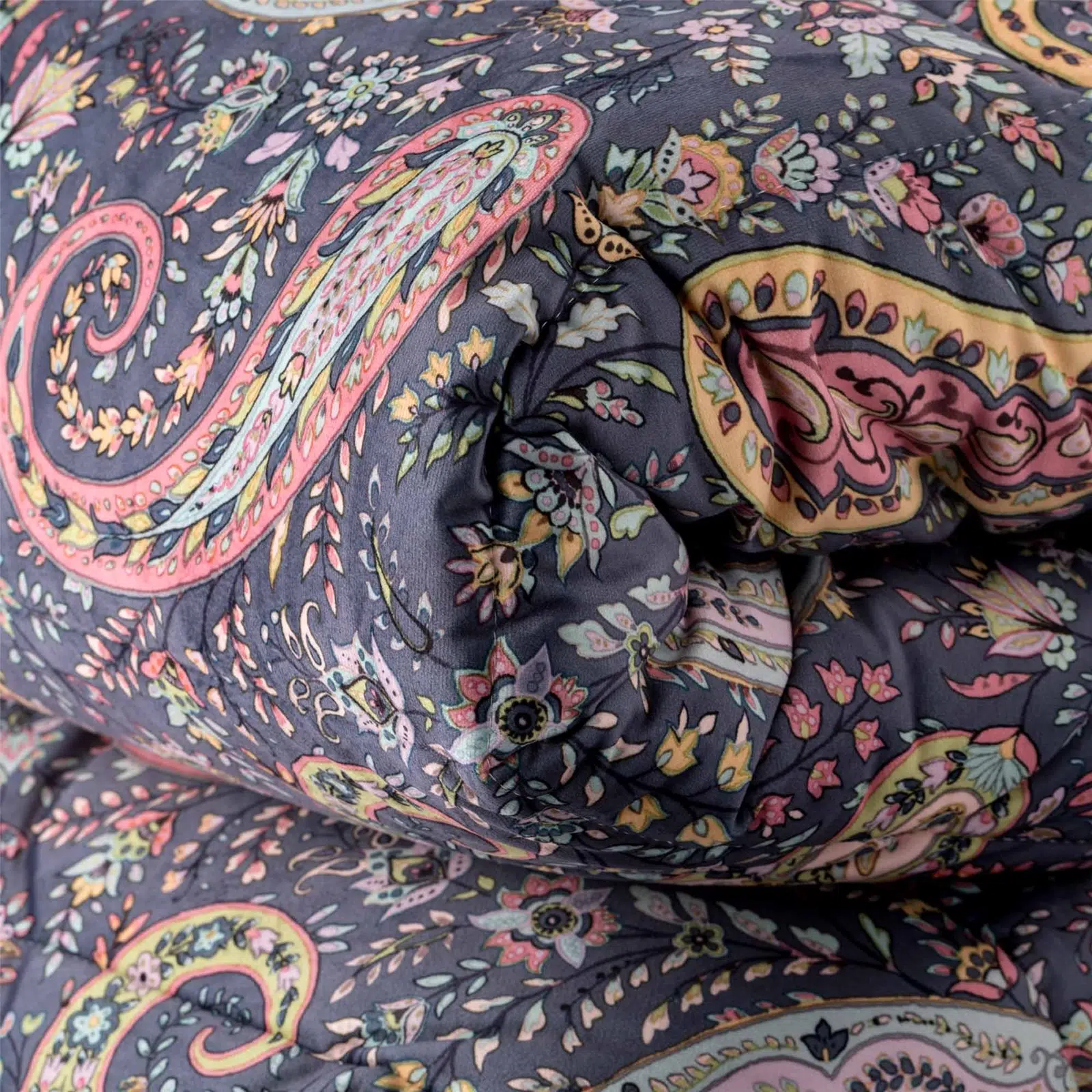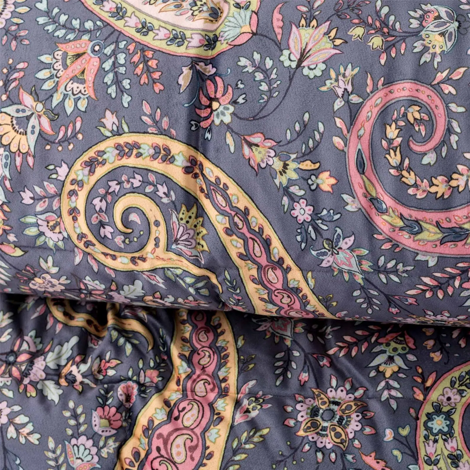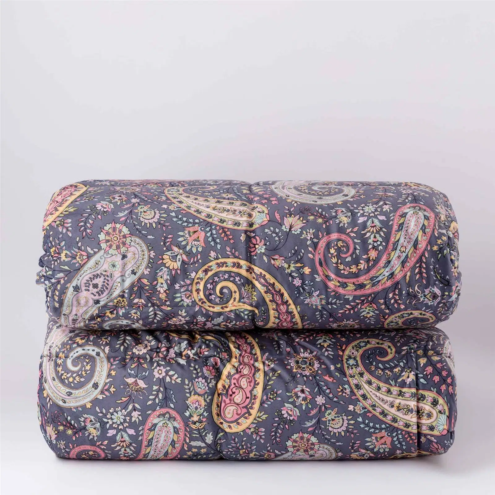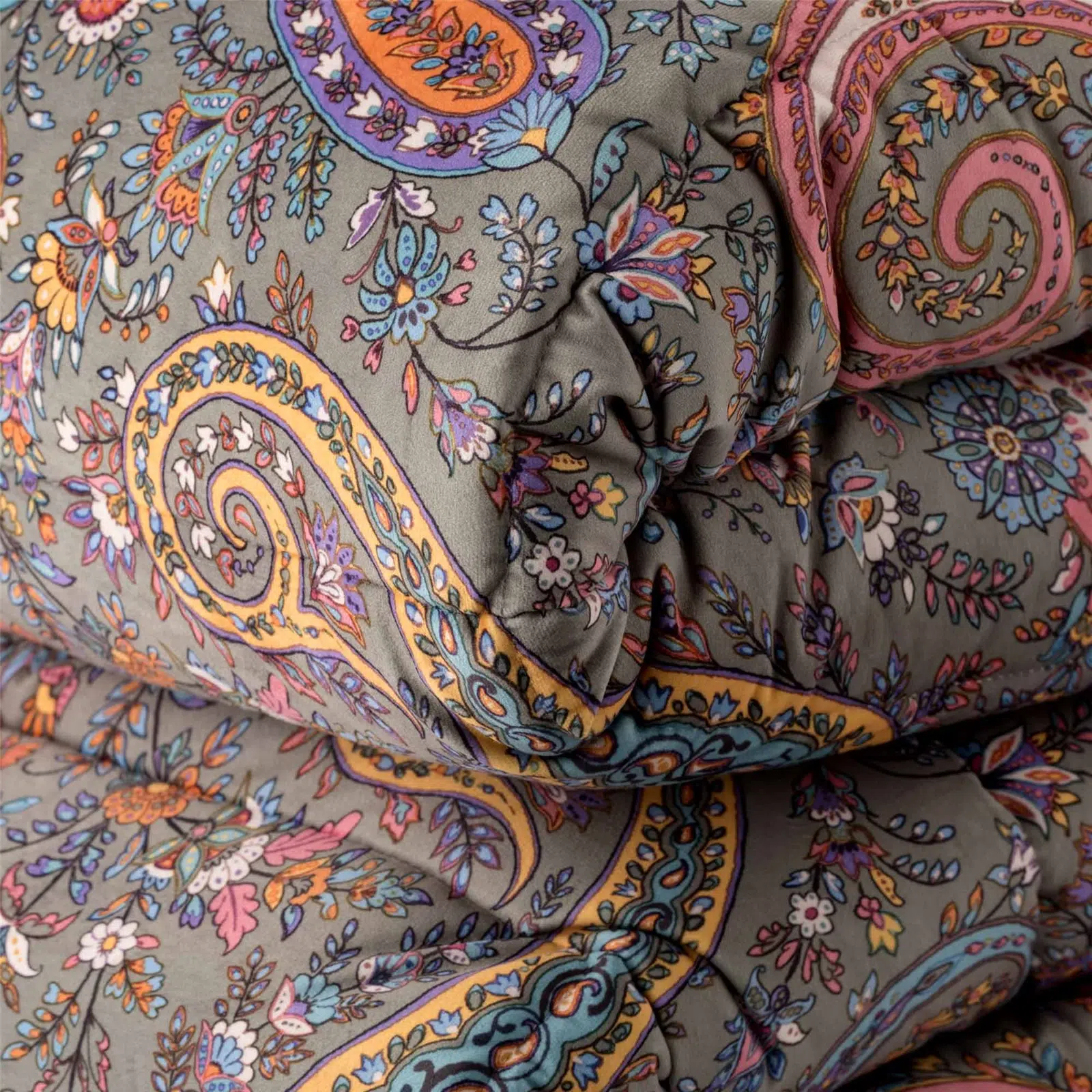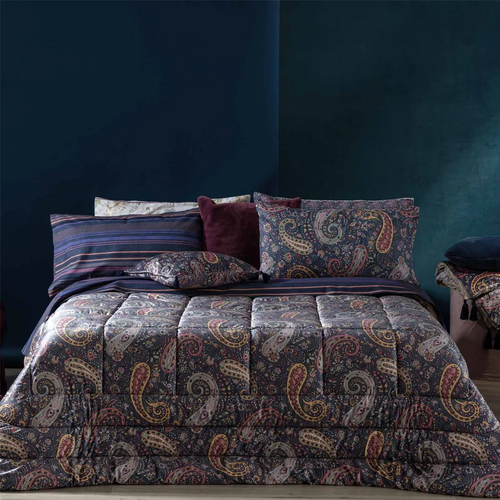 Il tradizionale disegno decorativo a goccia si arricchisce di preziosi dettagli declinati nei tre toni dell’indaco, del verde oliva e del caldo ocra. L’intreccio di foglie stilizzate e decori ornamentali si stende sul morbido e caldo velluto, aggiungendo ricchezza e pregio alla nobiltà intrinseca del tessuto invernale per eccellenza. La trapuntatura ha un’imbottitura di 350gr 100% poliestere, fronte in velluto e retro in 100% cotone.