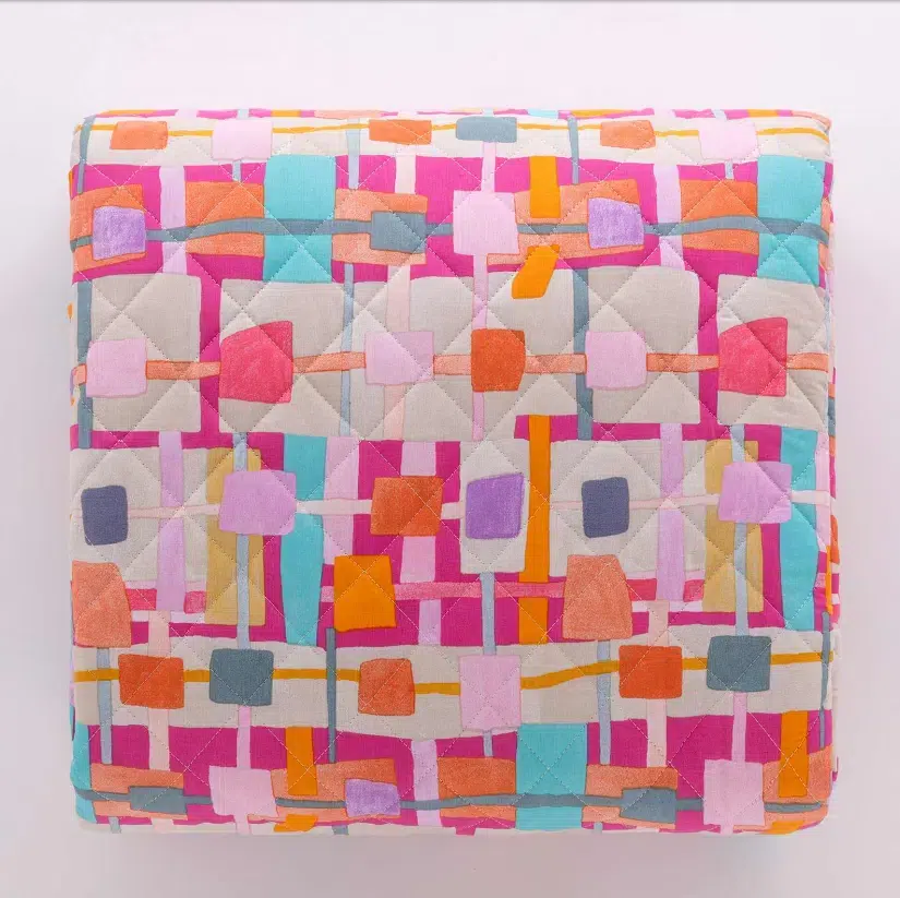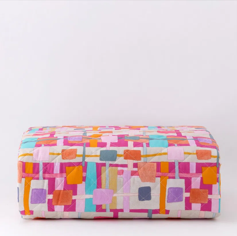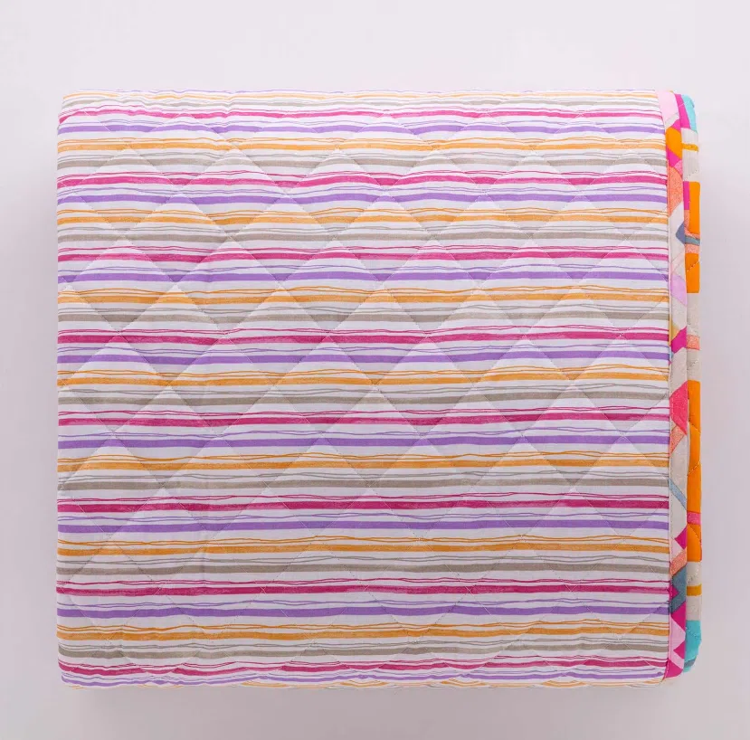 Trapuntino Domino double face, da un lato con motivo geometrico e dall’altro stampa a righe. Trapuntatura a quadro 5×5, chiusura ad angoli tondi e finitura con bordino da 1 cm. Tessuto esterno in 100% cotone, imbottitura siliconata 100% poliestere di 120gr.
