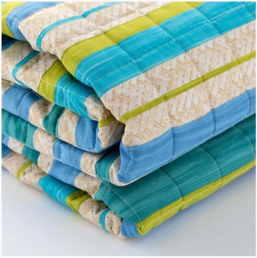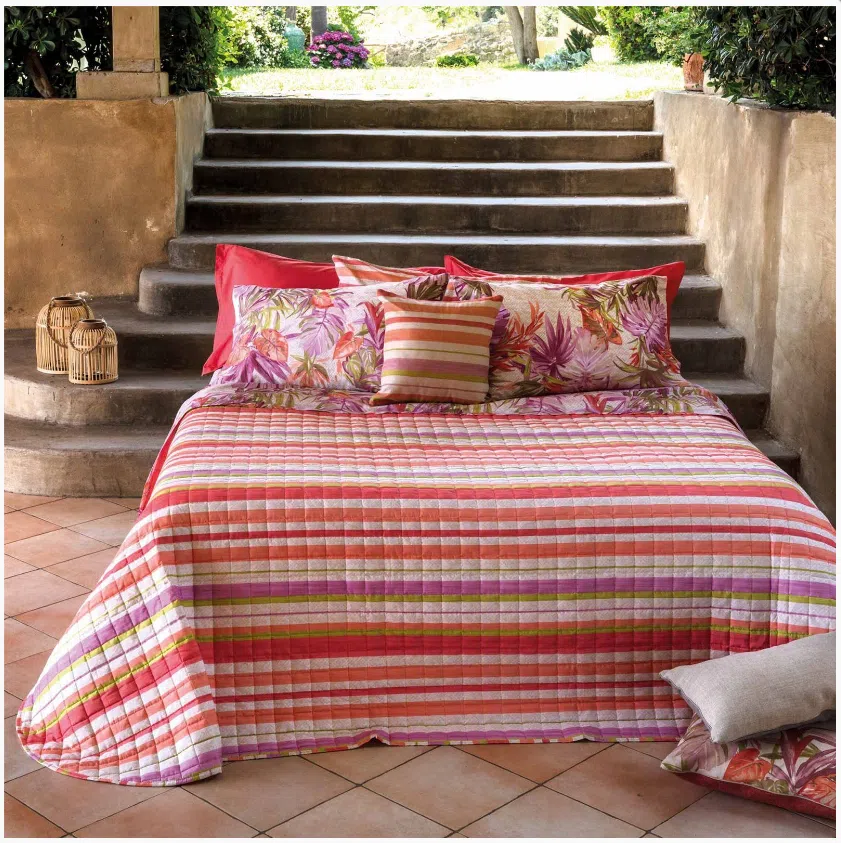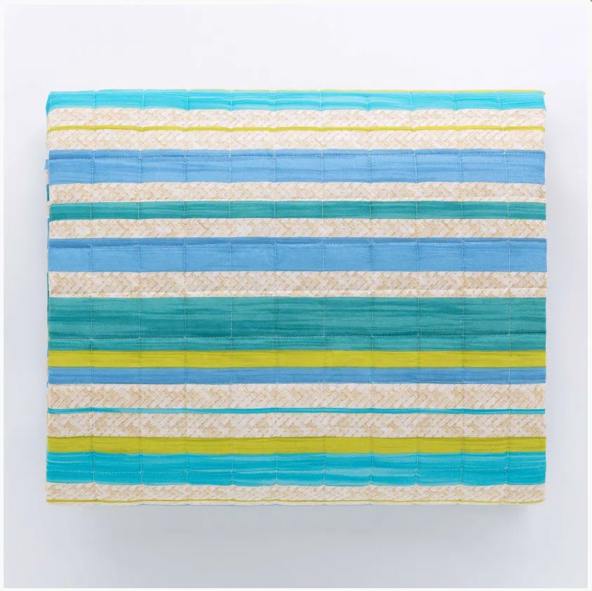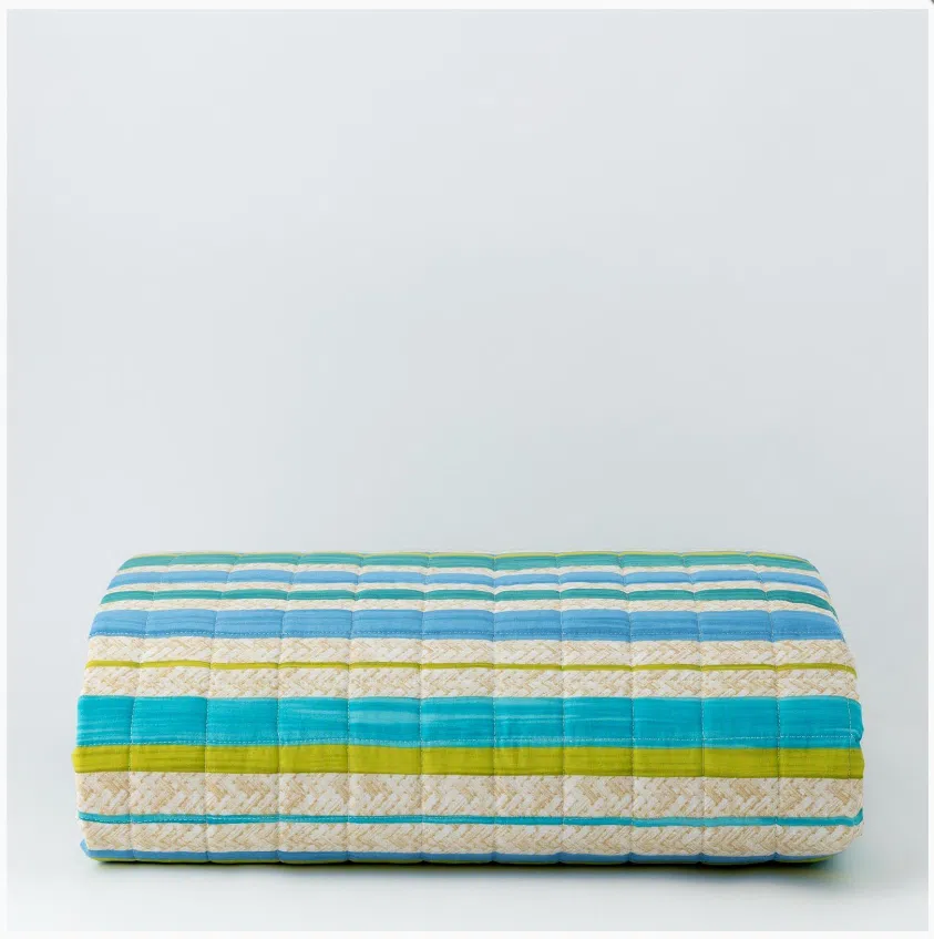 Il trapuntino Maui è in tessuto 100% cotone con stampa digitale e trapuntatura a quadri di 5x5cm, chiusura con angoli tondi e finitura con bordino di 1cm. L’imbottitura è in 100% poliestere siliconata di 100gr.mq.