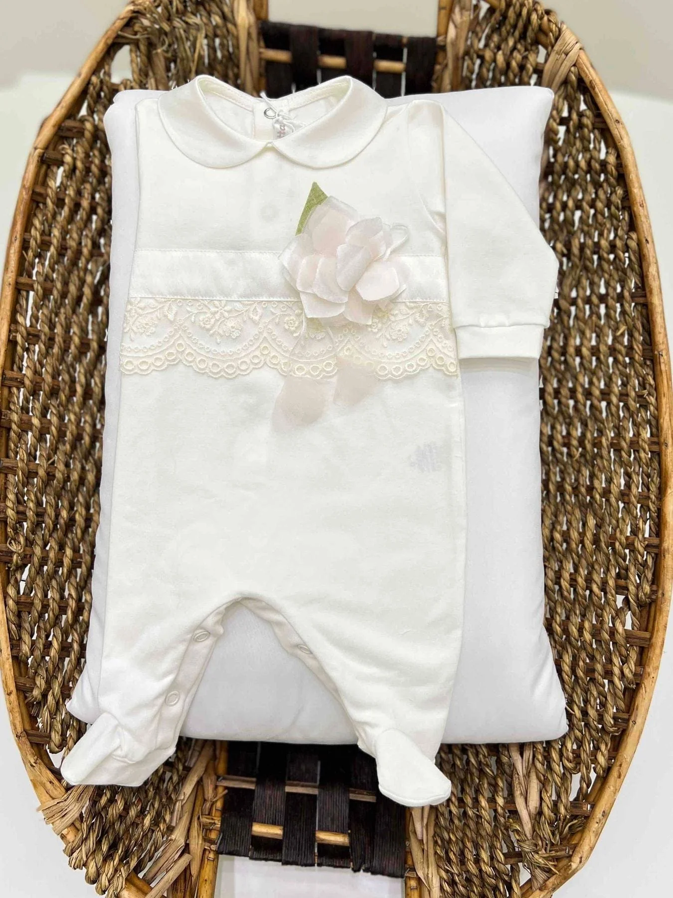 Tutina neonata intera in cotone cin fascia in vita in pizzo con dettaglio floreale.