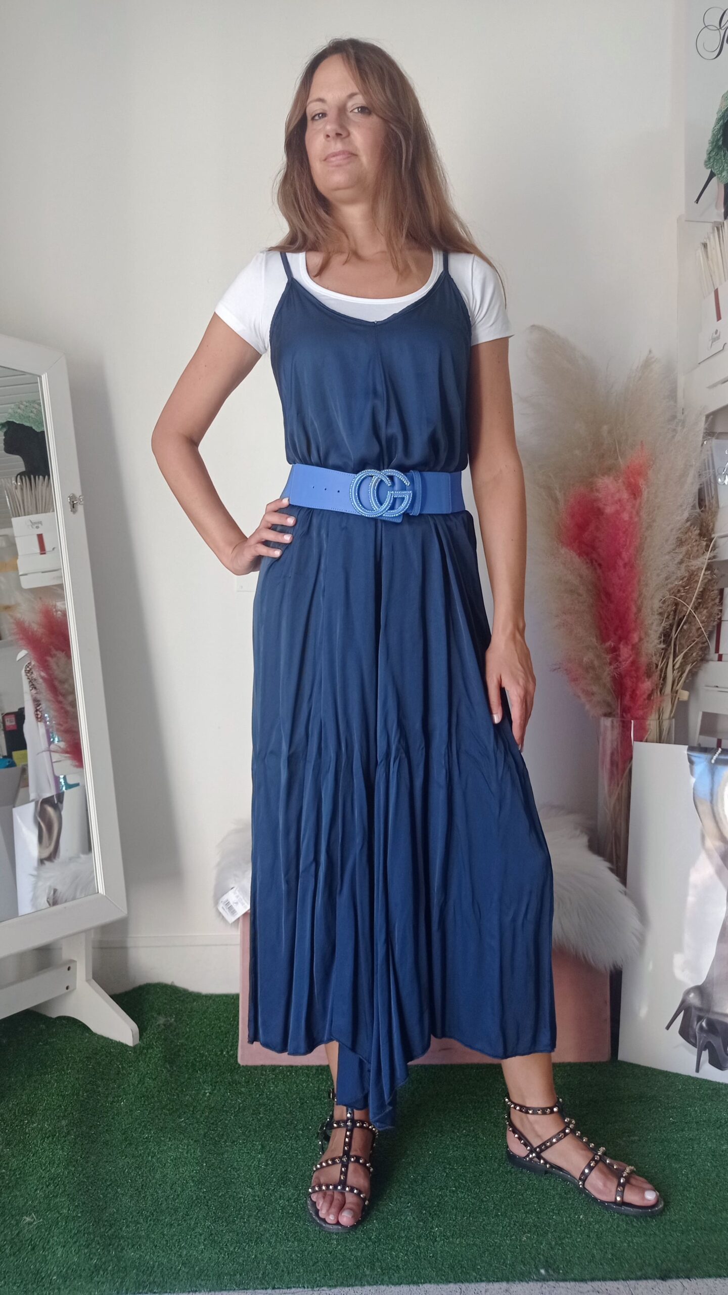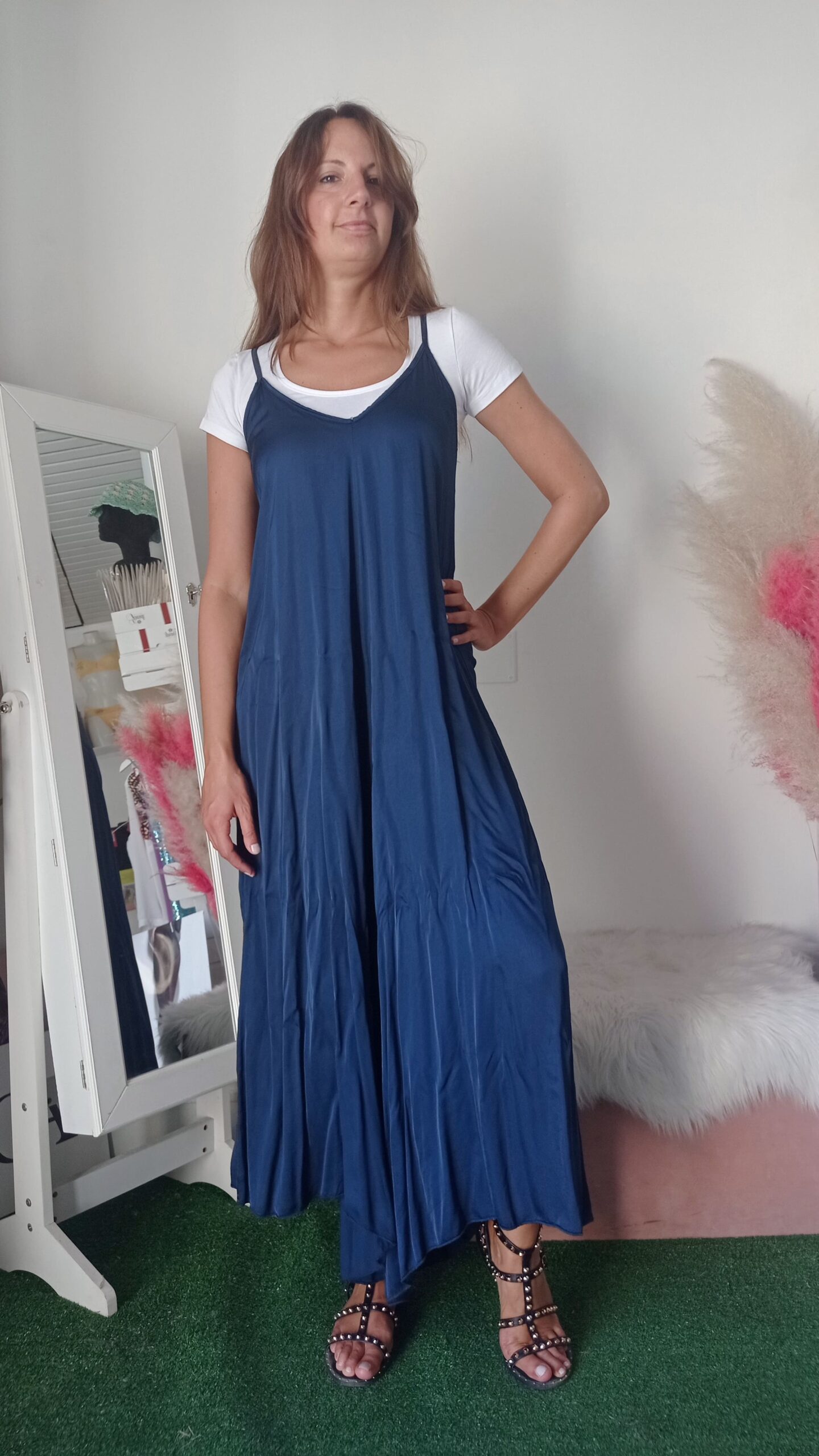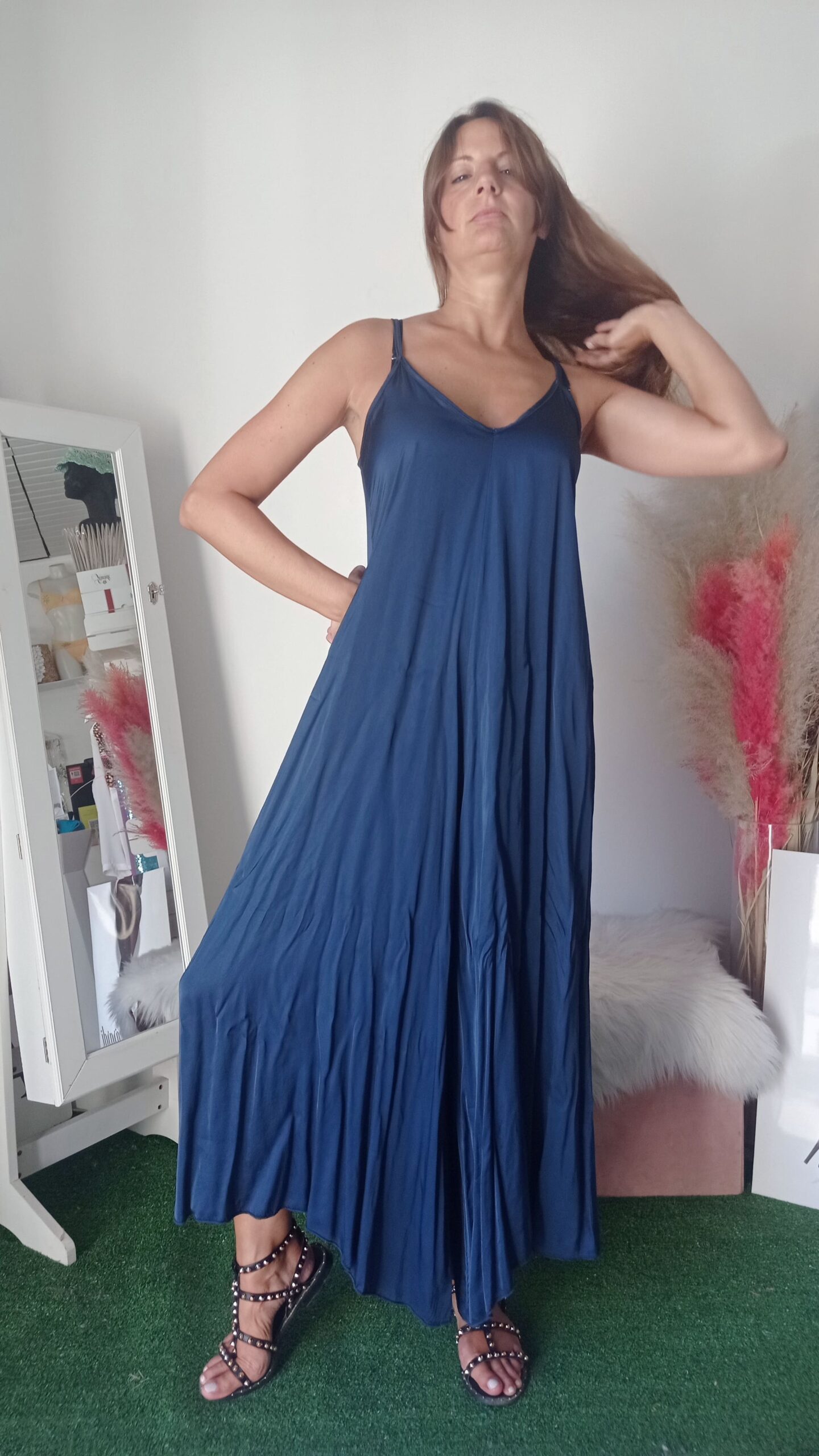 Eleva il tuo stile con la nostra maxi tuta realizzata in morbida viscosa. Questa tuta fluida e leggera è perfetta per ogni occasione, combinando comfort e raffinatezza. Disponibile nei colori blu intenso e oro luminoso, si adatta perfettamente alle taglie S, M e L. Il design ampio e il tessuto traspirante offrono una vestibilità confortevole, mantenendo una silhouette elegante e sofisticata. Ideale per essere abbinata sia a sandali bassi per un look casual che a tacchi alti per un’occasione speciale.